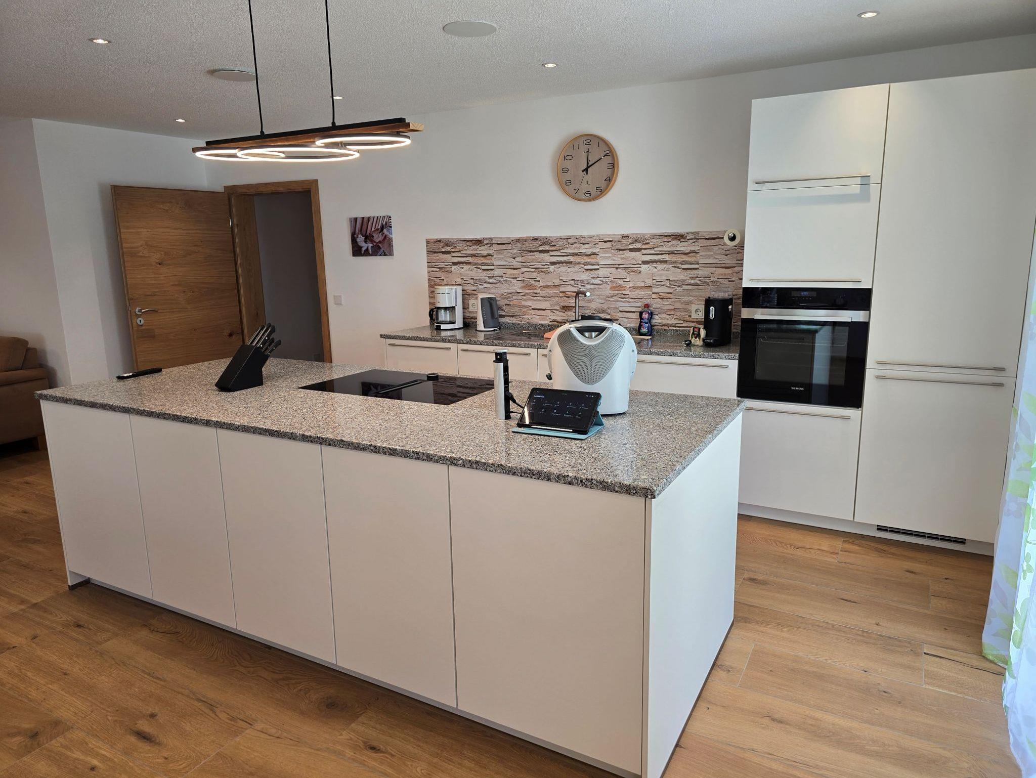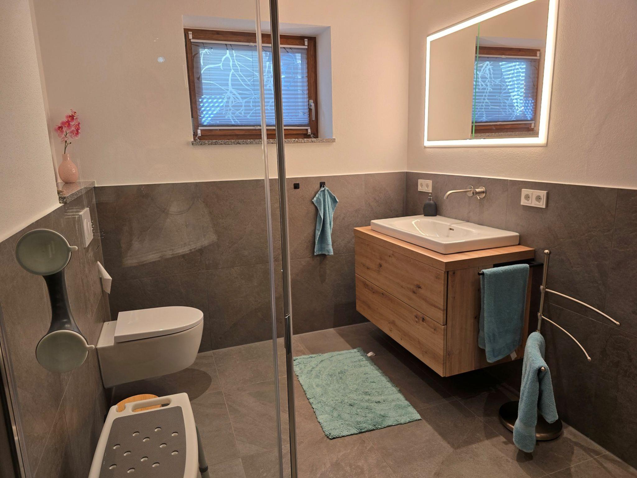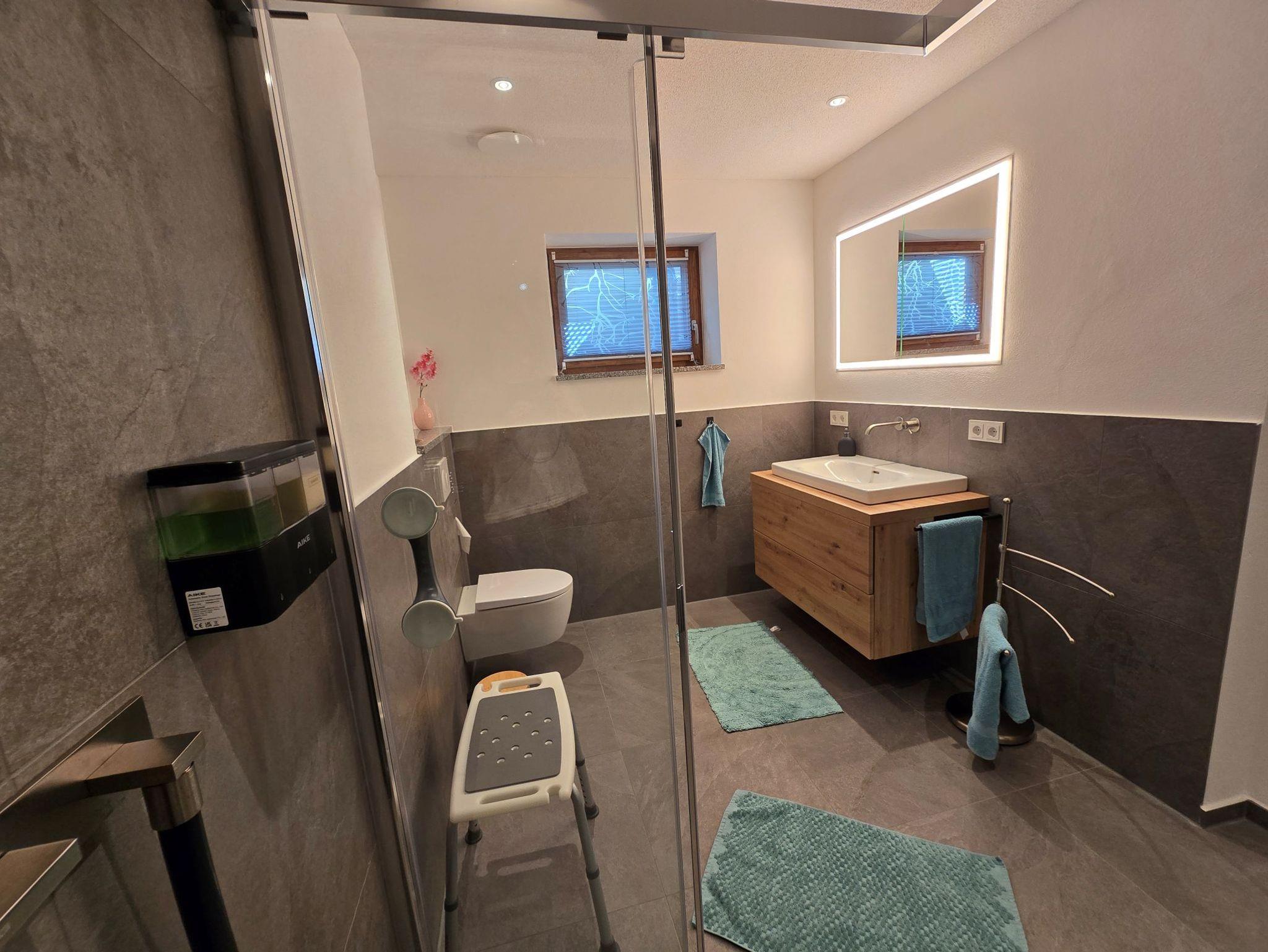 Das Bad verfügt über eine Regendusche sowie eine Infrarot-Sonnendusche zum Aufwärmen. Ein separates WC sorgt für zusätzlichen Komfort. Technisch ist die Wohnung bestens ausgestattet: Smart-Home-System (Loxone), zentrale Lüftungsanlage mit Wärmerückgewinnung und Pollenfilter, Farbbeleuchtung, Lautsprechersystem, kostenlosen highspeed WLAN, extragroßen Smart-TV – alles vorhanden, um den Aufenthalt angenehm zu gestalten.
