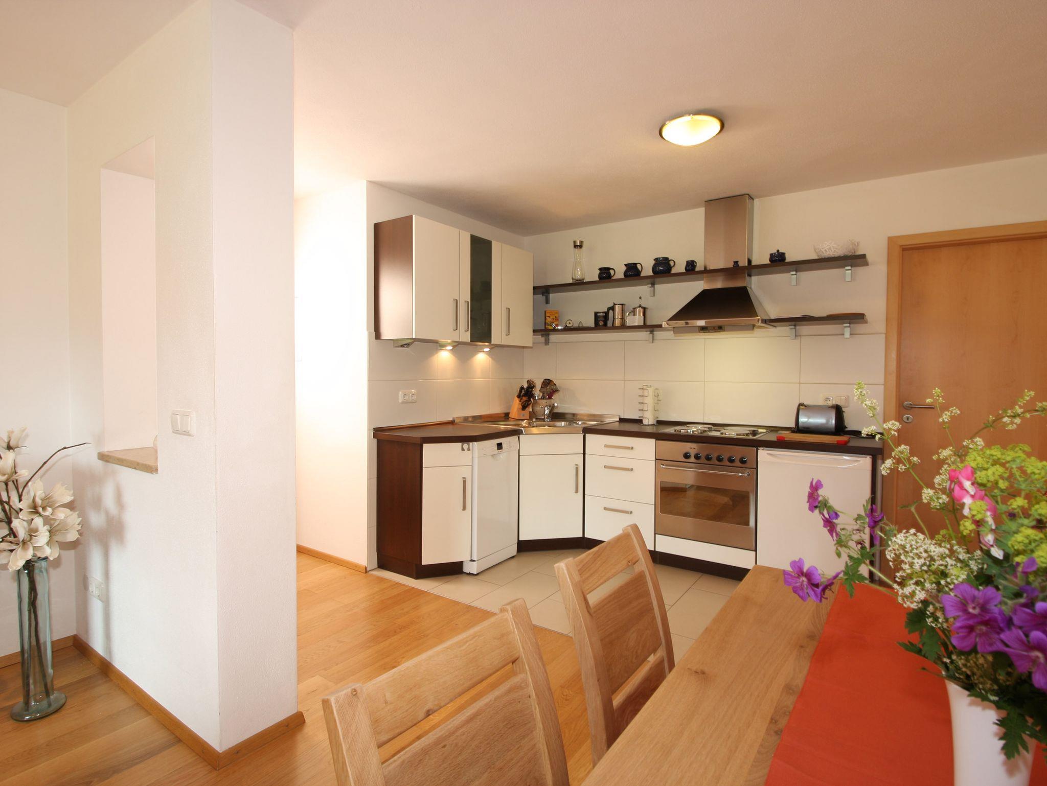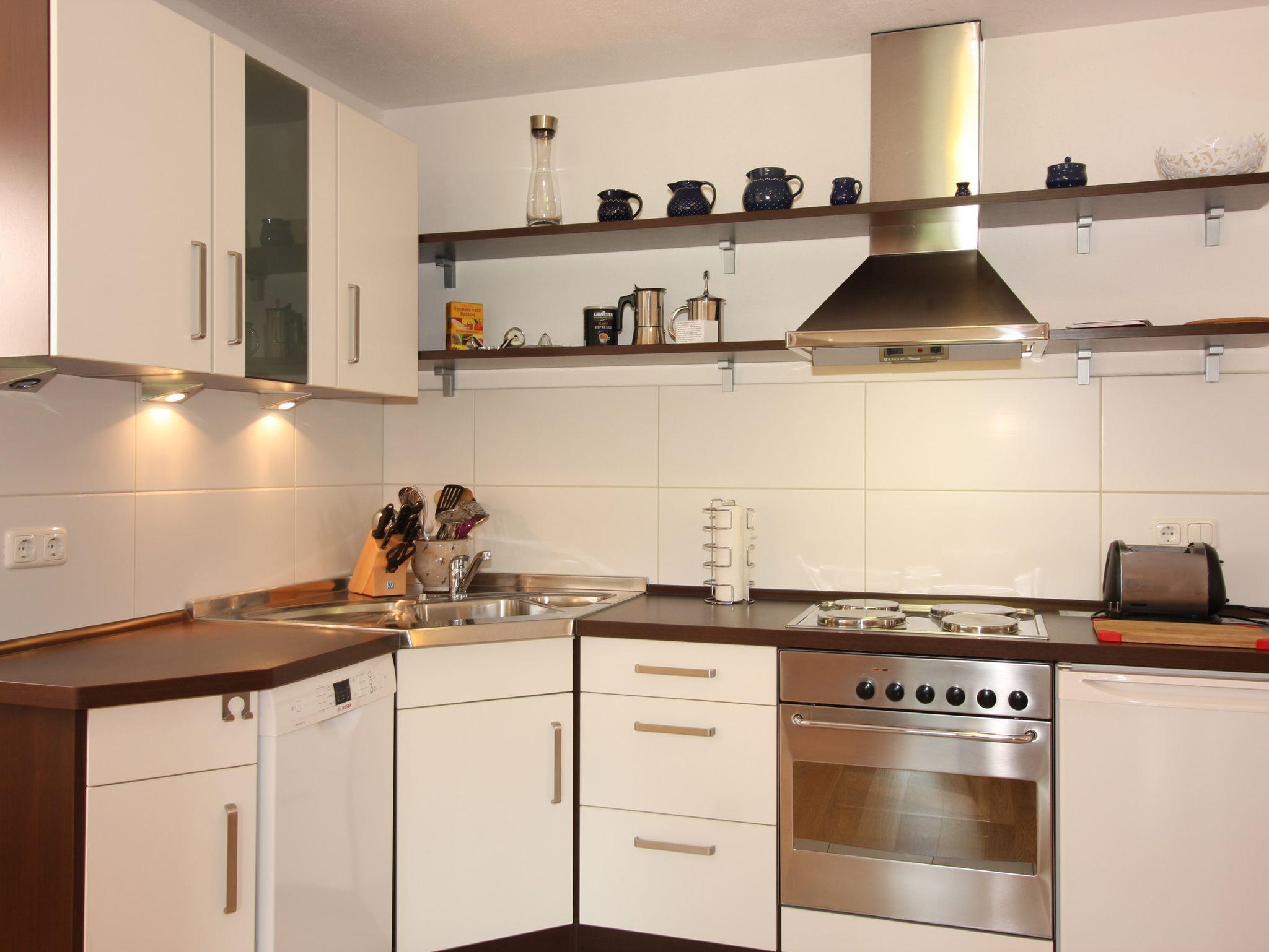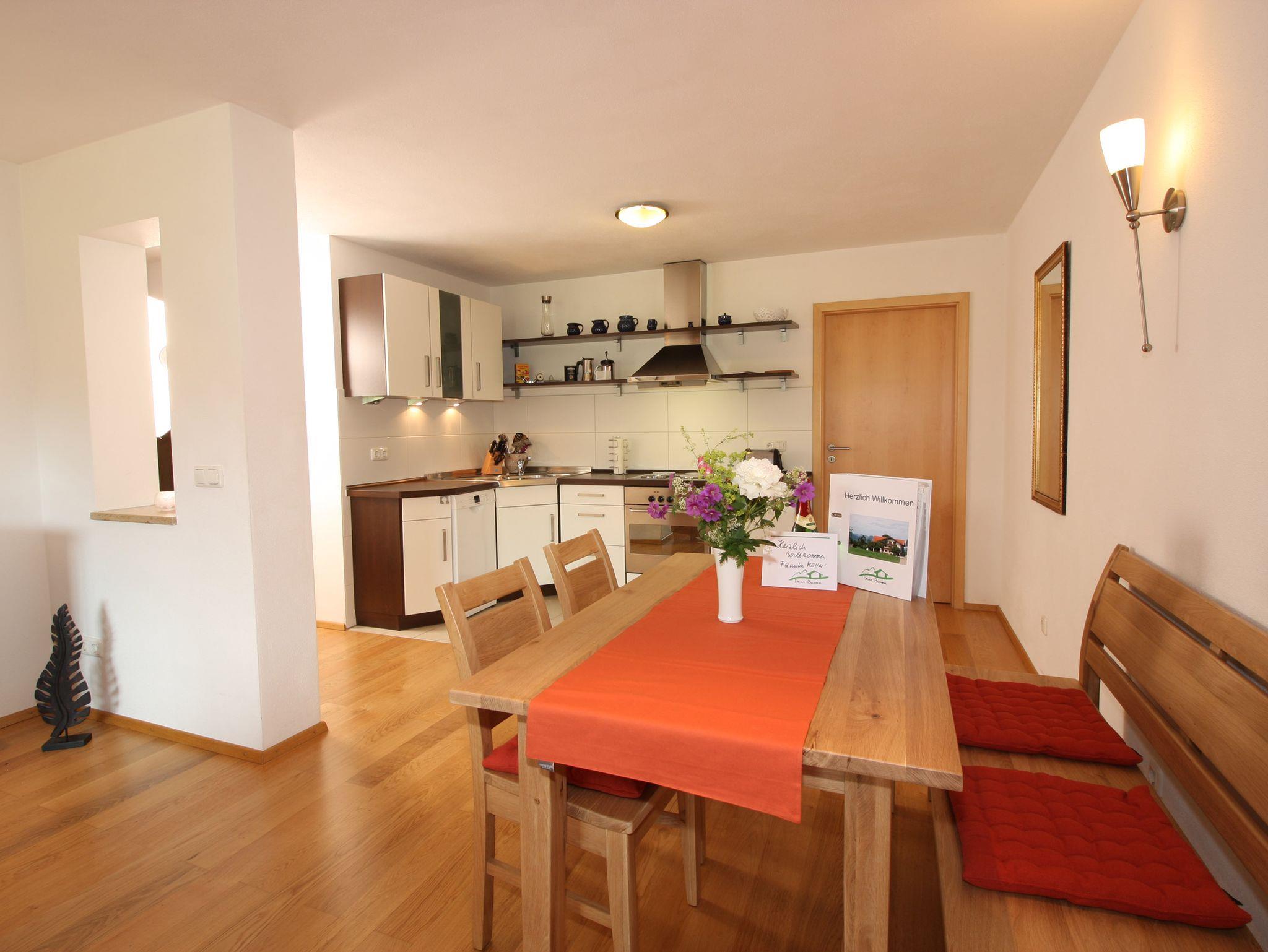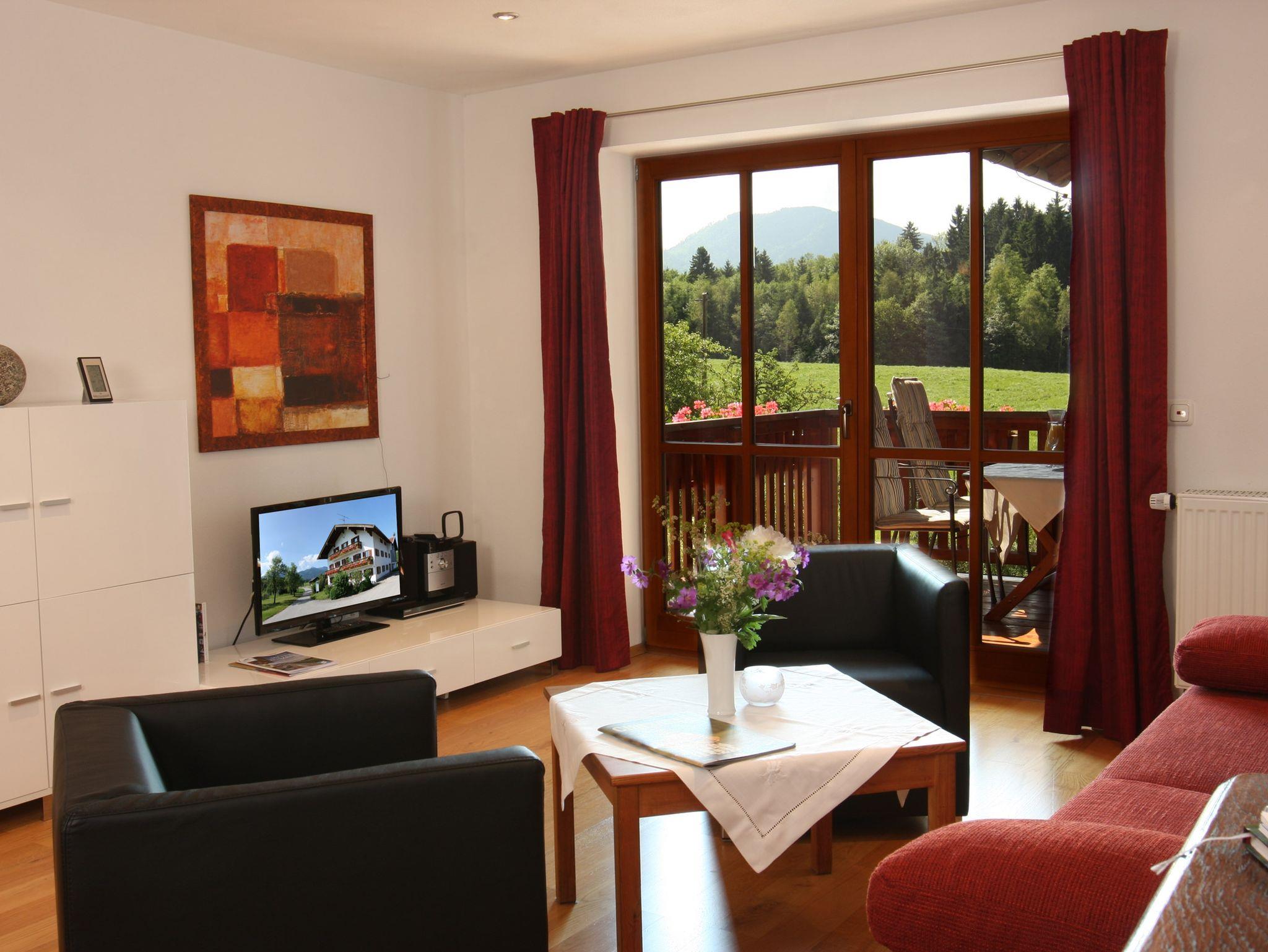 In der großzügigen und modern eingerichteten Wohnung finden Sie alles, was Ihnen einen erholsamen und erlebnisreichen Tag im Chiemgau verschönt: Eine moderne, voll ausgestattete Einbauküche mit Spülmaschine, ein großer überdachter Balkon mit Berglick, ein Schlafzimmer und ein Wohnraum mit gemütlicher Sitzecke und Ausziehcouch (1,60 x 2,00 m). Sogar vom Sofa aus haben Sie über das große Panoramafenster einen herrlichen Ausblick in die Berge. Der runde Esstisch lädt Sie nach der Mahlzeit zu einem Spielchen ein. Nach einem schönen Wintertag können Sie sich auf eine gemütliche und gut geheizte Wohnung freuen.