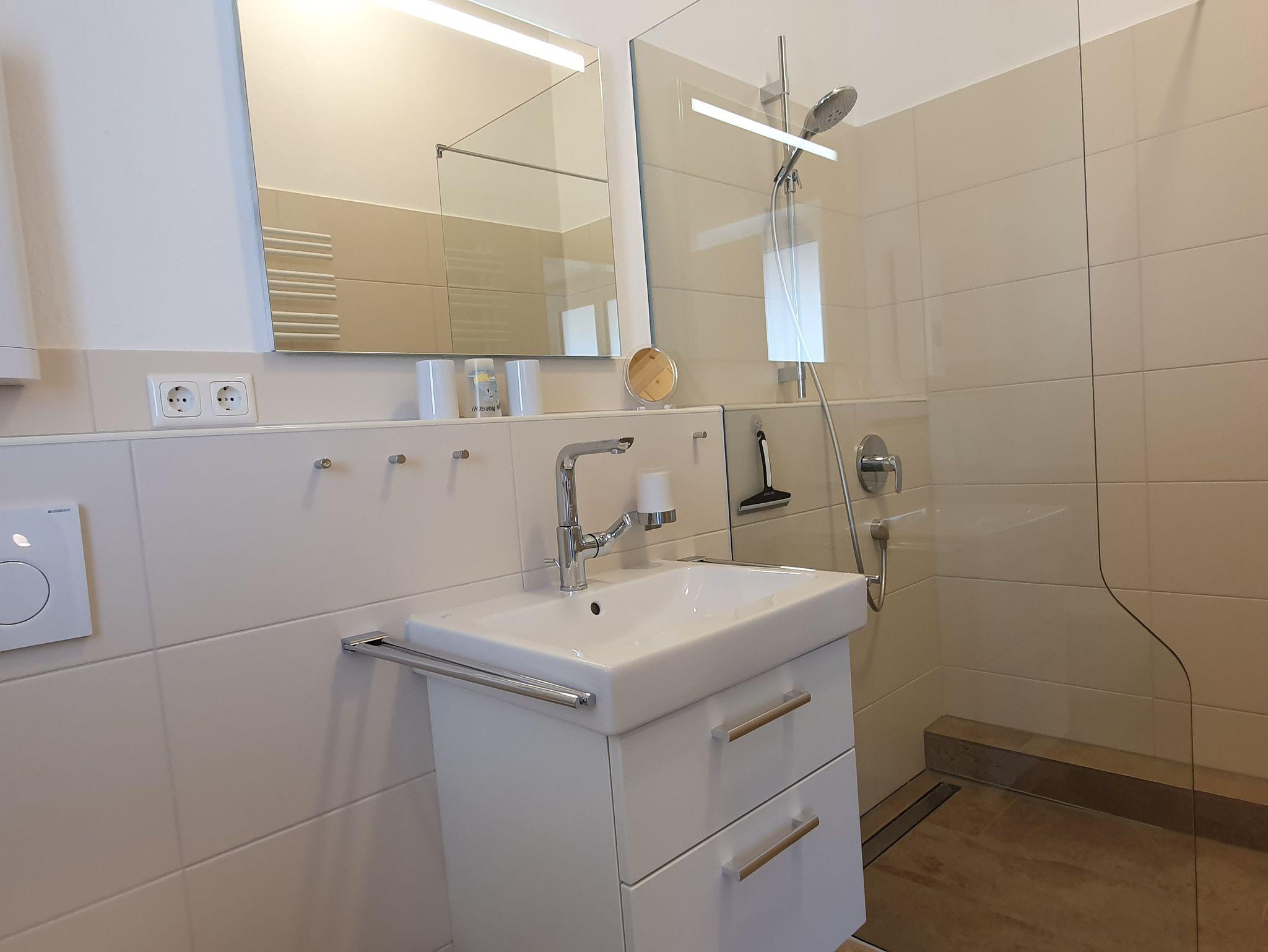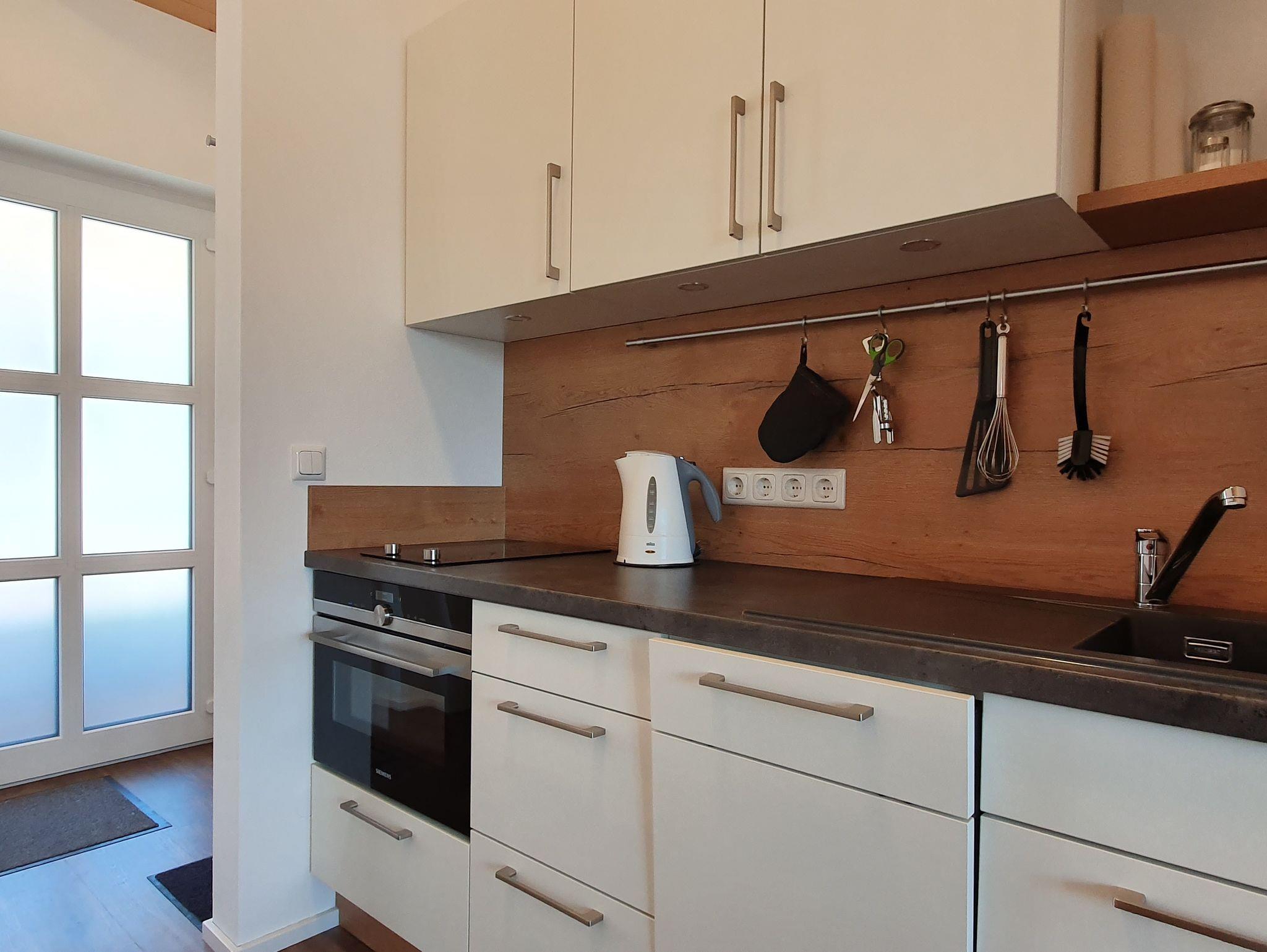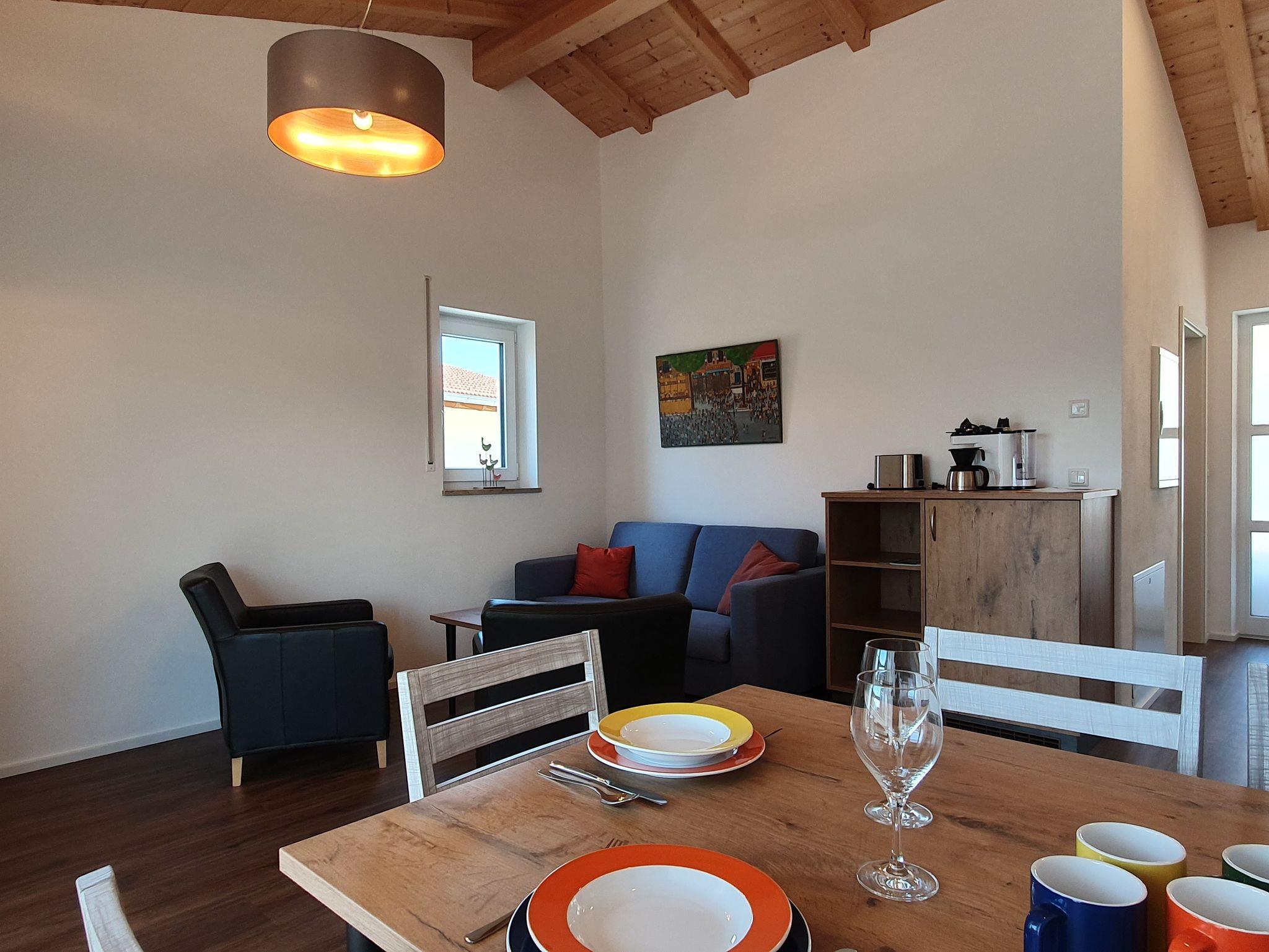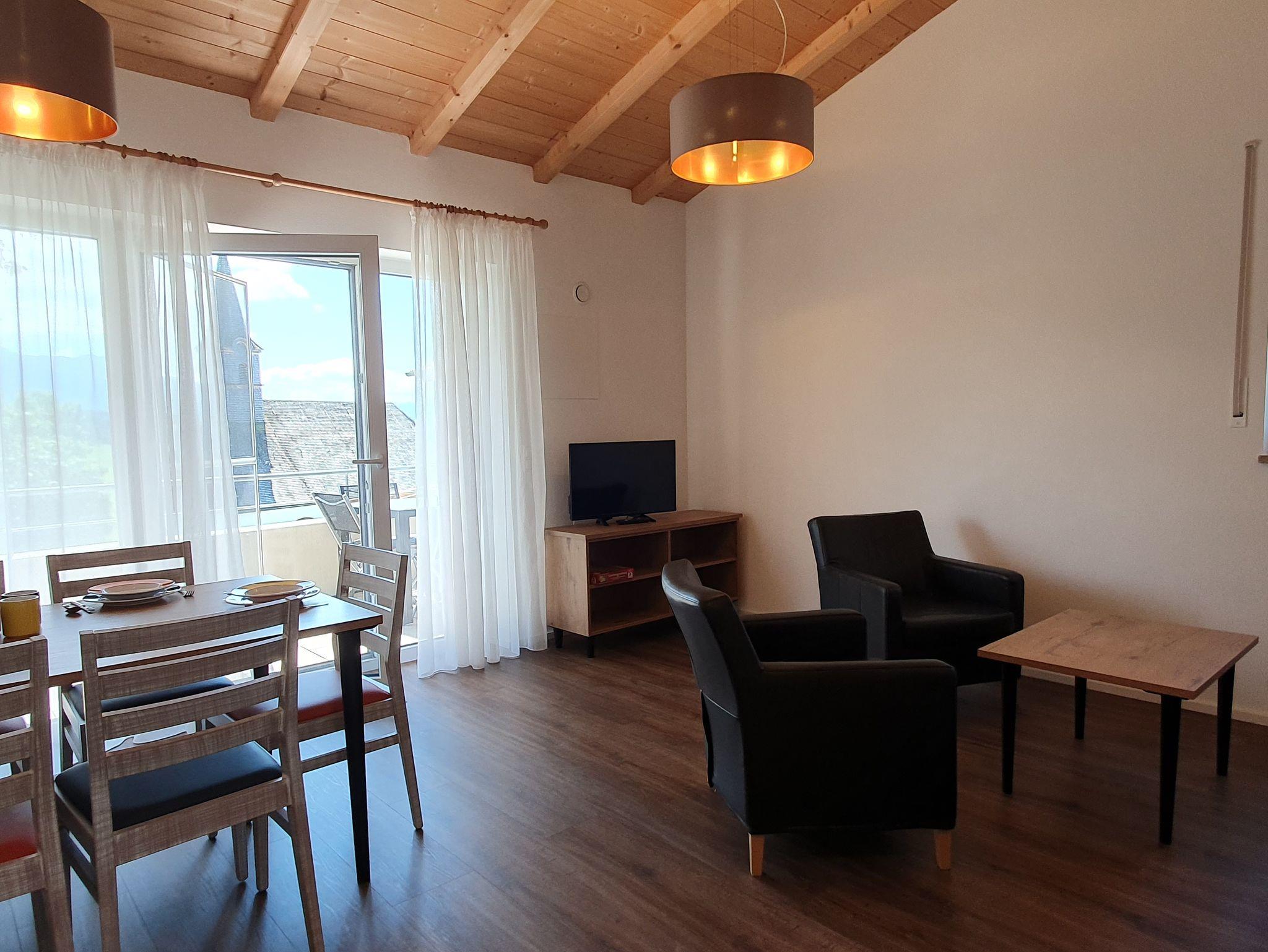 Unsere Ferienwohnung befindet sich in einem 2018 neuerbauten Haus. Sie ist komplett mit Fußbodenheizung ausgestattet, Fenster und Terrassentüre verfügen über Außenrollos sowie Mückenschutz. Sie bietet Platz für 3-4 Personen, Kinderbett sowie Hochstuhl kann zur Verfügung gestellt werden. Insgesamt ist sie 48 qm groß, mit großem Wohnraum (Ausziehcouch), Schlafzimmer mit Doppelbett sowie einem kleineren Zimmer mit Stockbett. Im Wohnraum befindet sich eine modern ausgestattete Küchenzeile mit Geschirrspüler, Backofen bzw. Mikrowelle, Herd mit zwei Platten, Kühlschrank mit Gefrierfach, Kaffeemaschine, Toaster, Wasserkocher, Geschirrtücher. Das Bad hat Tageslicht. Selbstverständlich sind Bettwäsche und Handtücher im Preis inbegriffen. Fernseher, kostenfreies W-Lan, Carport. Die Wohnung hat einen Balkon mit wunderbarem Bergblick mit Sitzecke.