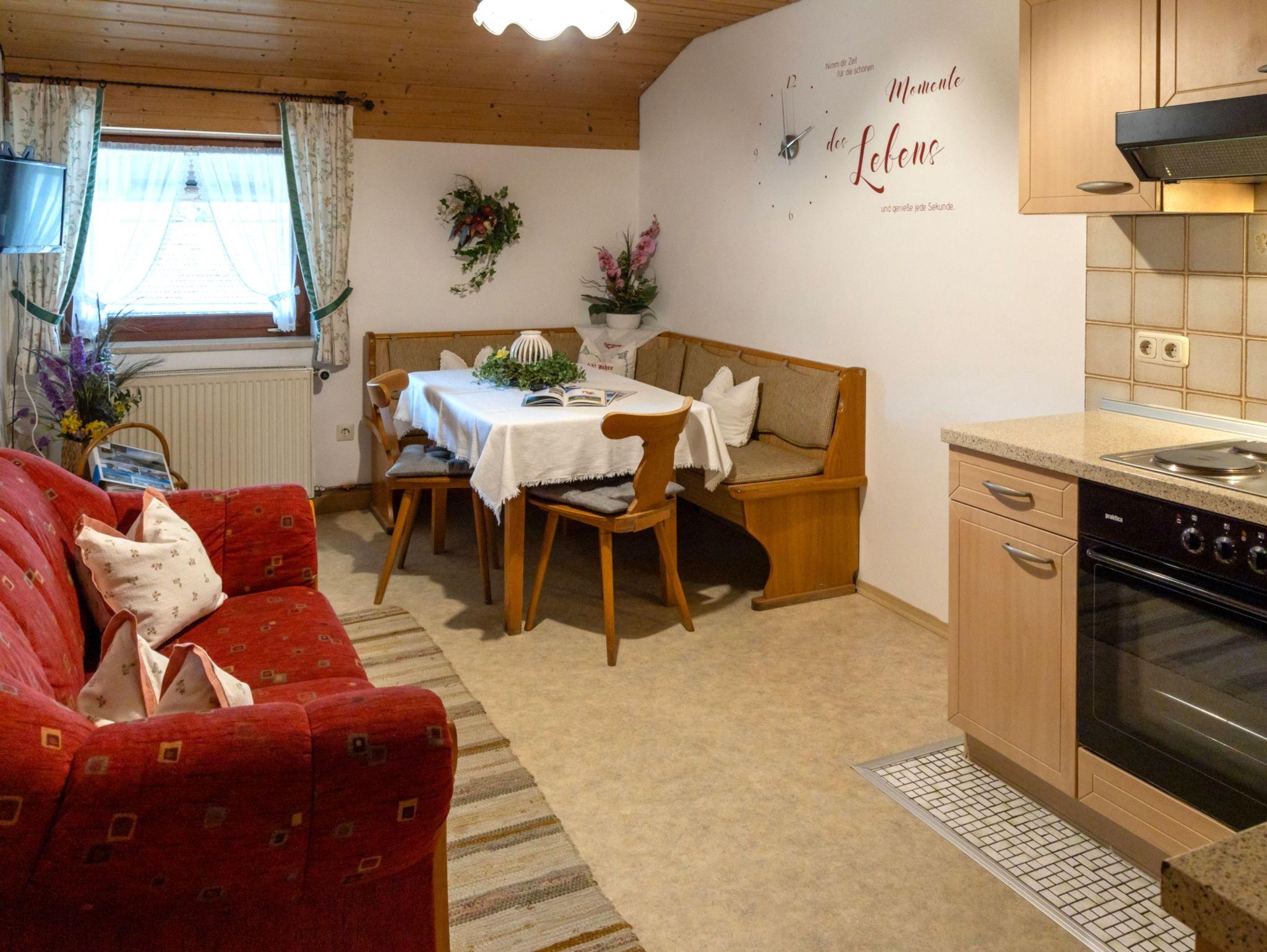 Die Ferienwohnung Wiesenblick (50 qm) für 2-5 Personen verfügt ebenfalls über zwei gemütliche Schlafzimmer, Dusche und WC, eine geräumige Wohnküche sowie einen Balkon. Bettwäsche und Handtücher inklusive. Die Ferienwohnungen Bergblick & Wiesenblick sind keine abgeschlossenen Wohnungen, sondern haben einen gemeinsamen Flur. Haustiere sind in der Wohneinheit nicht gestattet. Die Küche in Fewo Wiesenblick sowie die Küchenzeile in Fewo Bergblick sind komplett ausgestattet: Kaffeemaschine, Wasserkocher, Toaster, Töpfe, Geschirr, Teller, Besteck... alles was man zum Kochen und Essen benötigt.