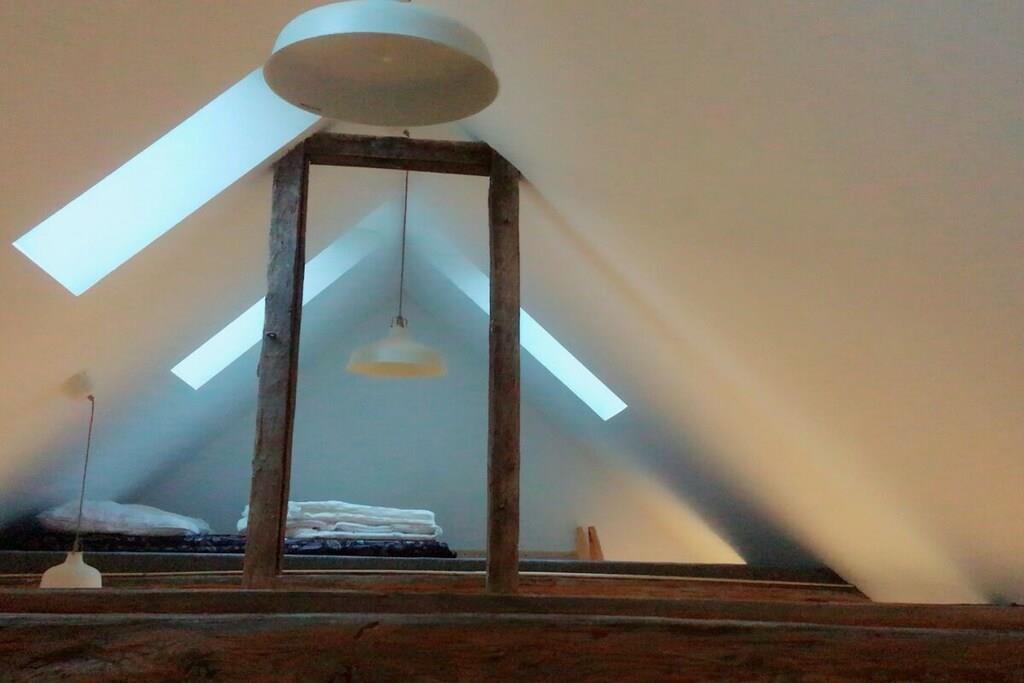 Zur Ferienwohnung geht es direkt aus dem gemeinsam genutzten Eingangsbereich nach oben in den naturbelassenen Dachboden. Durch die Eingangstür der Ferienwohnung betritt man direkt die offene Küche und den Essbereich. Im hinteren Bereich befindet sich ein Sofa sowie ein Einzel- und ein Doppelbett. Über eine Leiter gelangt man in den offenen Spitzboden mit weiteren Schlafmöglichkeiten. Ein Babybett und Kinderhochstuhl können zur Verfügung gestellt werden. Die Ferienwohnung ergänzt sich gut zu unserer zweiten gegenüberliegenden FeWo für Großeltern und oder für befreundete Familien. Achtung: Auch wenn mehr Schlafmöglichkeiten zur Verfügung stehen, kann unsere Kläranlage nur 4 Personen inkl. Kinder tolerieren. Wir bitten um vorherige Kontaktaufnahme bei mehr als vier Personen. Sommerstorf liegt nur zehn Autominuten von Waren an der Müritz und nur wenige Autominuten von vielen wunderschönem Badeseen entfernt im schönen Mecklenburgischen Land.