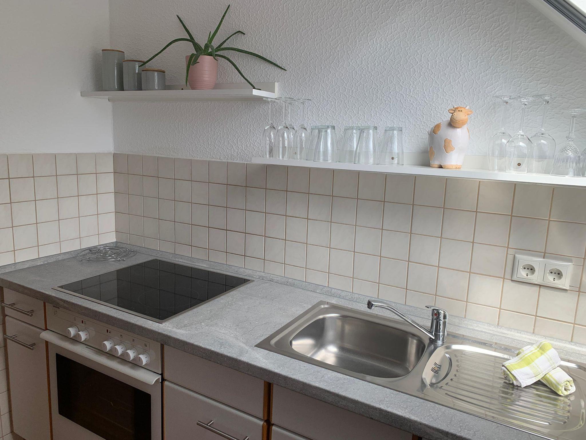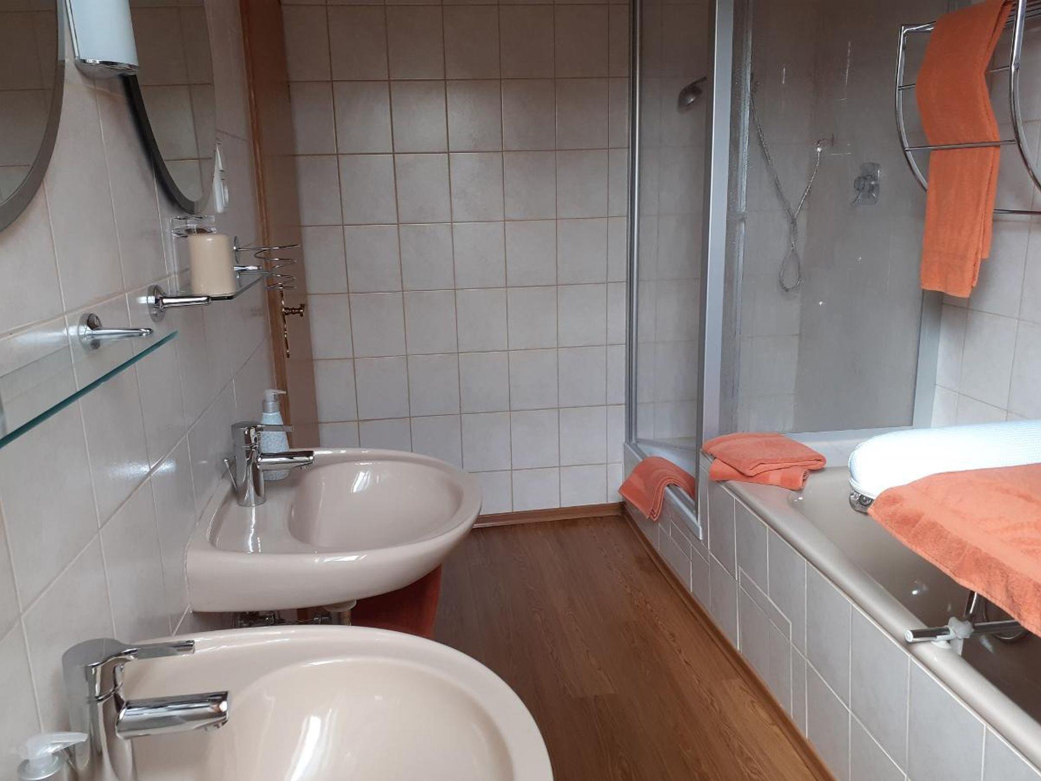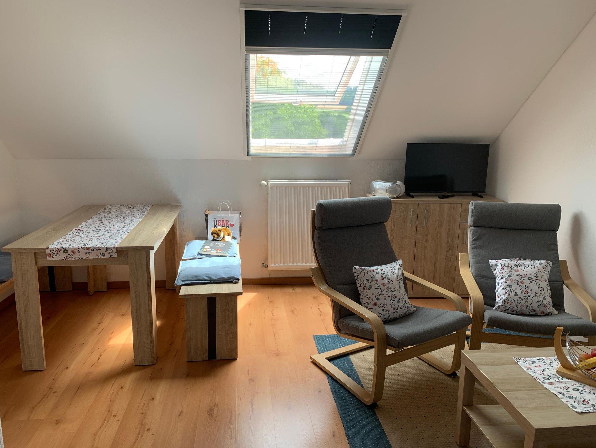 So richtig gemütlich ist unsere Mansardenwohnung im Bauernhaus. Sie ist geeignet für bis zu 4 Personen (ca. 65 qm) und ist mit 2 Schlafzimmern (Elternschlafzimmer mit Doppelbett, Kinderzimmer mit Etagenbett , einem extra Wohnzimmer mit gemütlicher Couch, Kabel-TV und Essecke; einer voll ausgestatteten Küche und einem großen Bad mit Badewanne, Dusche und 2 Waschbecken; sowie einem extra WC ausgestattet. Kostenloses WLAN, ein separater Eingang und ein gemütlicher Freisitz mit Gartenmöbeln gehören ebenfalls dazu. Eigener Eingang, sowie große überdachte Gemeinschaftsterrasse.