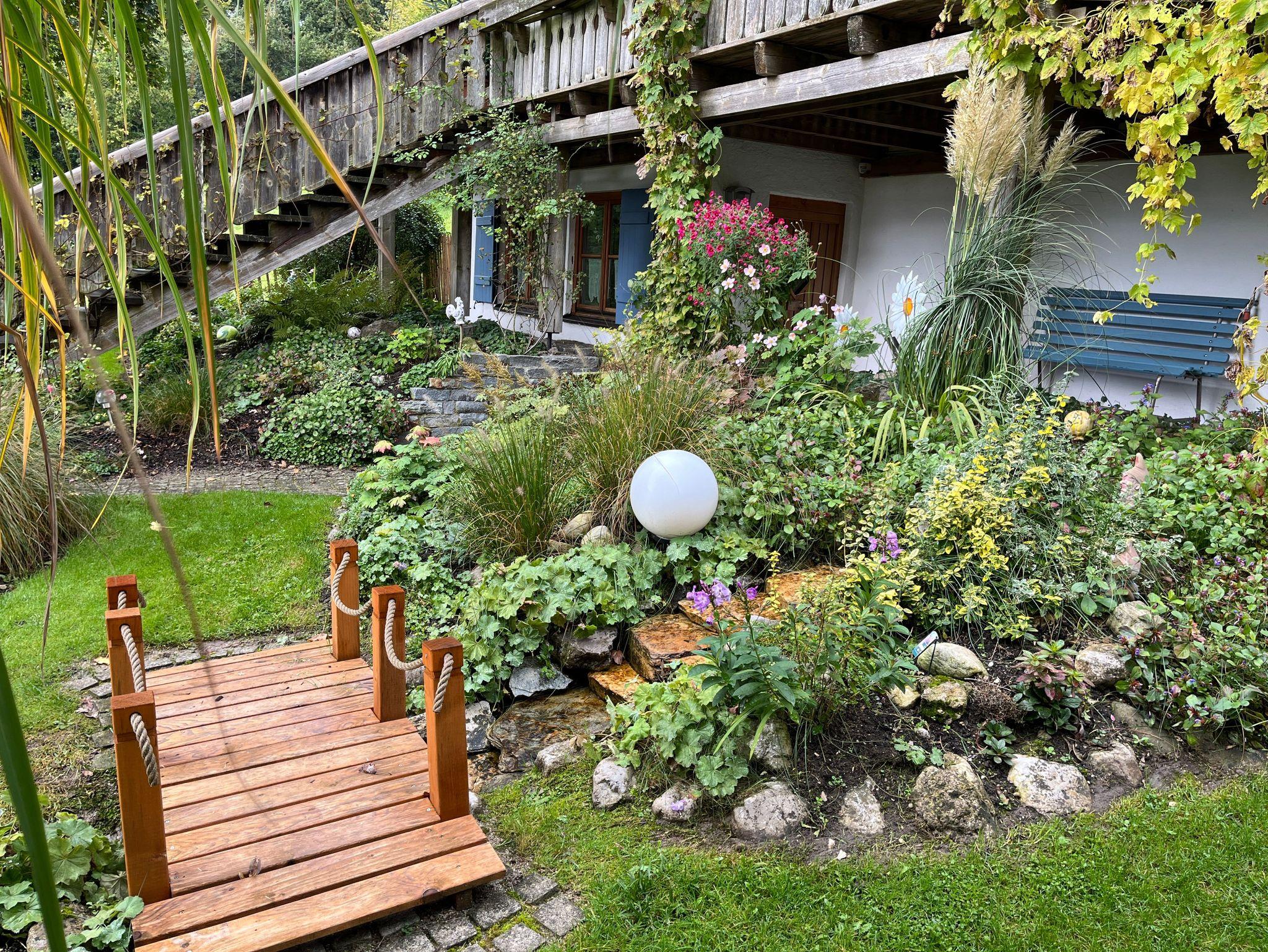 Das 45qm große geräumige Ferienappartement liegt idyllisch am Ortsrand von Grafrath im Landkreis Fürstenfeldbruck und befindet sich in einem bayrischen Holzblockhaus. Rund um das Blockhaus mit seiner besonderen Atmosphäre erwartet Sie ein Gartenidyll mit Teich und grünen Oasen zwischen Blumen, Bäumen und hohen Gräsern. Von der Ferienwohnung haben Sie direkten Zugang zu diesem Bereich.