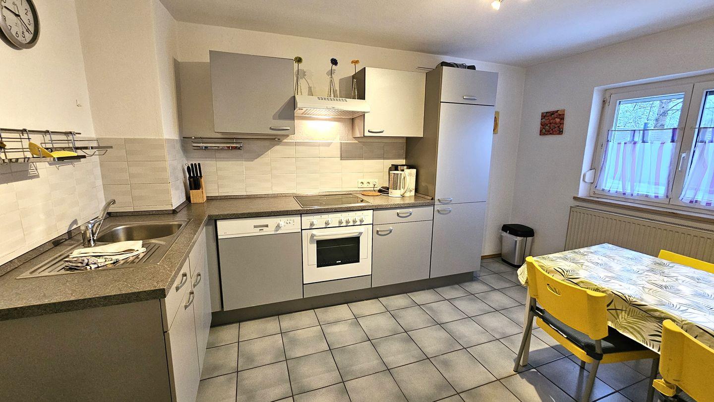 Die einladende Ferienwohnung besticht durch ein helles, gemütliches Wohnzimmer mit einer komfortablen Sofaecke, die zum Entspannen nach einem erlebnisreichen Tag einlädt. Hier können Sie die Zeit zusammen genießen, einen Film auf dem Satelliten-TV schauen oder einfach nur die Ruhe der ländlichen Umgebung auf sich wirken lassen. Der Essbereich mit einem Esstisch bietet genügend Platz für gemeinsame Mahlzeiten, die Sie in der voll ausgestatteten Küche zubereiten können. Diese verfügt über moderne Küchengeräte, darunter einen Ceran-Herd, einen Backofen, eine Spülmaschine und Kühlschrank. Eine zusätzliche Senseo Kaffeemaschine kann ereit gestekllt werden, bitte vorab Bescheid geben.