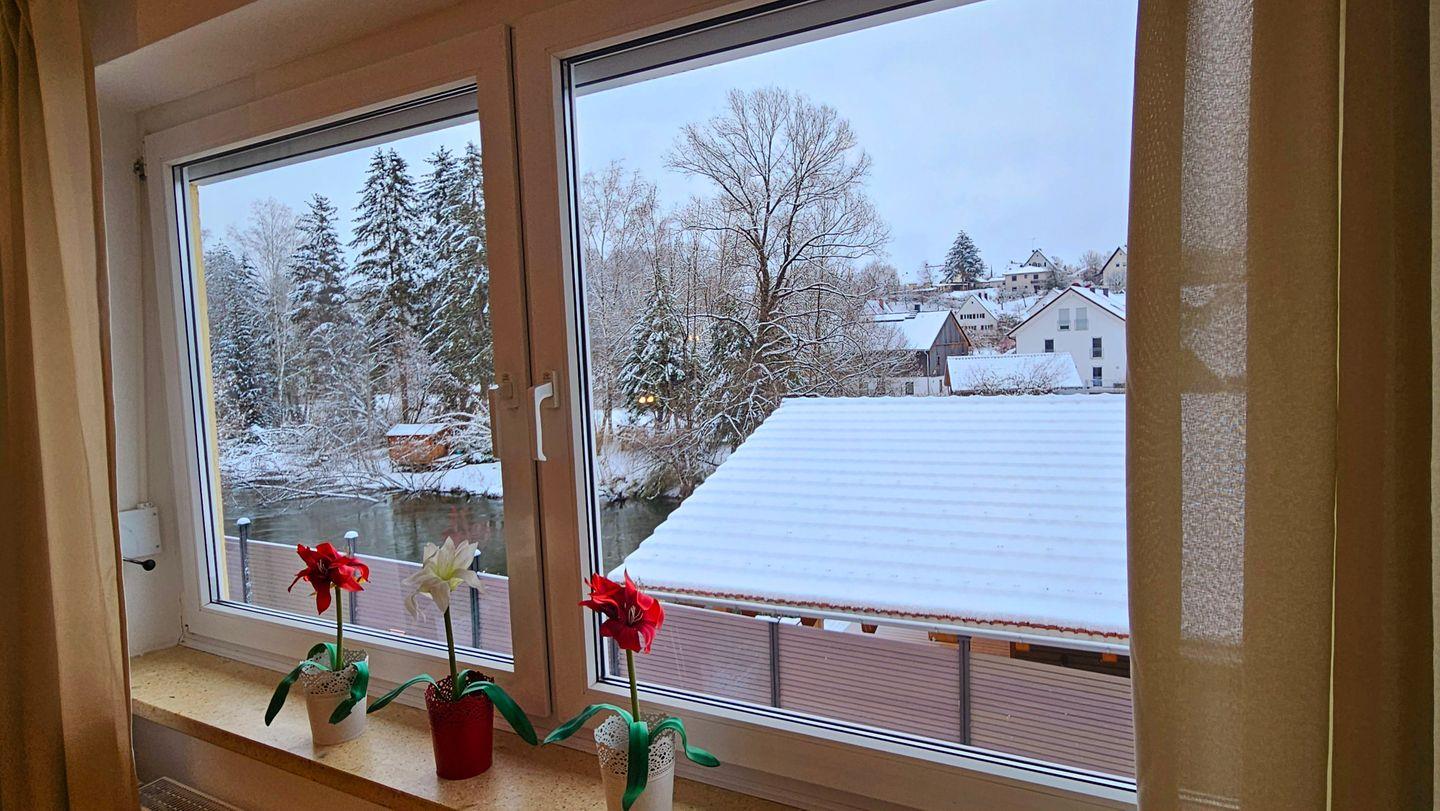 Die Ferienwohnung überzeugt durch eine offene und moderne Gestaltung mit einem hellen Wohnzimmer, das mit zwei gemütlichen Sofas ausgestattet ist. Hier können Sie entspannt die Abende verbringen, während Sie sich dem Fernseher mit Satellitenempfang widmen oder einfach die Aussicht auf die wunderschöne Landschaft genießen. Ein überdachter Balkon lädt dazu ein, die frische Luft und die Aussicht auf den Fluss und die umliegenden Felder ein wenig länger zu genießen.