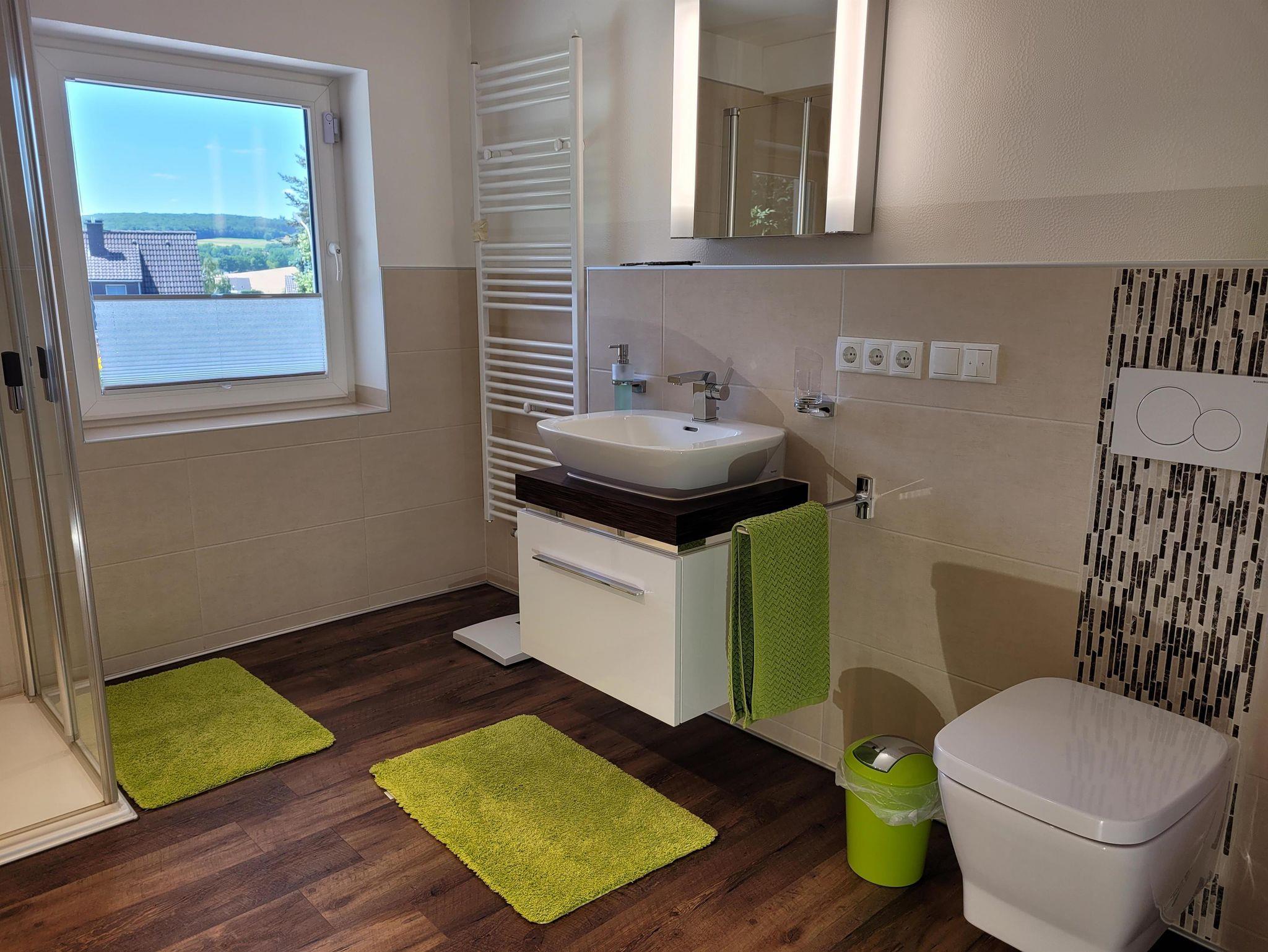 Das Badezimmer mit Dusche, WC und Kosmetikspiegelschrank lässt Ihren Urlaubstag entspannt beginnen.