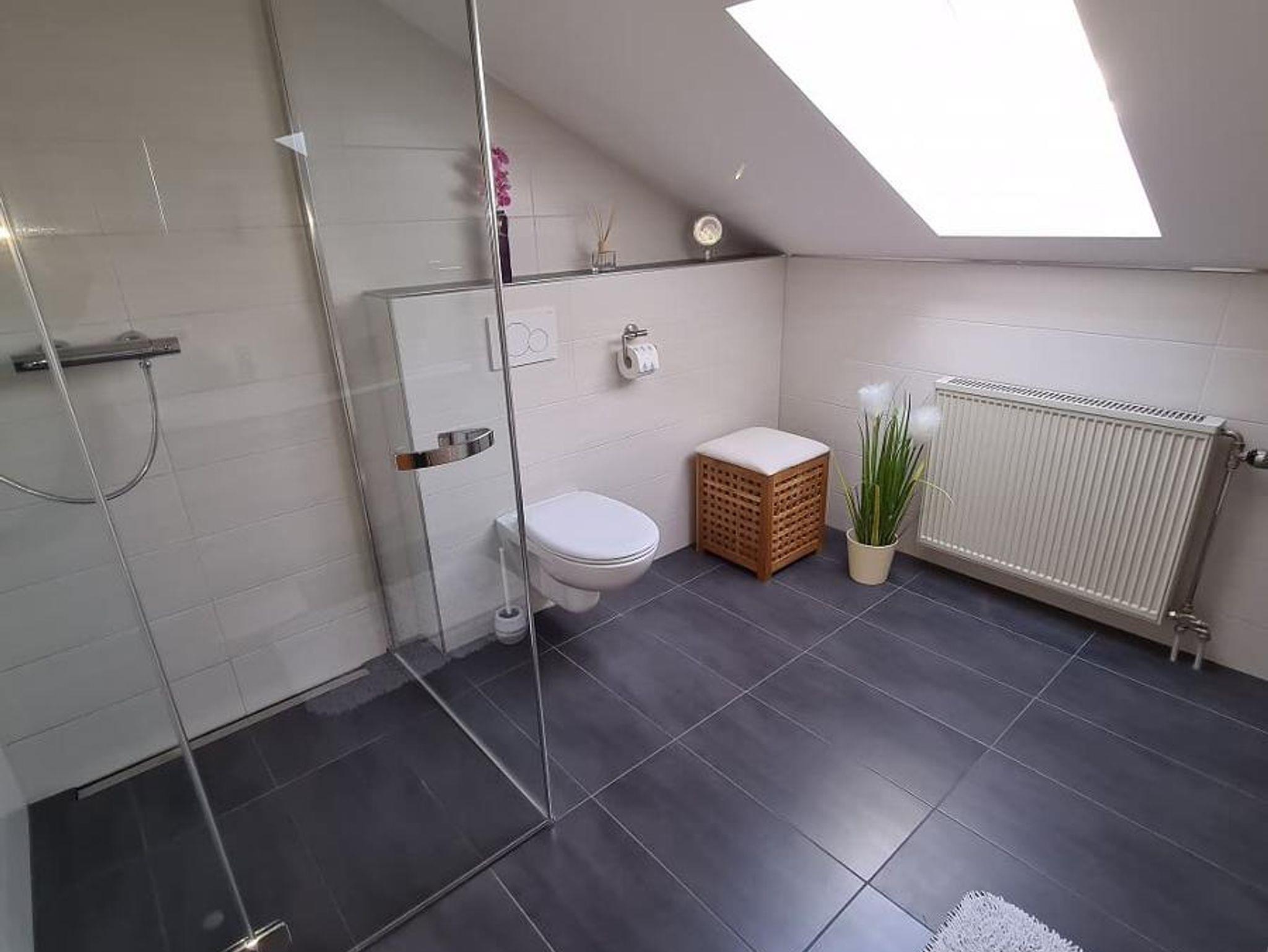 Unsere größte Wohnung befindet sich im Hauptgebäude (Dachgeschoss). Hier können 2 bis 6 Personen (+ 2 Zustellbetten) auf mehr als 100 qm bequem und gemütlich wohnen. Sie besteht aus Wohnküche, drei Schlafzimmer, Dusche mit WC, zusätzliches WC und großer Flur mit Sitzecke und Bücherregal.