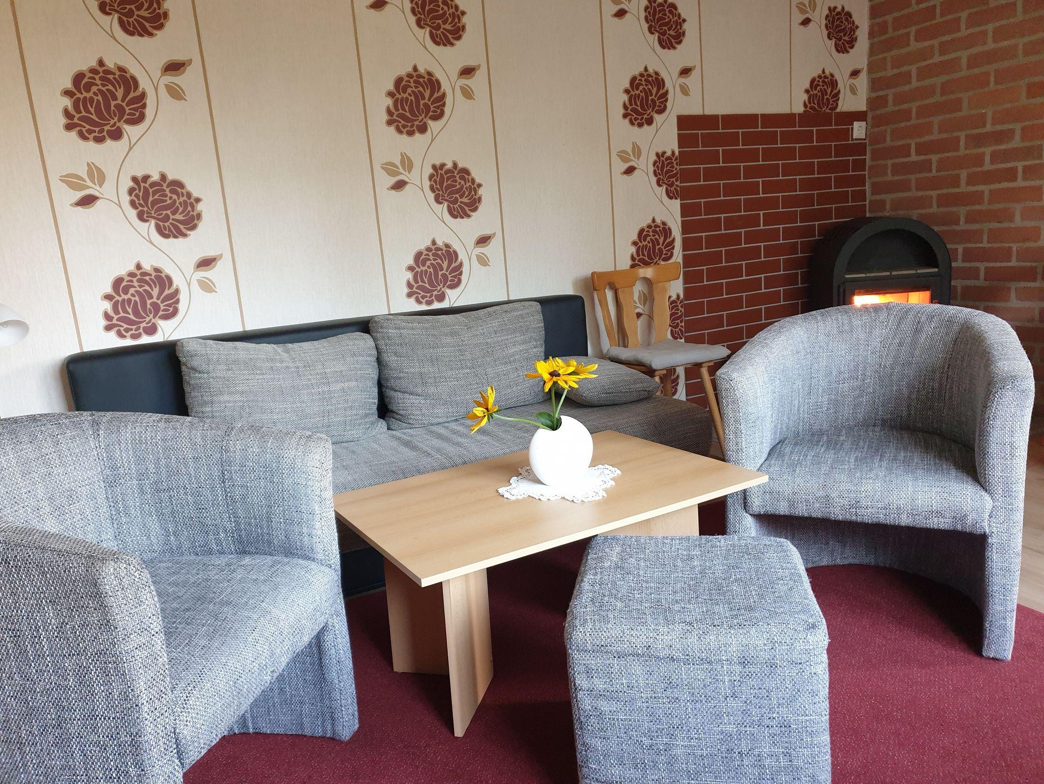 Unser Ferienobjekt besteht aus einem Wohnraum mit Kamin und gemütlicher Sitzecke, einem Schlafraum für 3 Personen (zzgl. 1 Aufbettung für 1 Person) sowie eine komplett ausgestattete Küche ( E- Herd, Kaffeemaschine, Toaster, Wasserkocher), Bad mit DU/WC.