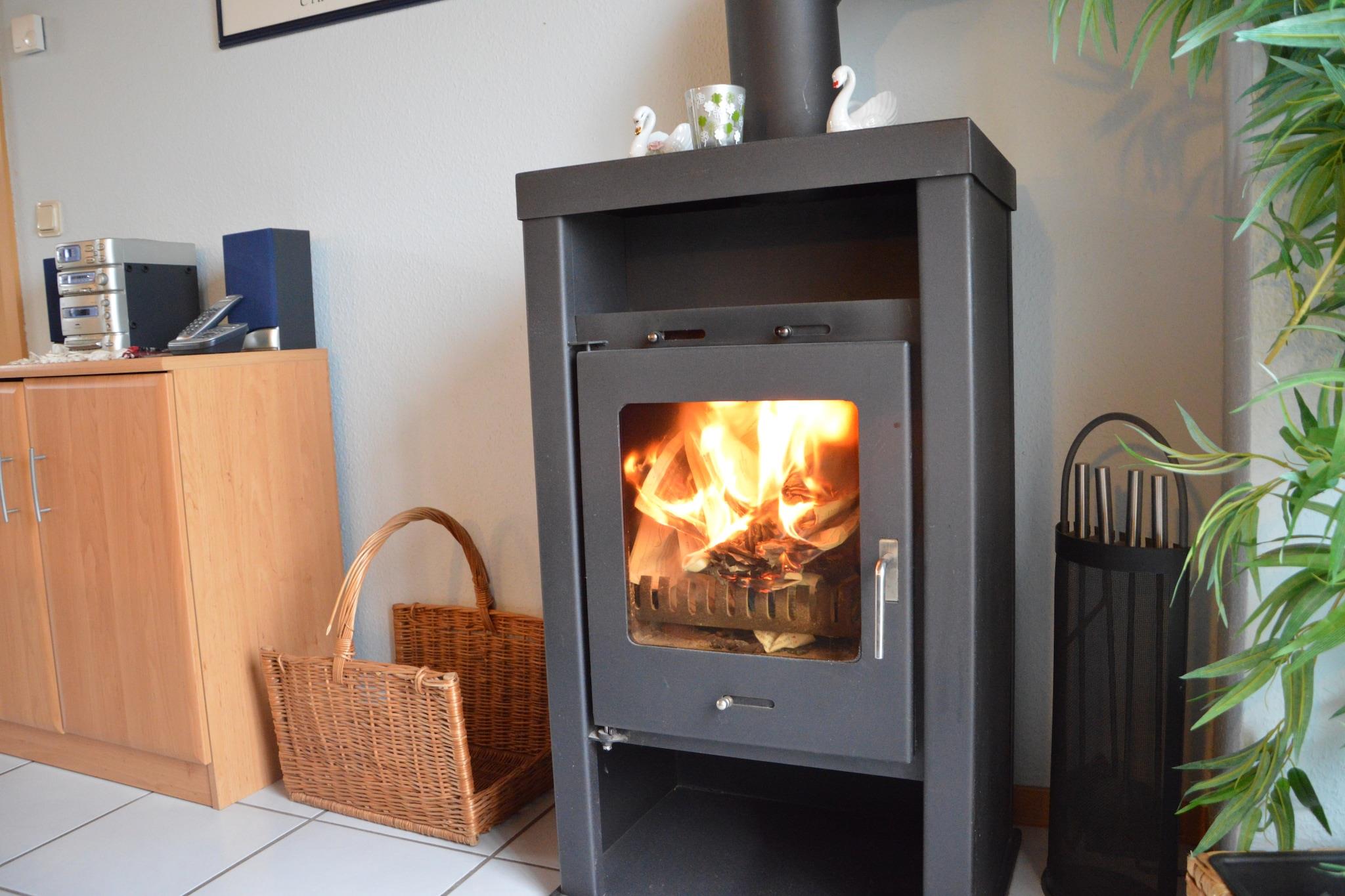 Parterre: (offene Küche(Kaffeemaschine, Backofen), Wohn/Esszimmer(TV, Kaminofen, Balkon), Schlafzimmer(Doppelbett), Schlafzimmer(Einzelbett, Etagenbett), Badezimmer(Dusche, Waschbecken, Toilette)) Trockner, Terrasse, Garten, Gartenmöbel, Grill, Kinderbett, Hochstuhl