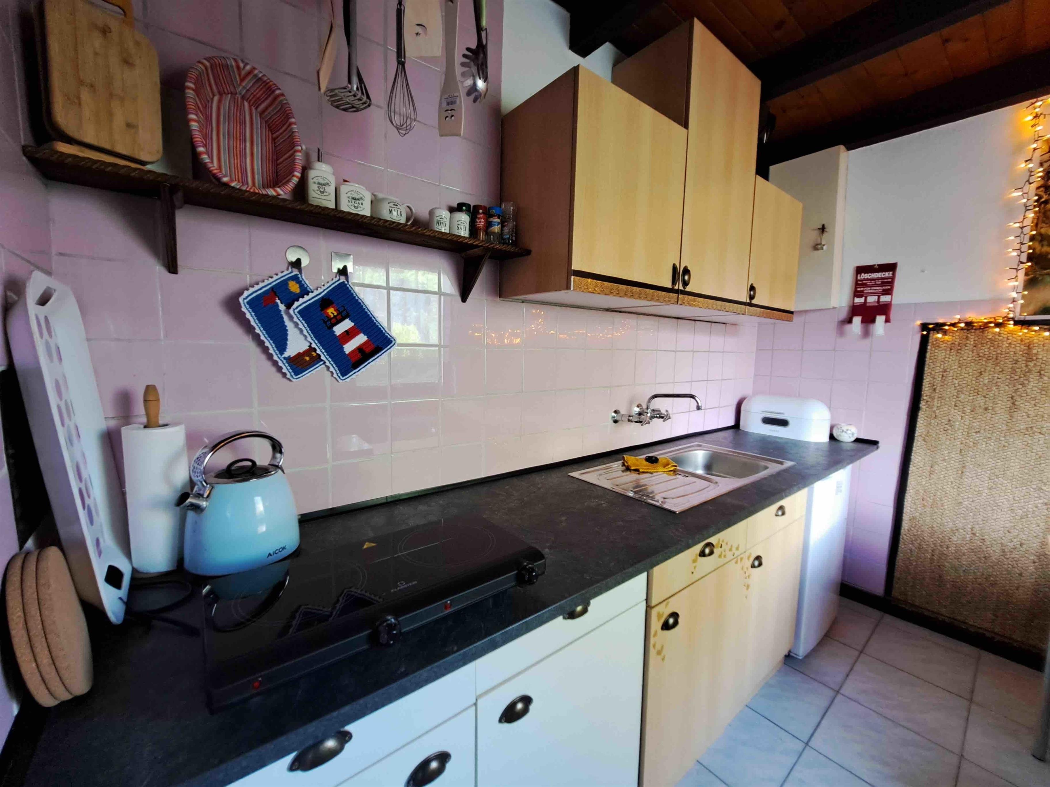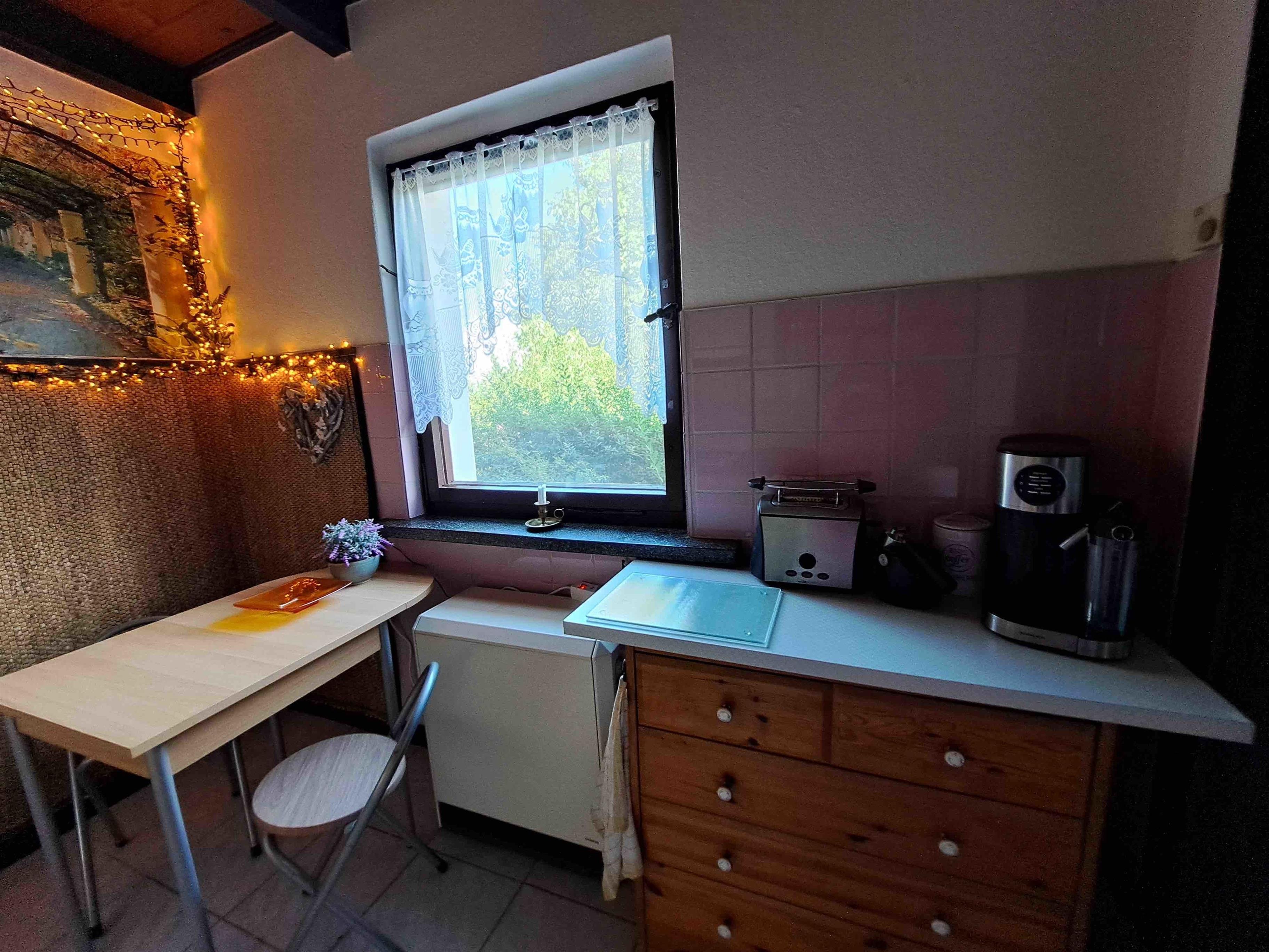 Küche: 2 Elektroherdplatten, kl. Tischbackofen, Sandwichtoaster, Toaster, Kühlschrank, Kaffeemaschine,