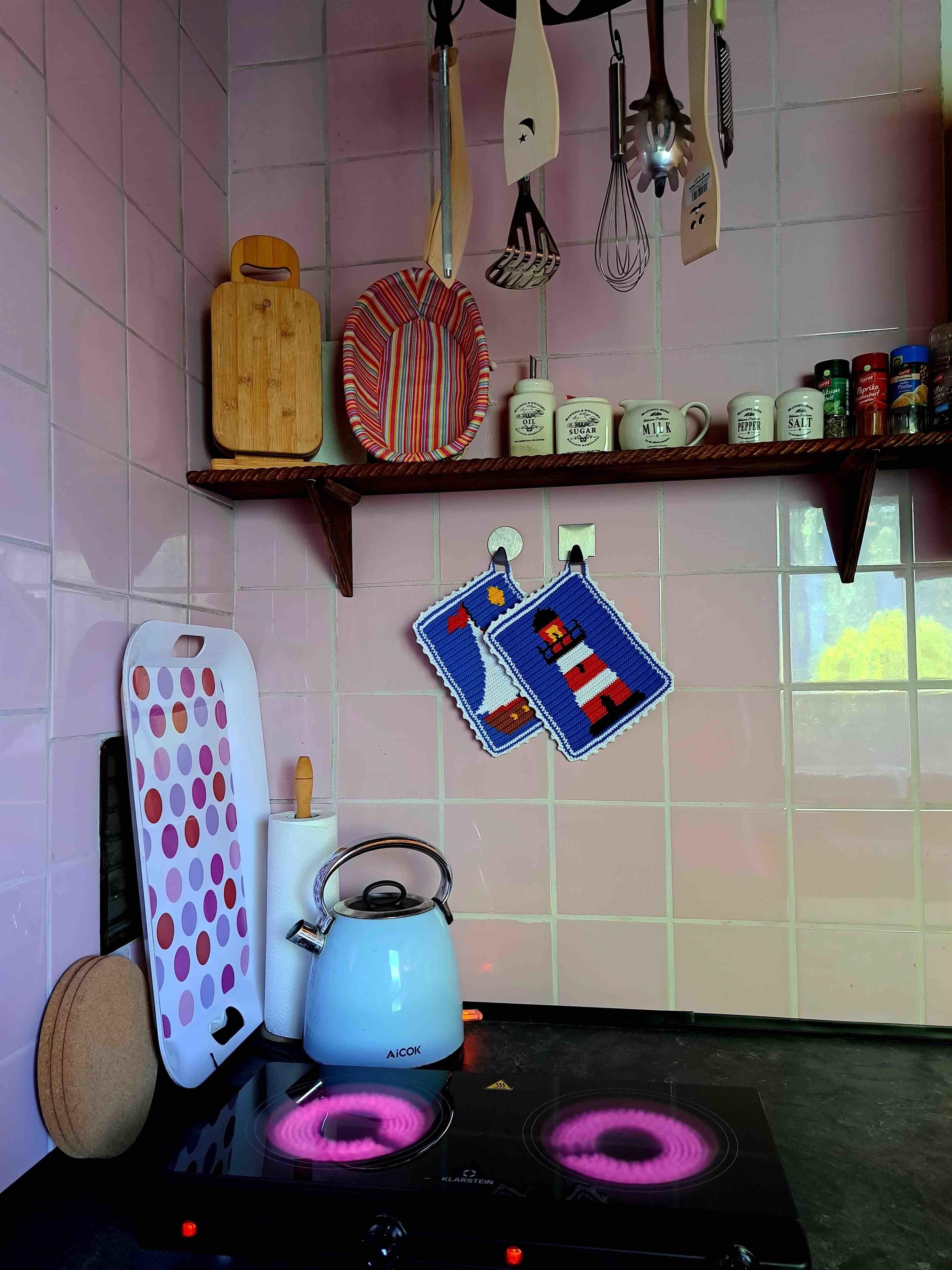 Essecke, Töpfe, Schüsseln, Pfannen, Geschirr, Besteck und Gläser, Wasserkocher, Mikrowelle, sowie eine Auswahl an Kochutensilien und Gewürzen.