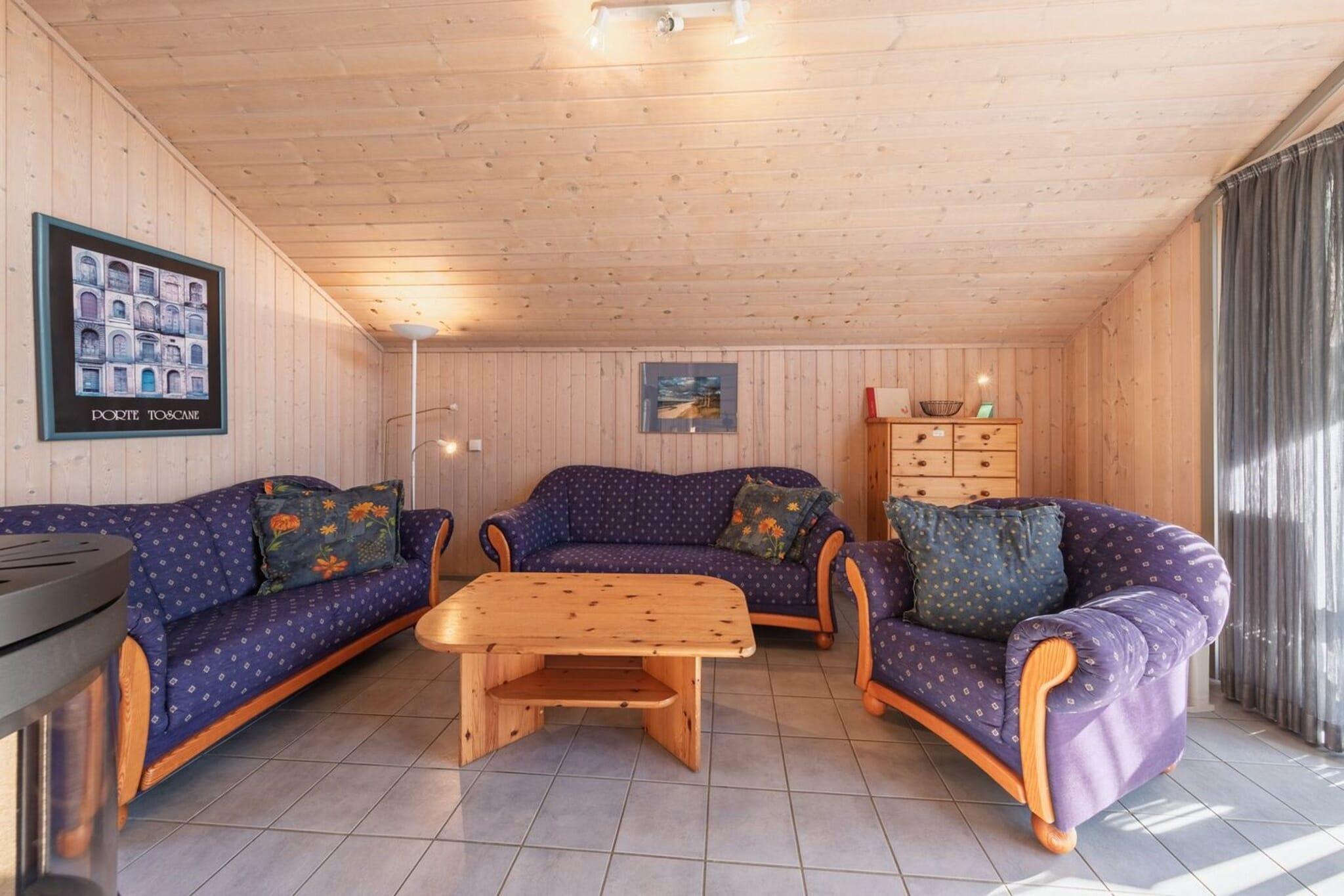 Parterre: (Wohnzimmer(TV(Satellit), Kaminofen, Sitzecke), Küche(Esstisch, Kochplatte, Wasserkocher, Toaster, Kaffeemaschine, Backofen, Mikrowelle, Kühlschrank(+ Gefrierfach)), Schlafzimmer(Doppelbett), Badezimmer(Badewanne, Dusche, Sauna(alleinige Nutzung), Waschbecken, Toilette), Abstellraum) In der 1. Etage: (Schlafzimmer(Einzelbett, Einzelbett), Galerieschlafzimmer(Französisches Bett)) Trockner(Gemeinschaftliche Nutzung mit anderen Gästen, gegen Gebühr), Waschmaschine(Gemeinschaftliche Nutzung mit anderen Gästen, gegen Gebühr), Heizung(elektrisch), Terrasse(überdacht), Garten, Gartenmöbel, Liegen, Parkplatz, Pool(Gemeinschaftliche Nutzung mit anderen Gästen, gegen Gebühr), Hochstuhl, Babybett (kostenpflichtig), Handtücher/Bettwäsche (extra Gebühr)