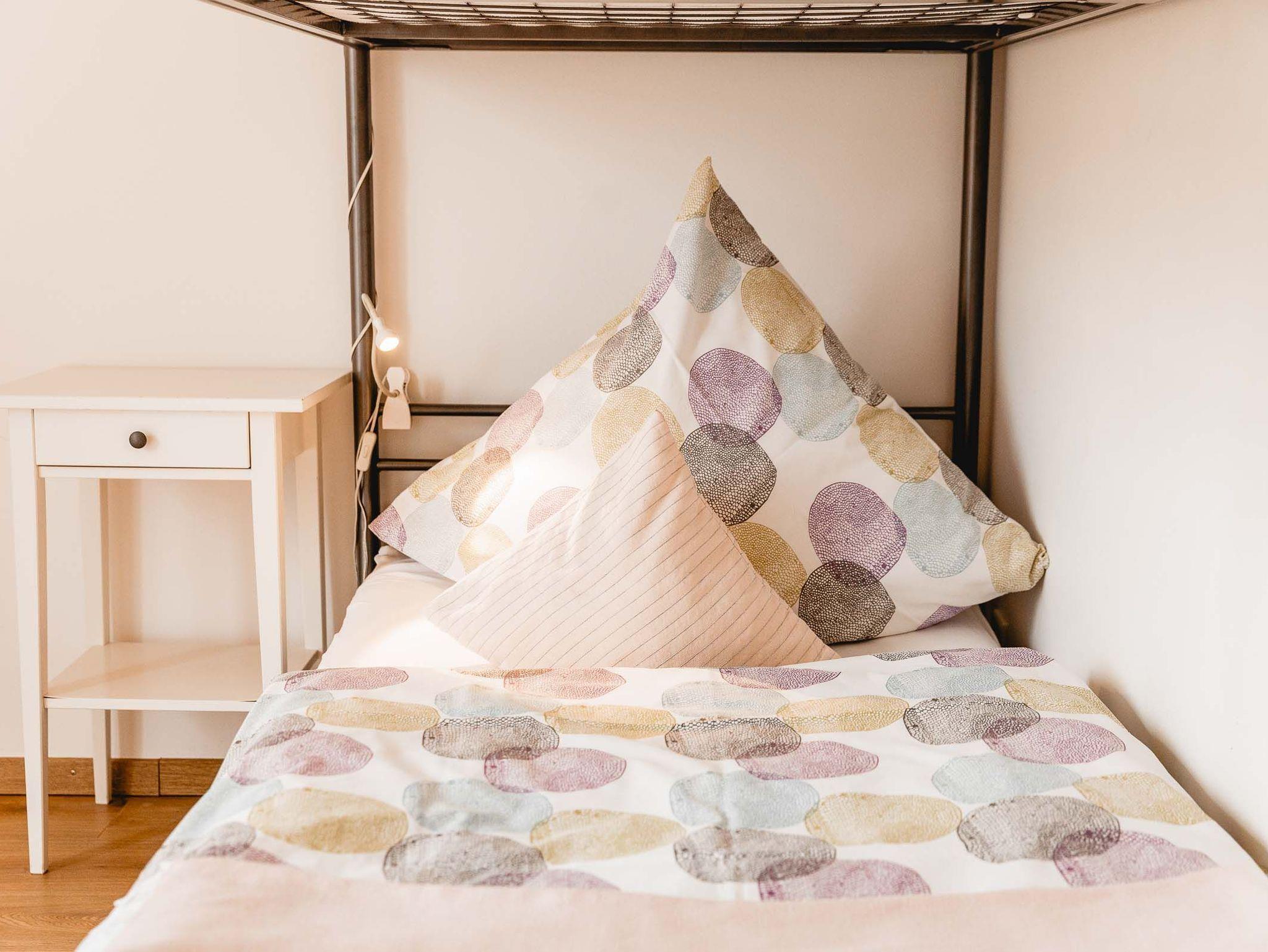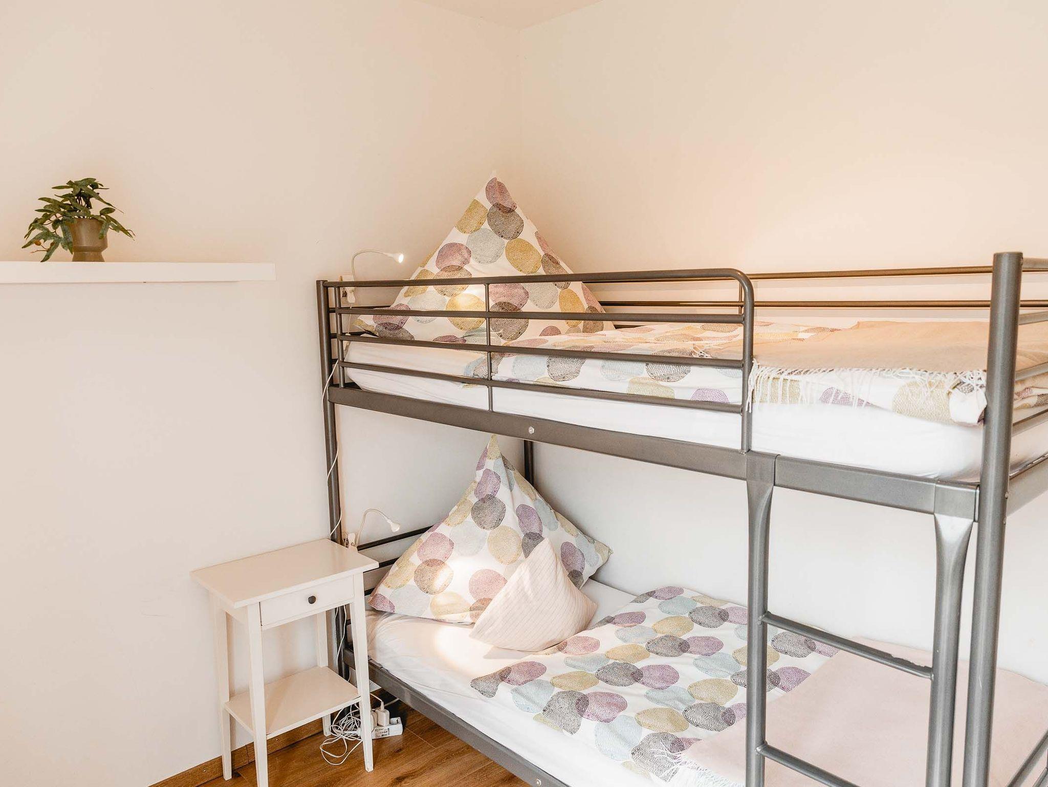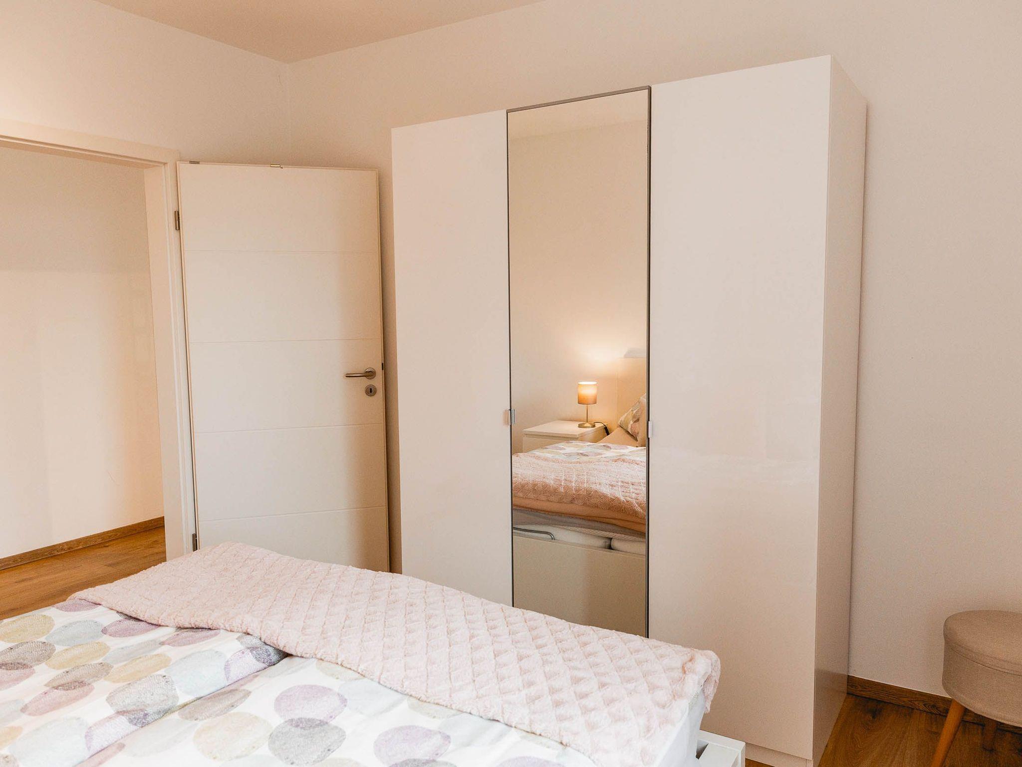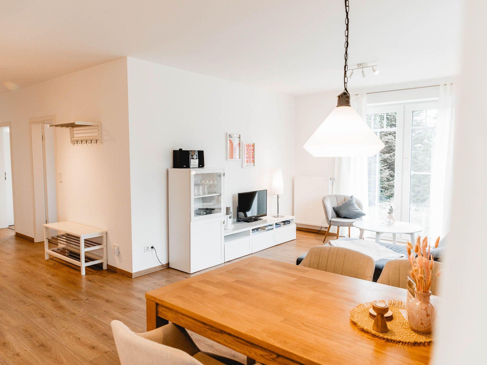 Die Wohnung Wiesenblick befindet sich im EG unseres Neubaus und bietet auf 60 qm Platz für bis zu vier Personen. Aufgeteilt ist sie in zwei Schlafzimmer (1 SZ mit Doppelbett, 1 SZ mit einem Einzelbett, das sich zu einem vollwertigen Doppelbett ausziehen lässt), einem Wohn/Essbereich mit komplett ausgestatteter Küchenzeile, Dusche/WC, Abstellraum und Terrasse. Diese Wohnung ist barrierefrei.