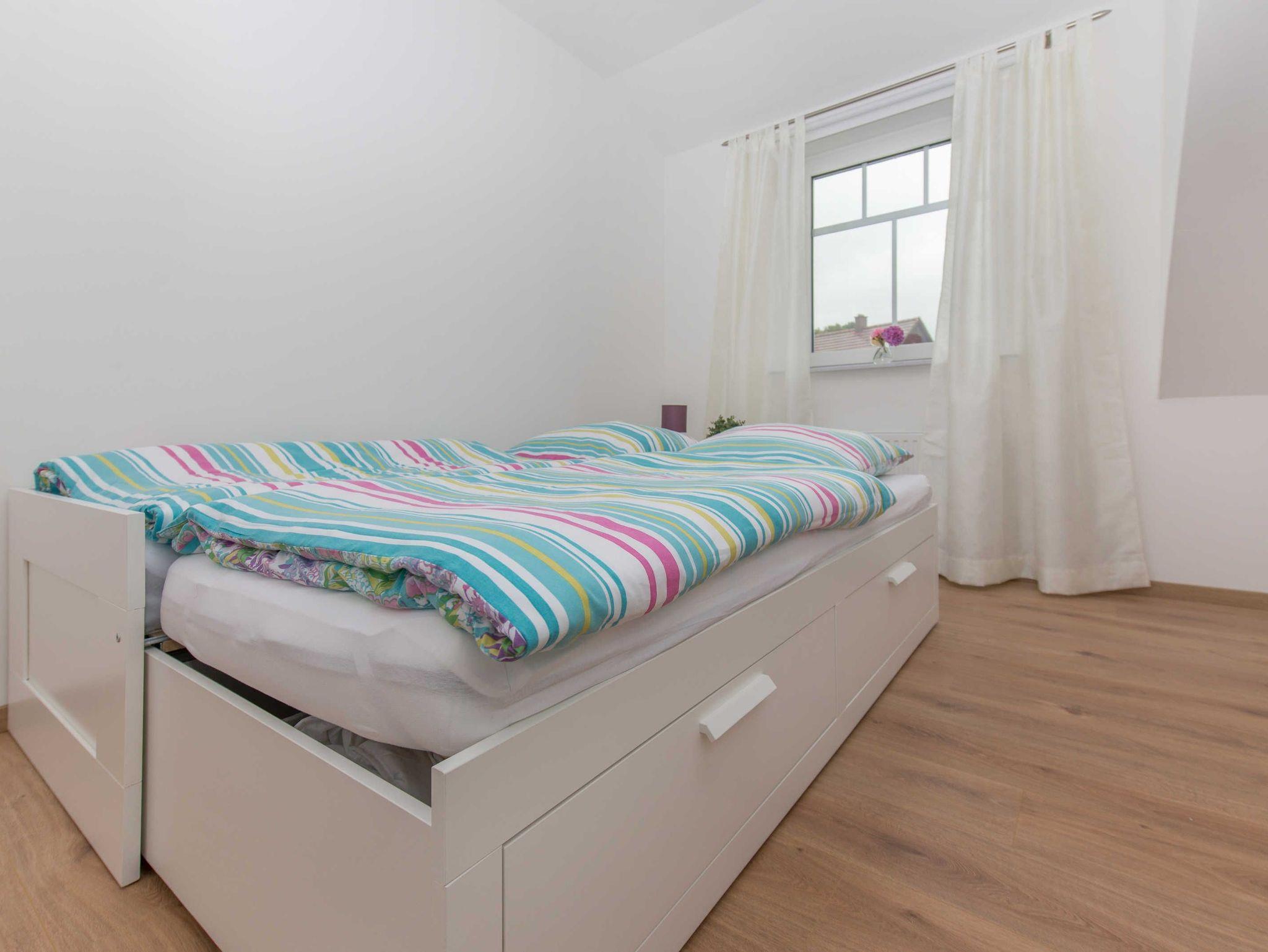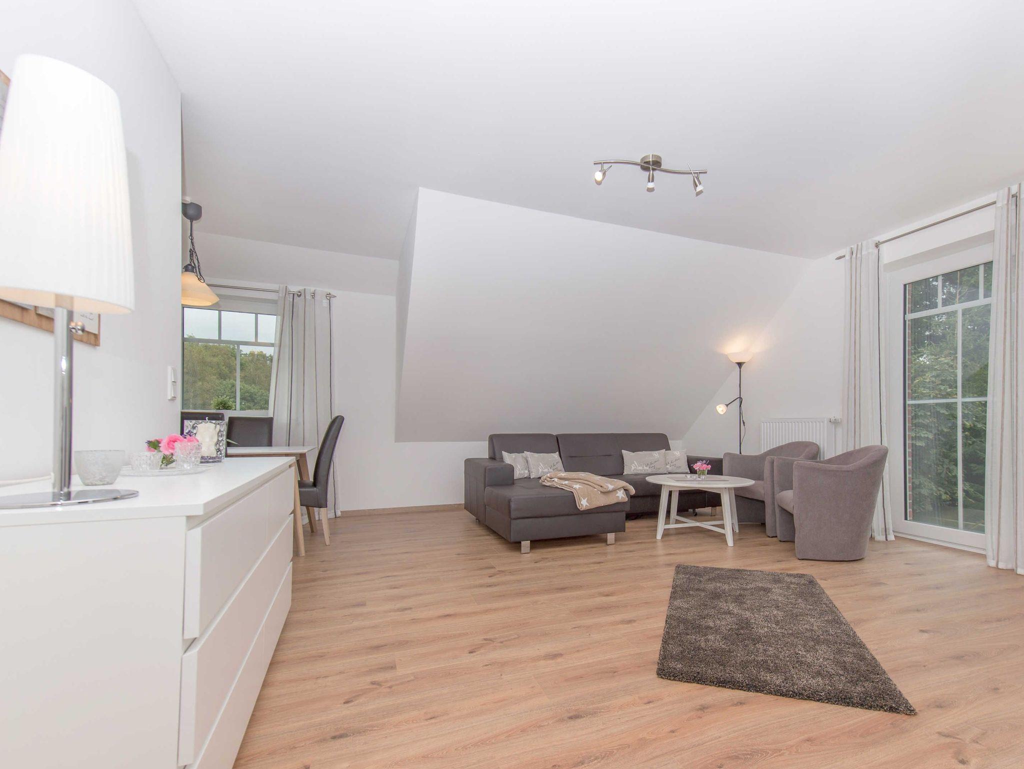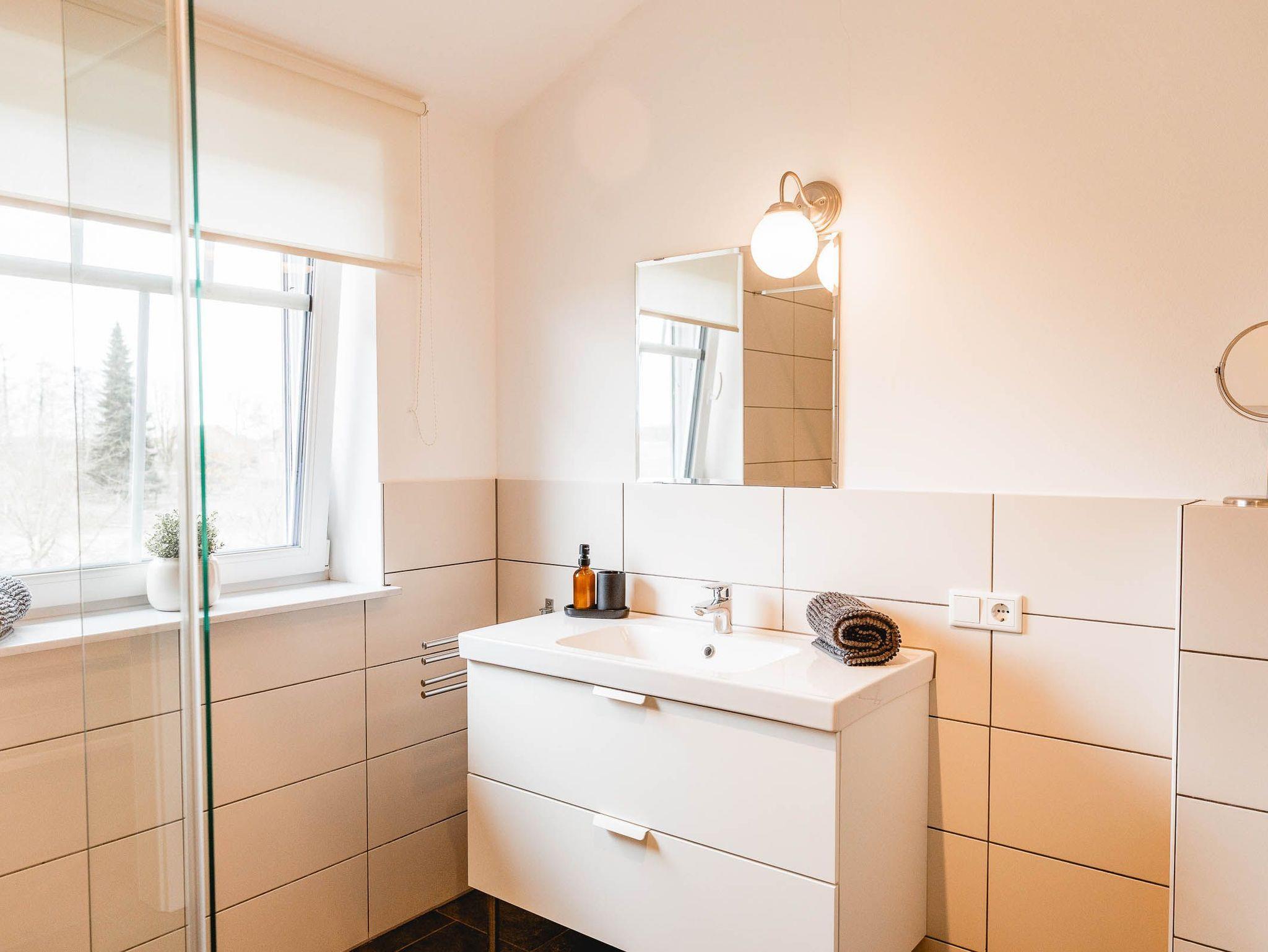 Die Wohnung Hofperle befindet sich im OG unseres Neubaus und bietet auf 90 qm Platz für bis zu sechs Personen. Sie ist aufgeteilt in drei Schlafzimmer (jeweils mit Doppelbett, ein SZ mit Flachbild-TV), einem großen Wohn/Essbereich, Dusche/WC mit Tageslicht, separates WC und Abstellraum mit Waschmaschine.