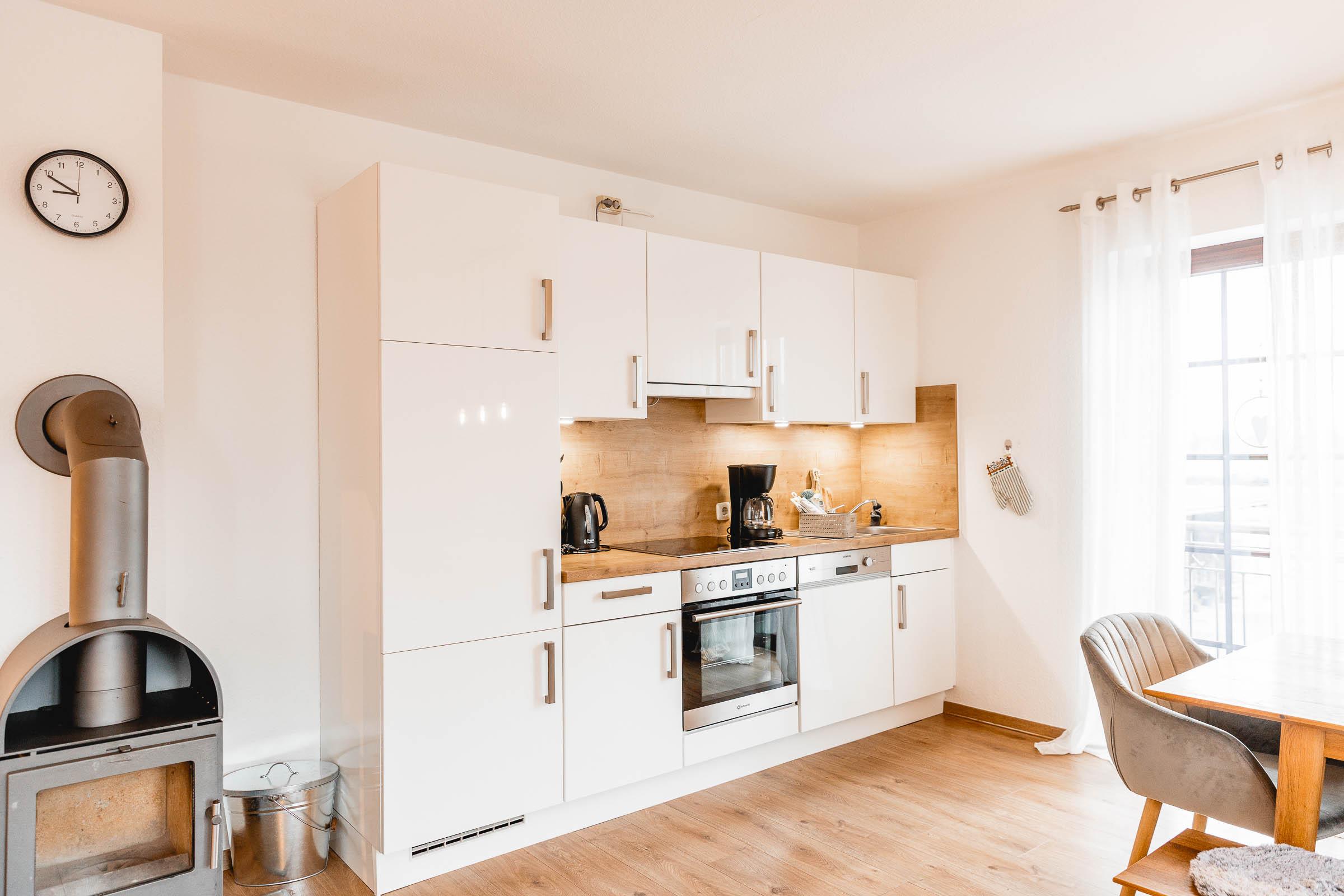 Die Küchenzeile ist komplett ausgestattet u. a. mit Geschirrspüler, Mikrowelle, Backofen, Cerankochfeld, Wasserkocher, Kaffeemaschine, Toaster, Eierkocher, Handrührgerät, Küchenwaage und Flaschenwärmer.