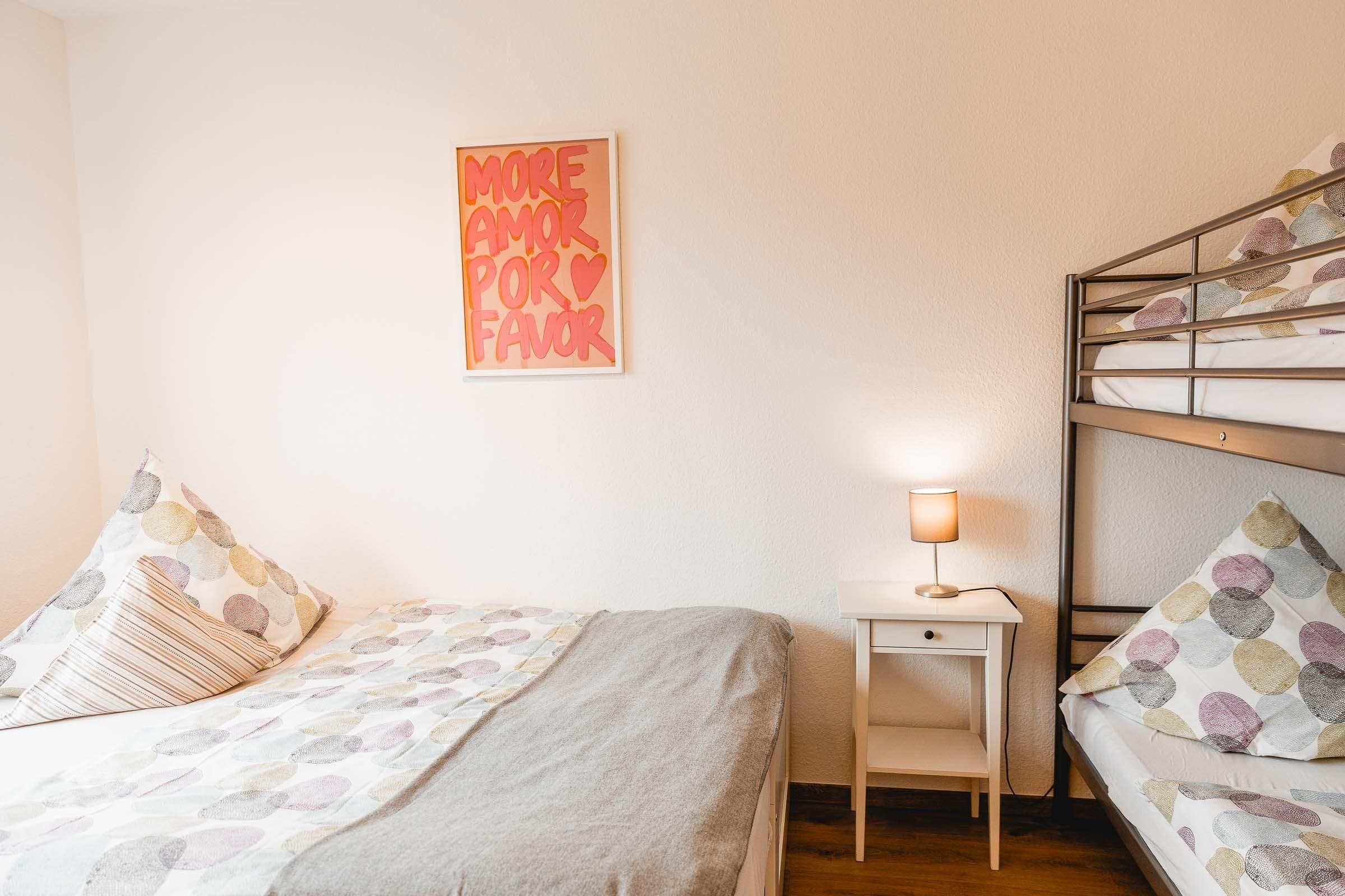 Die Wohnung verfügt über einen großen Wohn/Essbereich, 1 Bad/WC, 2 Schlafzimmer (1 Schlafzimmer mit einem Einzelbett, das sich zu einem Doppelbett ausziehen lässt und einem Etagenbett und 1 Schlafzimmer mit Ehebett). Das Elternschlafzimmer ist über eine Treppe vom Wohnzimmer zu erreichen, hier steht ebenfalls ein Gitterbett.