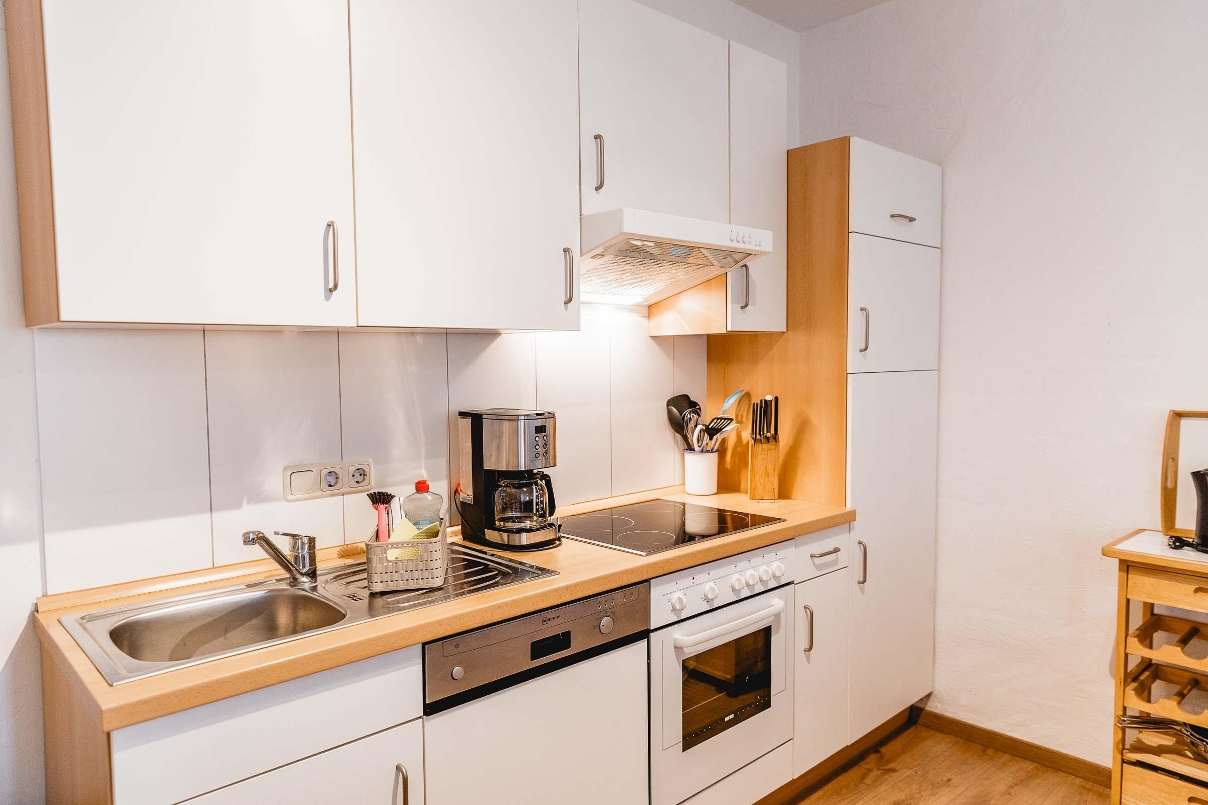 Die komplett ausgestattete Küchenzeile verfügt u. a. über Geschirrspüler, Cerankochfeld, Backofen, Kaffeemaschine, Wasserkocher, Eierkocher, Handrührgerät und Küchenwaage.