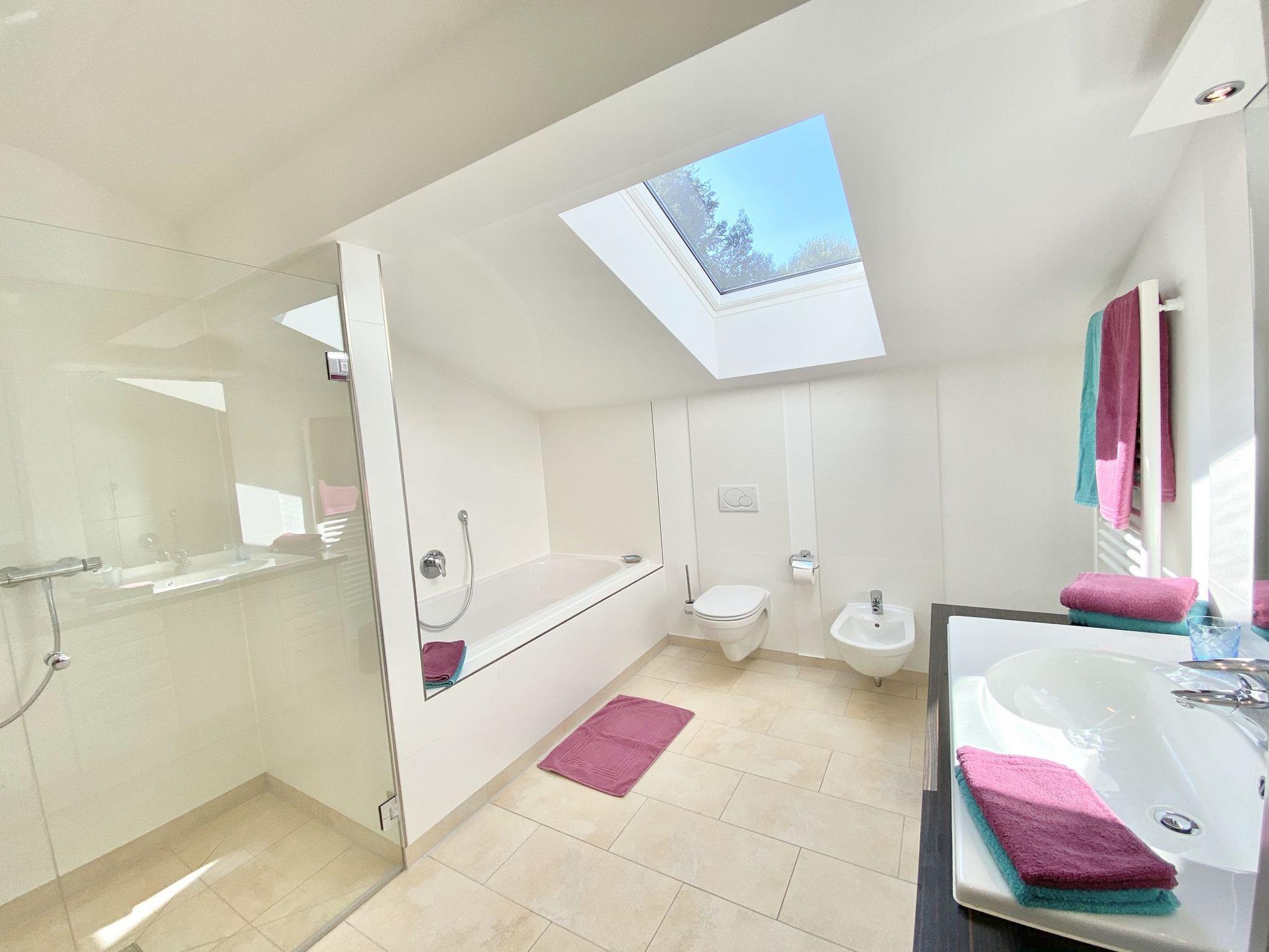 Die Küche mit gemütlicher Sitzecke ist mit Geschirrspüler, Kühlschrank, Backofen und Kaffeemaschine, Wasserkocher... ausgestattet. Im Wohnzimmer findet Ihr eine große Couch mit TV, eine zusätzlichen Essbereich, Spielsachen und Gesellschaftsspiele. Wir bieten außerdem 3 Schlafzimmer mit TV, sowie 3 Badezimmer mit Dusche/WC und einer Badewanne.