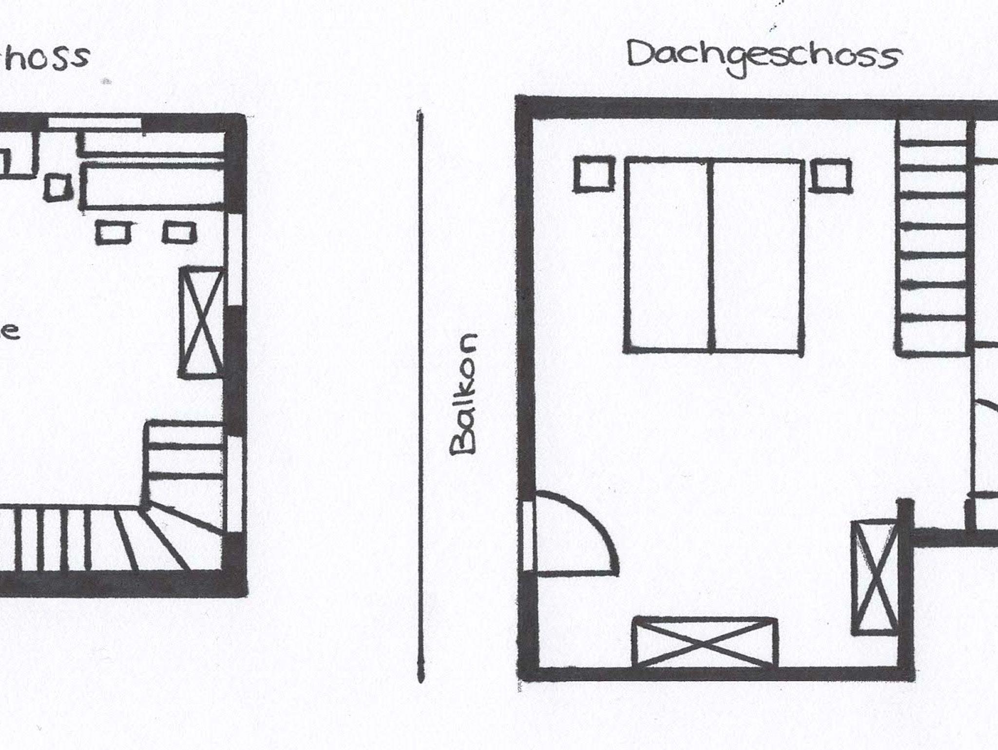 Die Ferienwohnung liegt im 1. Stock und ist mit 2 separaten Mansardenschlafzimmern, die über eine Treppe von der Wohnküche aus zu begehen sind, ausgestattet. Es gibt eine gemütliche Wohnküche mit Essplatz. Du/WC und einen Ostbalkon. 1 Doppelzimmer kann zur FW zugemietet werden. Gartenhäuschen mit Grillmöglichkeit.