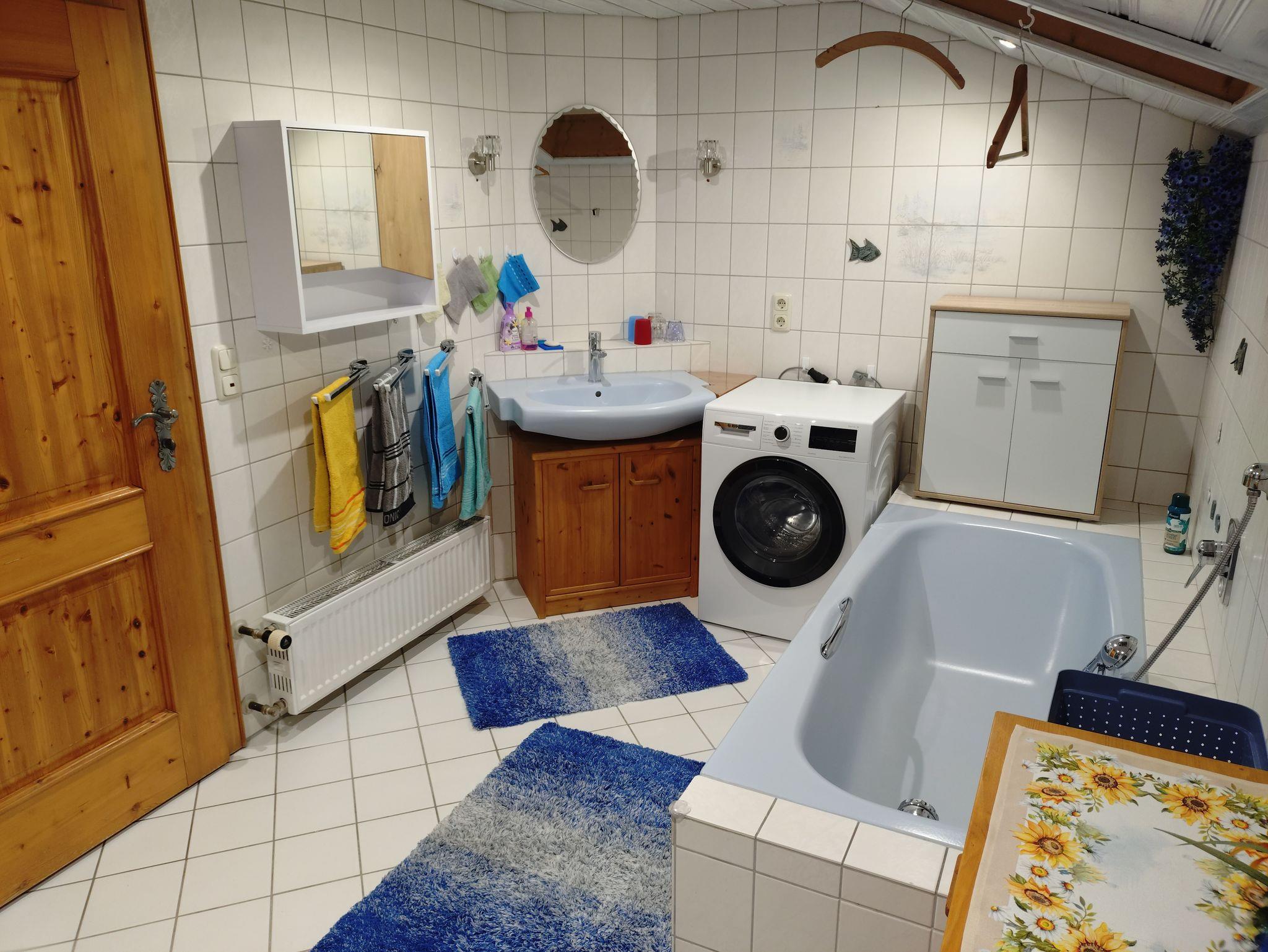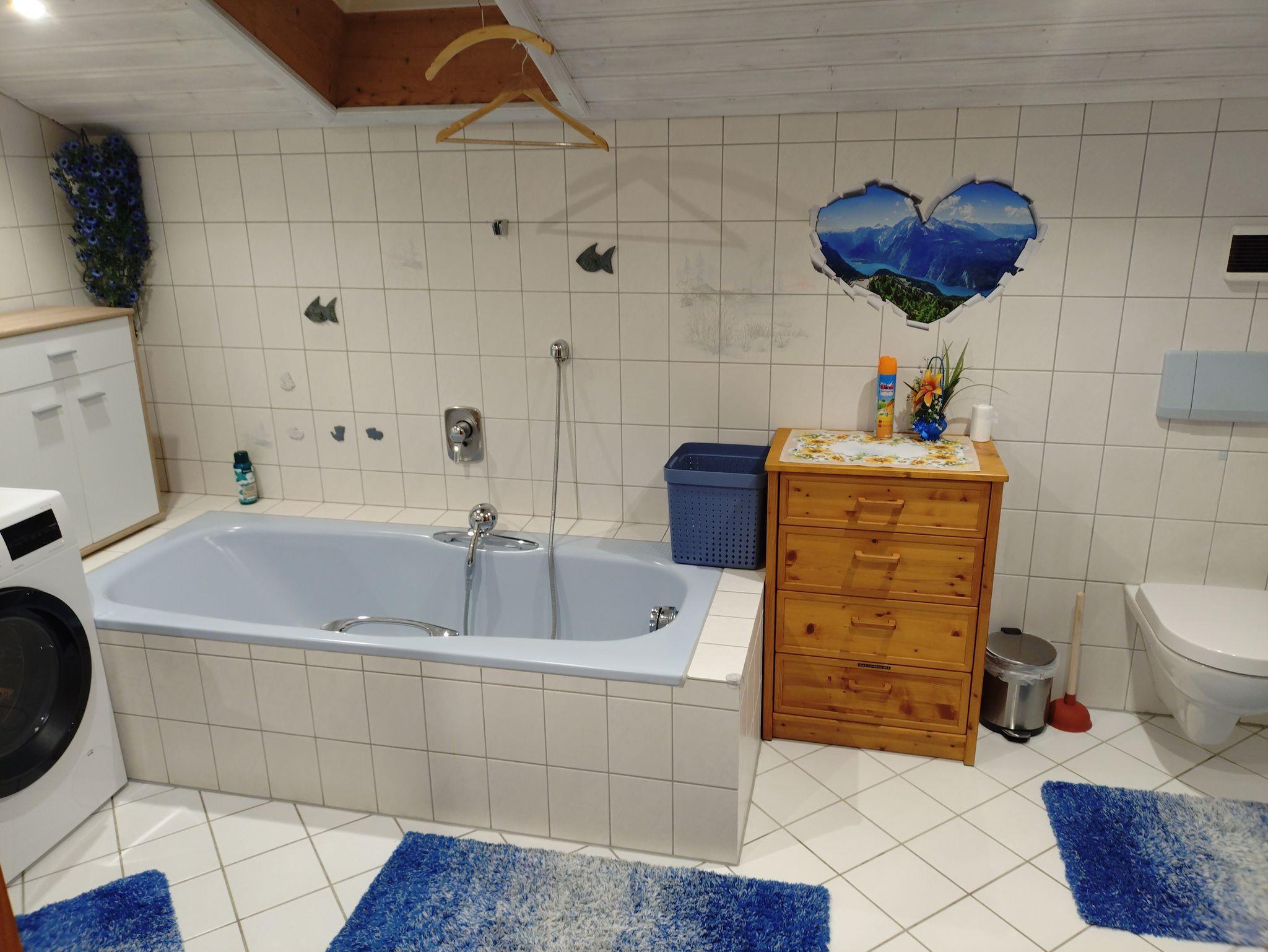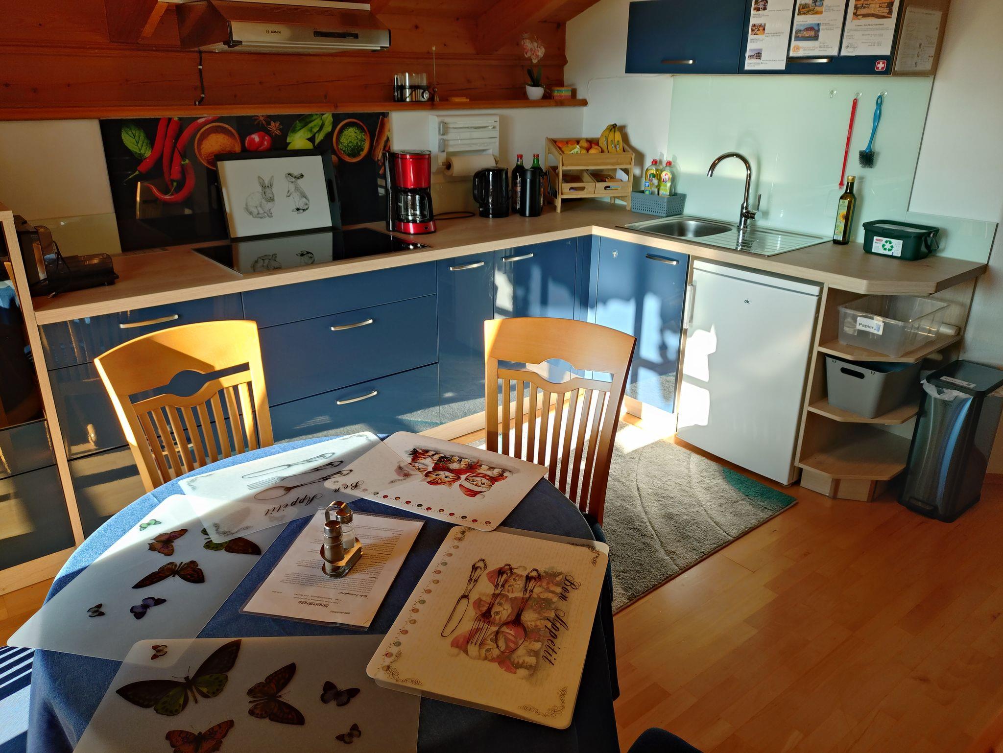 Neuerrichtete Ferienwohnung ( 90 qm) im 1.Stock vom Wohnhaus mit separaten Aussentreppen-Aufgang , 2 Schlafzimmer mit 3 bzw. 2 Betten, großzügiges gemütliches Wohnzimmer mit 26 qm im Landhausstil mit Couch (kann auch zusätlich als Schlafcouch umgelegt werden) 43 Fernseher 4 K mit Satellitenempfang, Tisch und Eckbank sowie zusätzliches Sofa. Und für romantische Abende kann ein Kaminofen mit Sichtfenster angefeuert werden. Neu eingerichtete Küche mit großem Kochfeld, Backofen, Dunstabzug, Kühlschrank, Kaffeemaschine, Brotmaschine, Wasserkocher, Radio usw. Ausserdem Esstisch in der Küche vorhanden mit Schiebetür zum Wohnzimmer mit Südbalkonzugang. Grillmöglichkeit im Garten, Grill, Sonnenschirm, Biertischgarnitur usw. vorhanden. Kostenloses WLAN und absperrbare Garage mit Elektro-Tor für Ihr Auto und Fahrräder inklusive. Stromanschluss in der Garage zum aufladen der E-Bike. Im Bad steht eine Waschmaschine zur Verfügung.