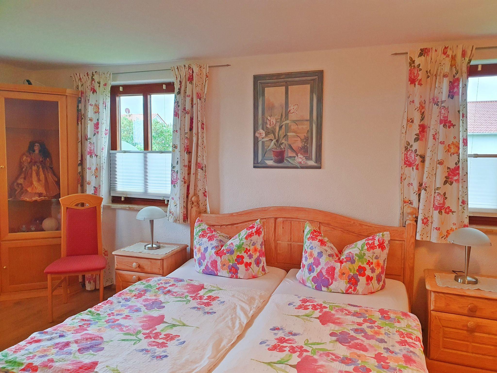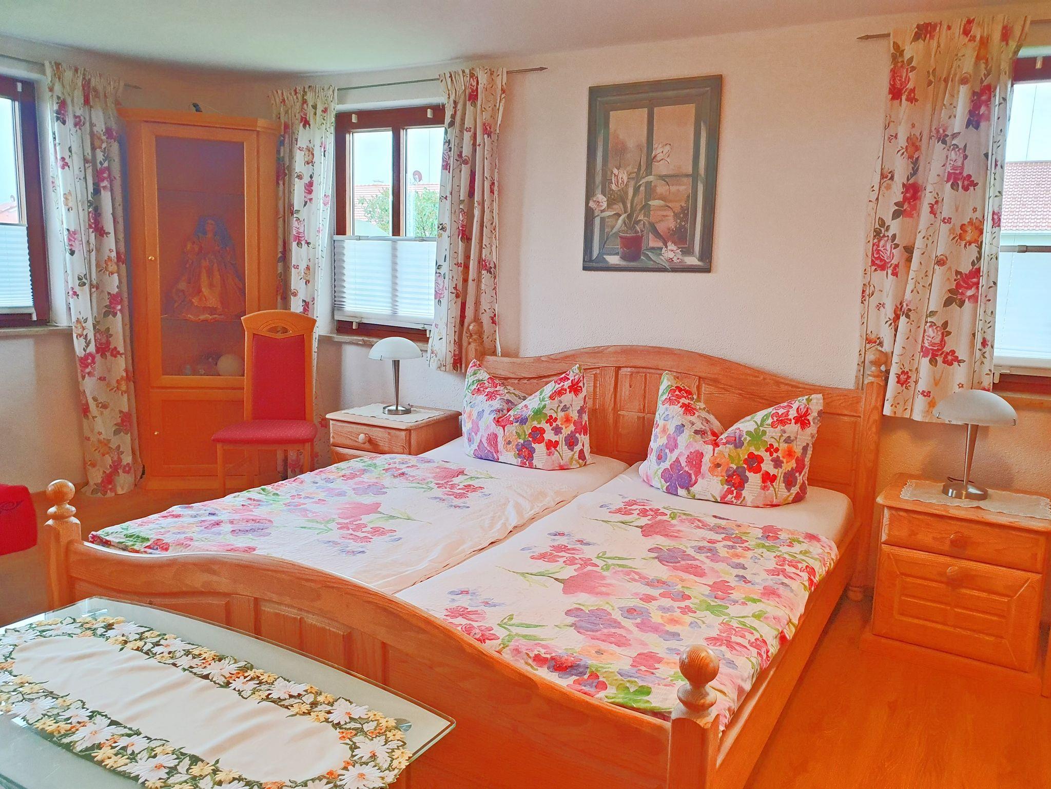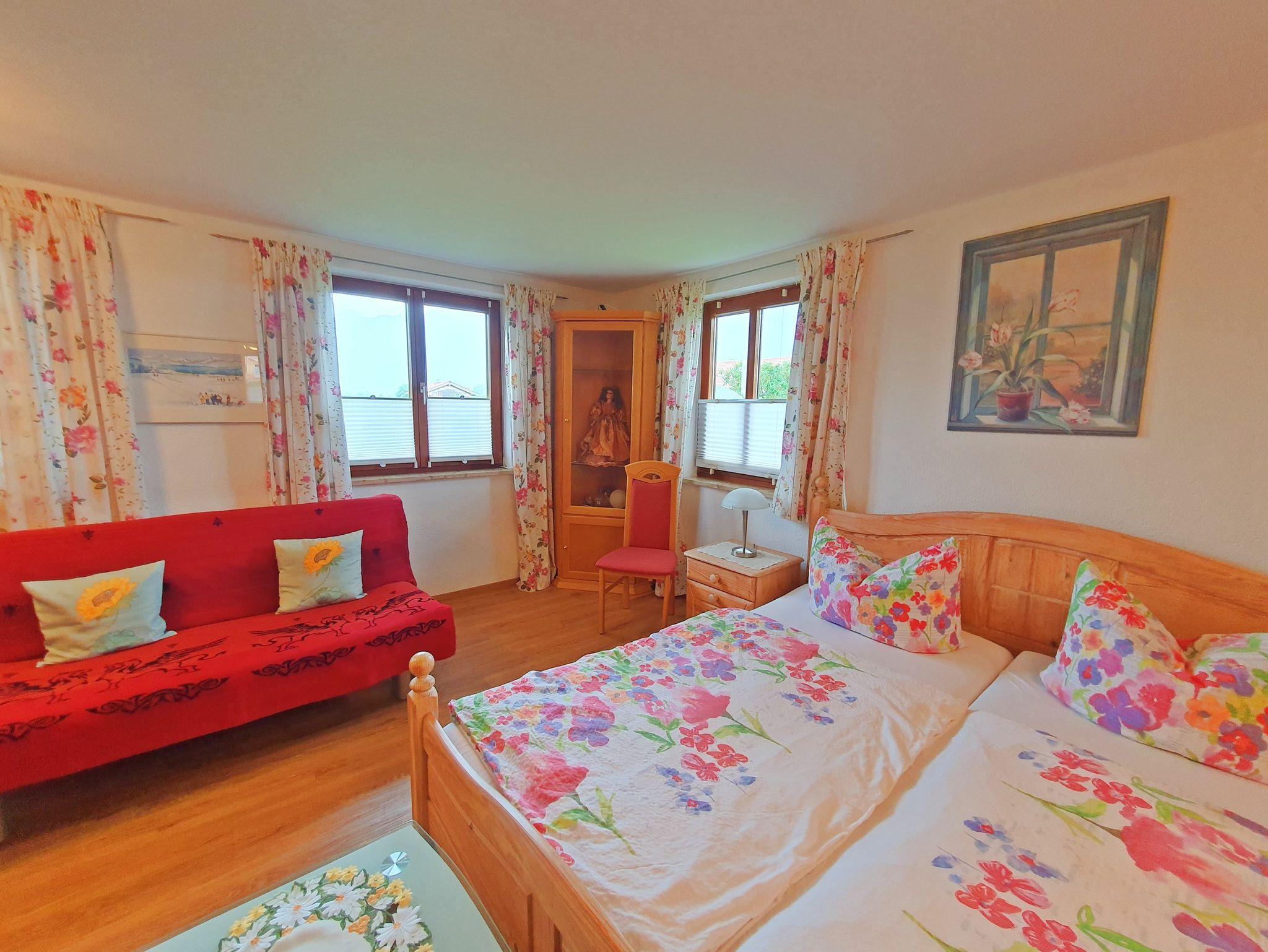 Gemütlich eingerichtetes Doppelzimmer ca. 26 qm mit Doppelbett und Ausziehcouch, WC, Bad und Dusch auf der Etage.