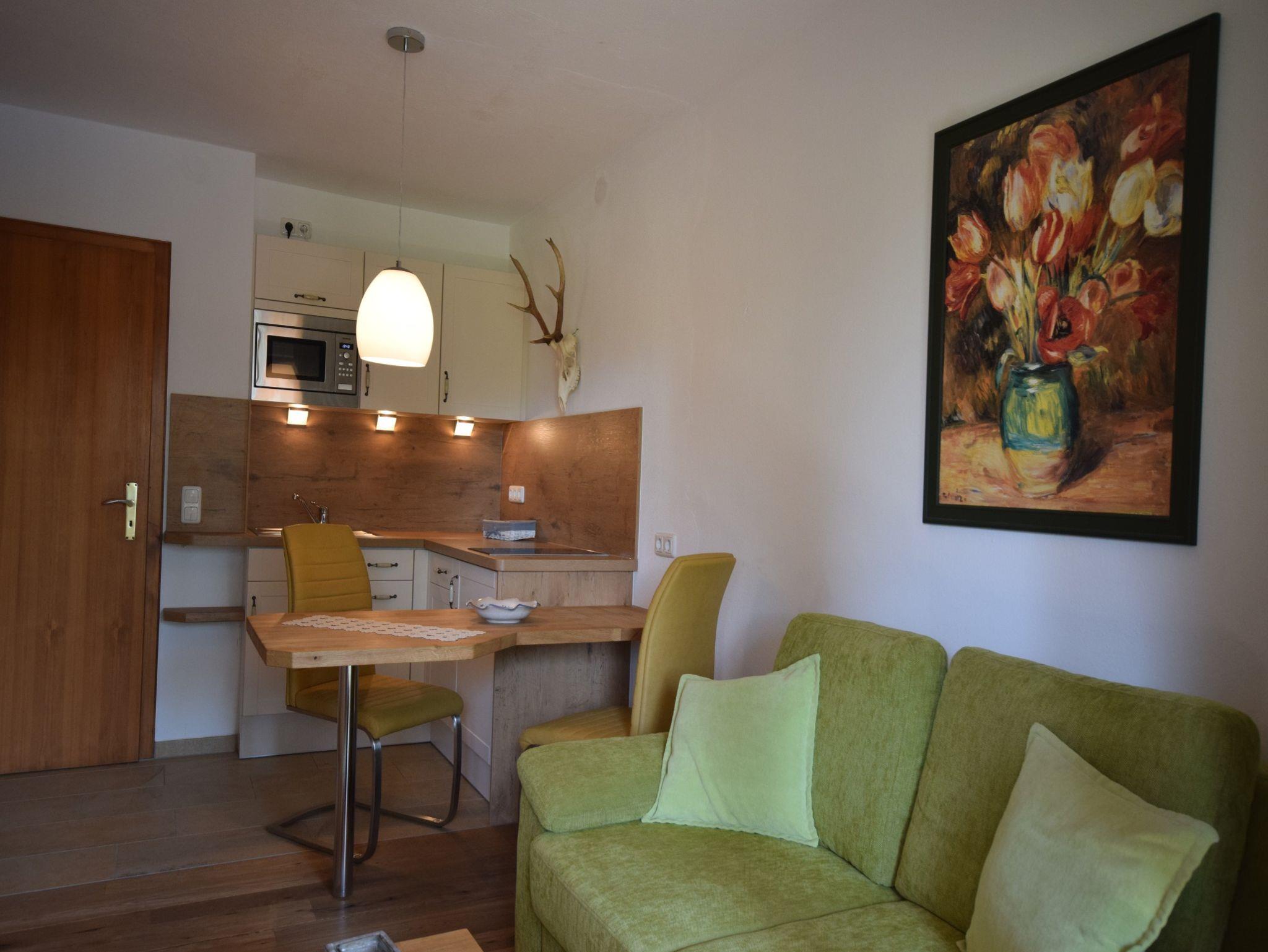Die komfortabel eingerichtete Ferienwohnung im Landhausstil ist 28 Quadratmeter groß, sonniger Süd-Balkon mit freiem Bergblick. Ideal für 1-2 Personen. Wohn- Schlafraum kombiniert und Kochnische. Die Küche ist mit einer Geschirrspülmaschine ausgestattet. Schlafcouch für ein Kind wäre ebenfalls vorhanden. Badezimmer mit Dusche und WC, Vergrößerungsspiegel und Fön. W-LAN.Haustier gegen Gebühr erlaubt.