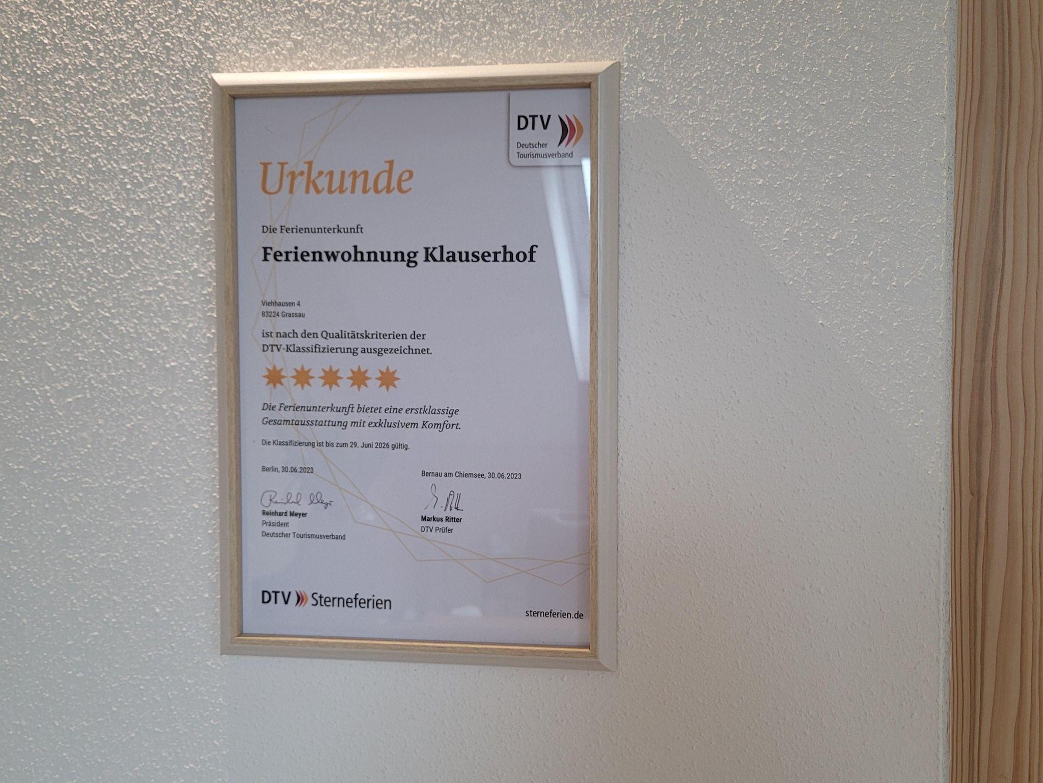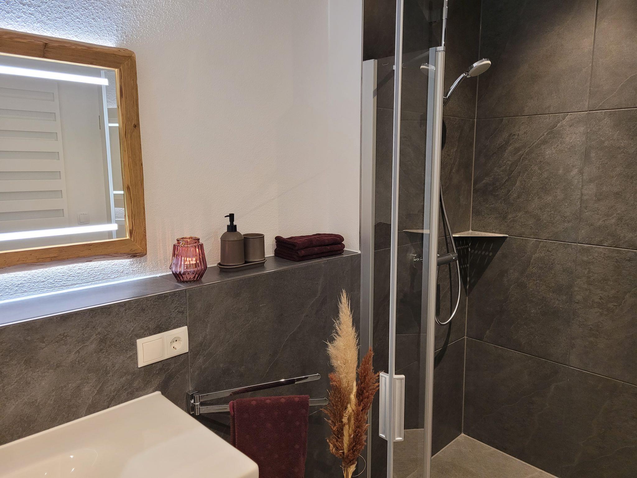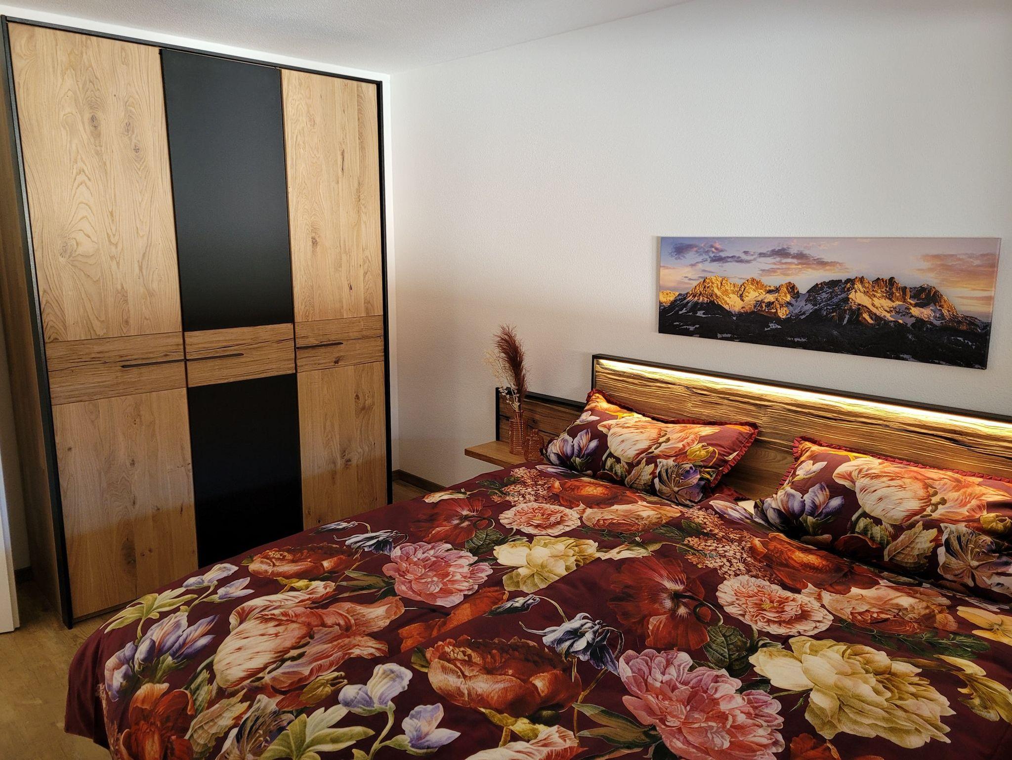 Unsere neu entstandene, 5 Sterne-Ferienwohnung ist sehr stilvoll und hochwertig eingerichtet. Die Mischung zwischen rustikalen Holzelementen und modernen Ambiente verleiht der Wohnung einen besonderen Flair. In der sehr lichtdurchfluteten Wohnküche im Dachgeschoss fühlt man sich sofort wie zu Hause. Dieser Bereich und auch der Rest der Wohnung ist gut geschützt vor sommerlicher Hitze durch Rollos und Raffstores. Im hinteren Teil des offenen Raumes kann man auf unserer großen Familiencouch den Tag gemütlich zum Ausklang bringen. Dort befindet sich auch der einladende Essbereich. Im vorderen Teil ist die großzügige Küche, von der aus man einen Kaffee mit Bergblick genießen kann. Von hier aus ist der Zugang zum überdachten Balkon möglich, der sich auf der Westseite befindet und von dem aus man einen wunderbaren Blick auf die Hochplatte bishin zum, in Tirol liegenden, Wilden Kaiser hat. Die zwei Schlafzimmer sind ausgestattet mit zwei Doppelbetten in der Größe 180x200 cm. Im Zirbenzimmer kann man den Duft der wohltuenden, ätherischen Öle der massiven Zirbenmöbel auf sich wirken lassen. Im Eichenzimmer findet man ein sehr hochwertig ausgestattetes Schlafzimmer mit Rustikalmassiveichenmöbel mit großem Kleiderschrank. Im geräumigen Bad befindet sich eine ebenerdige große Dusche. Die Wohnung ist mit einer kontrollierten Wohnraumlüftung ausgestattet und so auch für Allergiker gut geeignet. Die Eingangstür der Wohnung befindet sich im 1.Stock, zu der man durch eine separate Außentreppe kommt.