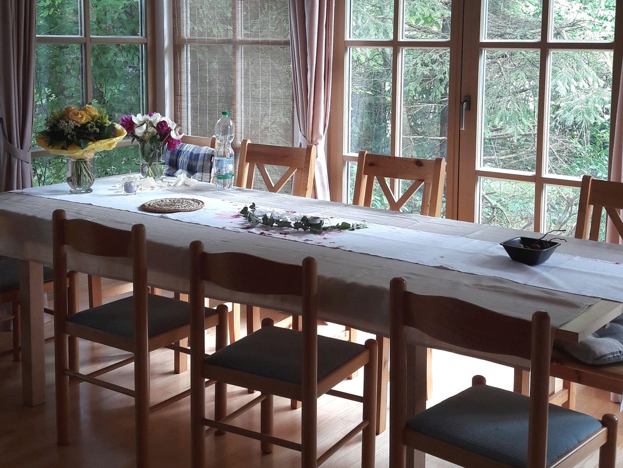 Komfortables, individuell eingerichtetes Nichtraucher-Ferienhaus mit großem Südostbalkon mit herrlichem Bergblick in sonniger östlicher Ortrandlage. Im Erdgeschoss befindet sich ein großzügiger, heller Wohnraum mit Schwedenofen, eine vollausgestattete Küche, ein Badezimmer mit großer Wanne und ein Schlafraum mit Doppelbett. Alle Räume verfügen über eine Terassentür zum Garten und Schallschutzfenster. Das Obergeschoss verfügt über einen großen Wohnraum mit Schlafsofa (für 2 Personen), Balkon, Wohnküche mit Essplatz, zwei gemütliche Schlafräume mit französischen Betten und Duschbad. Keine Haustiere erlaubt. Das Erdgeschoss ist Barrierefrei.