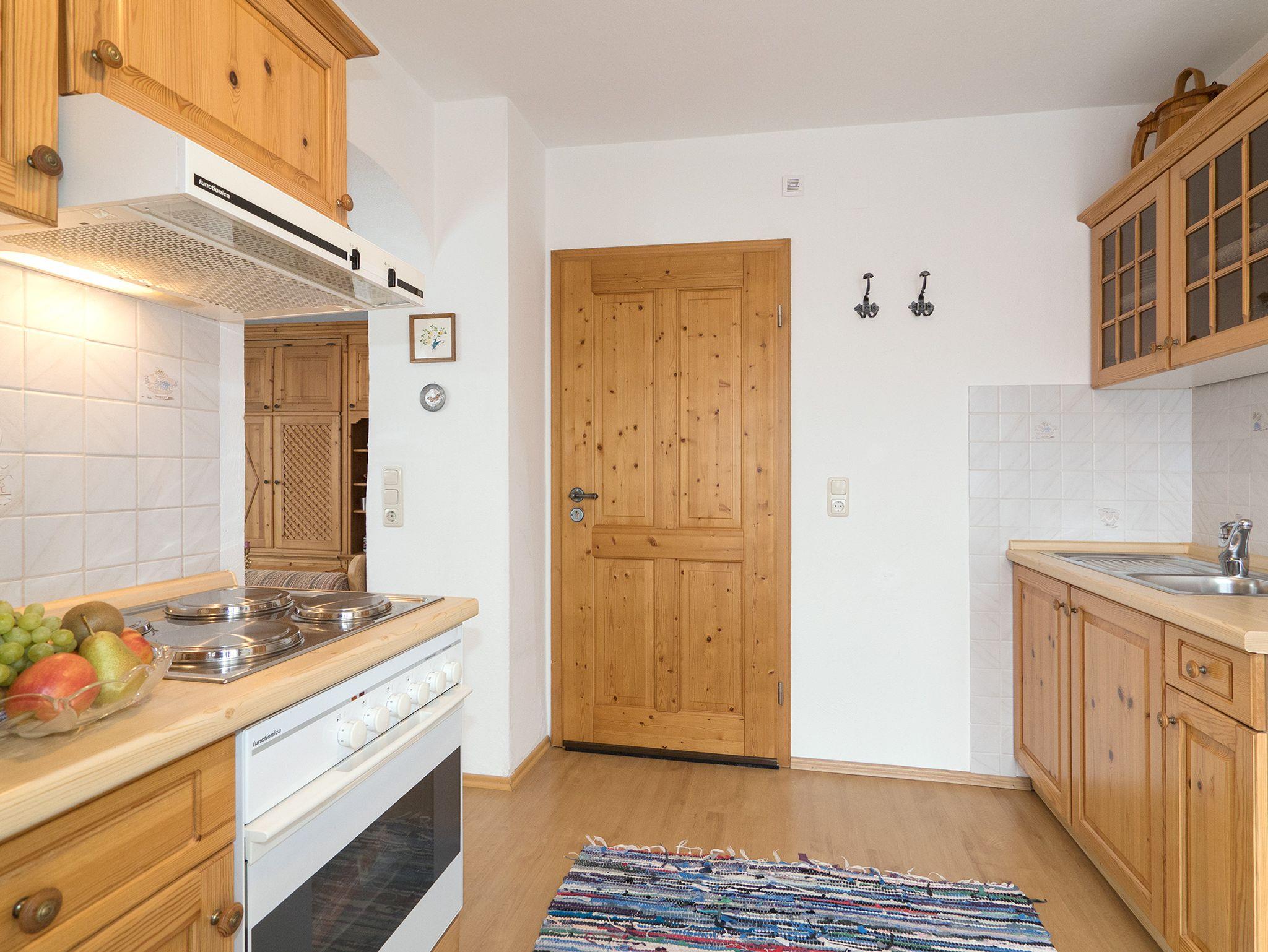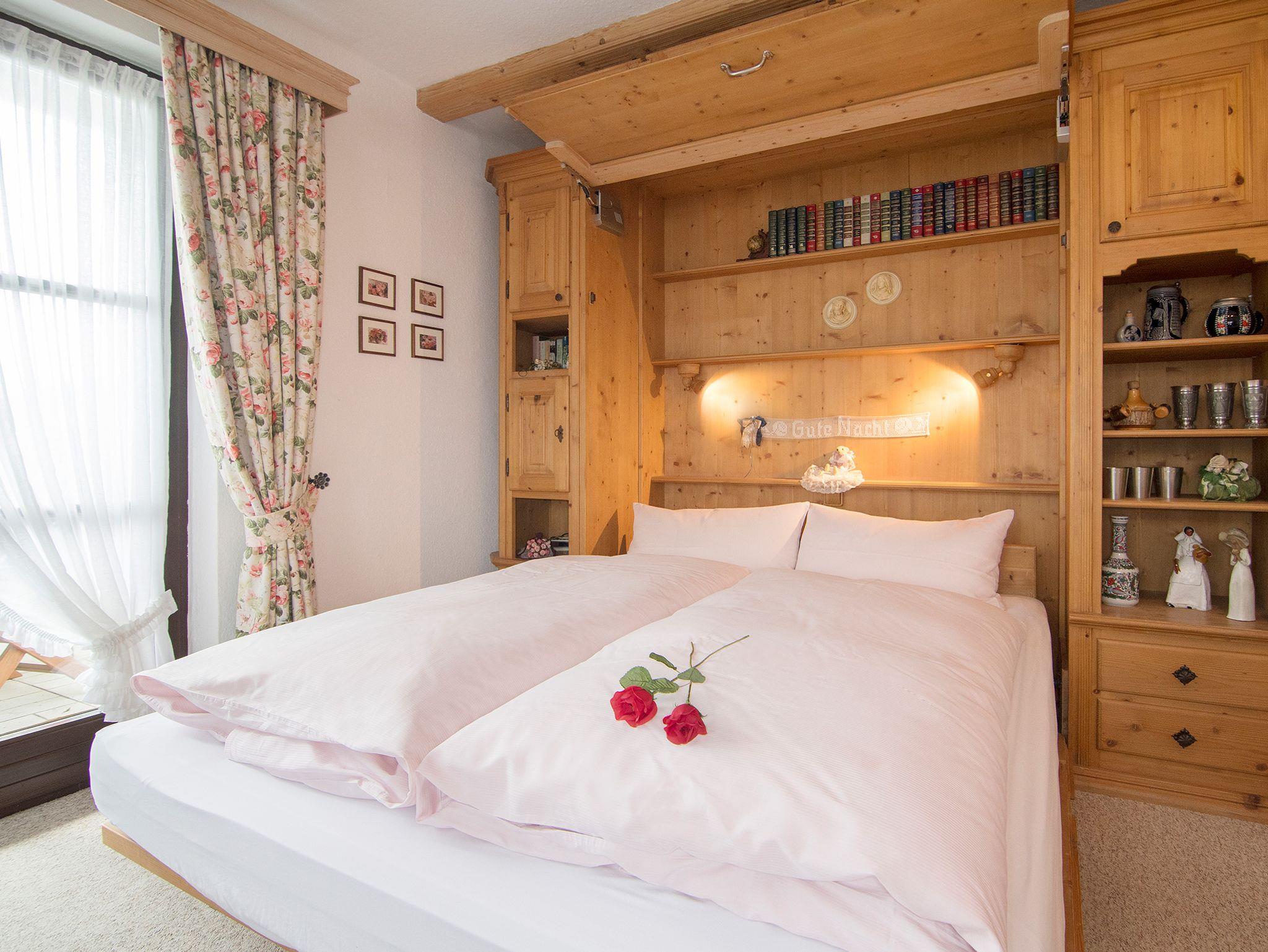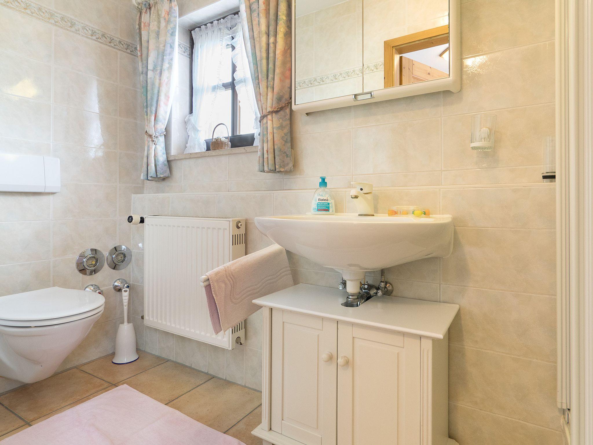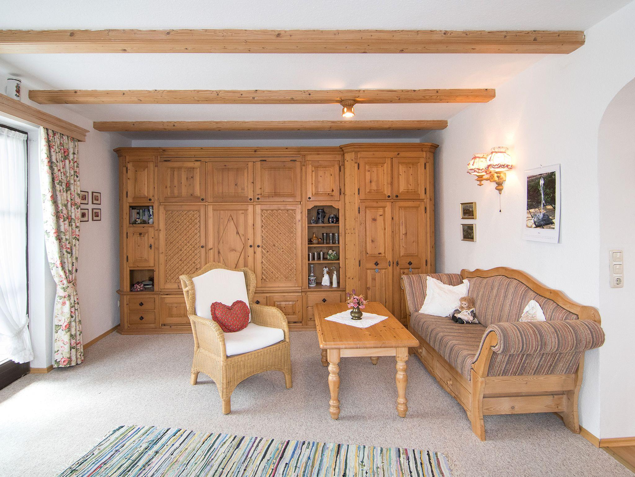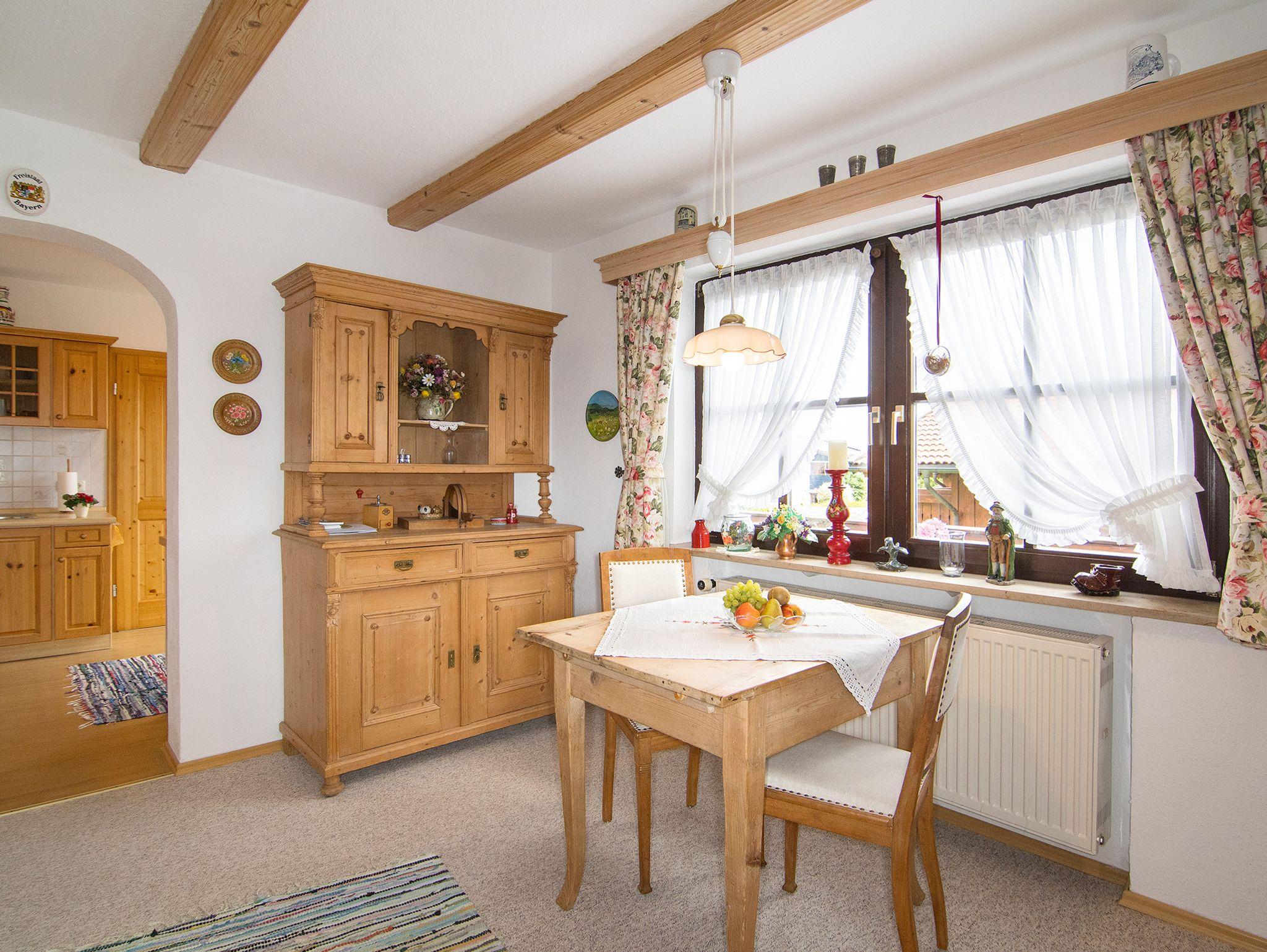Die 3* Sterne Wohnung befindet sich im 1. Stock mit ca. 40 m² Wohnfläche und unverbautem Südblick zum Kammerköhr, Winklmoosgebirge, Wilden Kaiser und im Westen zur Hochplatte (1587m). Die Wohnung besteht aus einem Wohnzimmer mit einem 1,60 x 2,00 m ausklappbarem Schrankwandbett und, durch einen Rundbogen abgeteilten sehr gut ausgestatteter Holzküche mit 4 Elektrokochplatten, Backofen, Dunstabzug und Kühlschrank mit Tiefkühlfach, Kaffeefiltermaschine, Wasserkocher, Toaster, sowie Geschirrtücher. Dusche und WC mit Fenster, sowie Hand- u. Badetücher, Pflegeprodukte, Kosmetiktücher und Toilettenpapier sind auch vorhanden. Zur Wohnung gehört ein Balkon mit Tischen und Stühlen mit Polstern. Kabel-TV (Flachbildschirm) mit Vodafone GigaTV Home/ DAB-Radio und kostenloses WLAN. An allen Fenstern und Türen sind Fliegengitter. Parkplätze am Haus/Hof oder unmittelbar vor dem Haus und ein überdachter Fahrrad-Unterstand ist ebenfalls vorhanden. Außerdem steht ein Holzkohlegrill und ein Gartenpavillon mit Sitzgelegenheit zur Allgemeinbenutzung zur Verfügung. Keine Haustiere! Nichtraucher in den Fewo's, auf Balkon, Terrasse oder Garten möglich!
