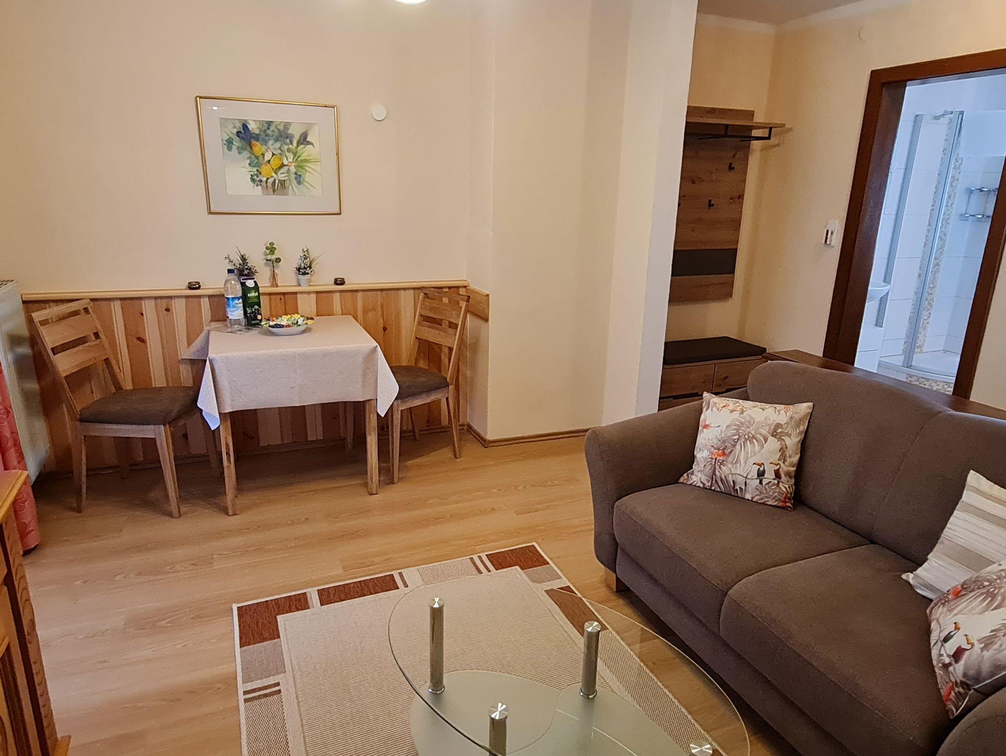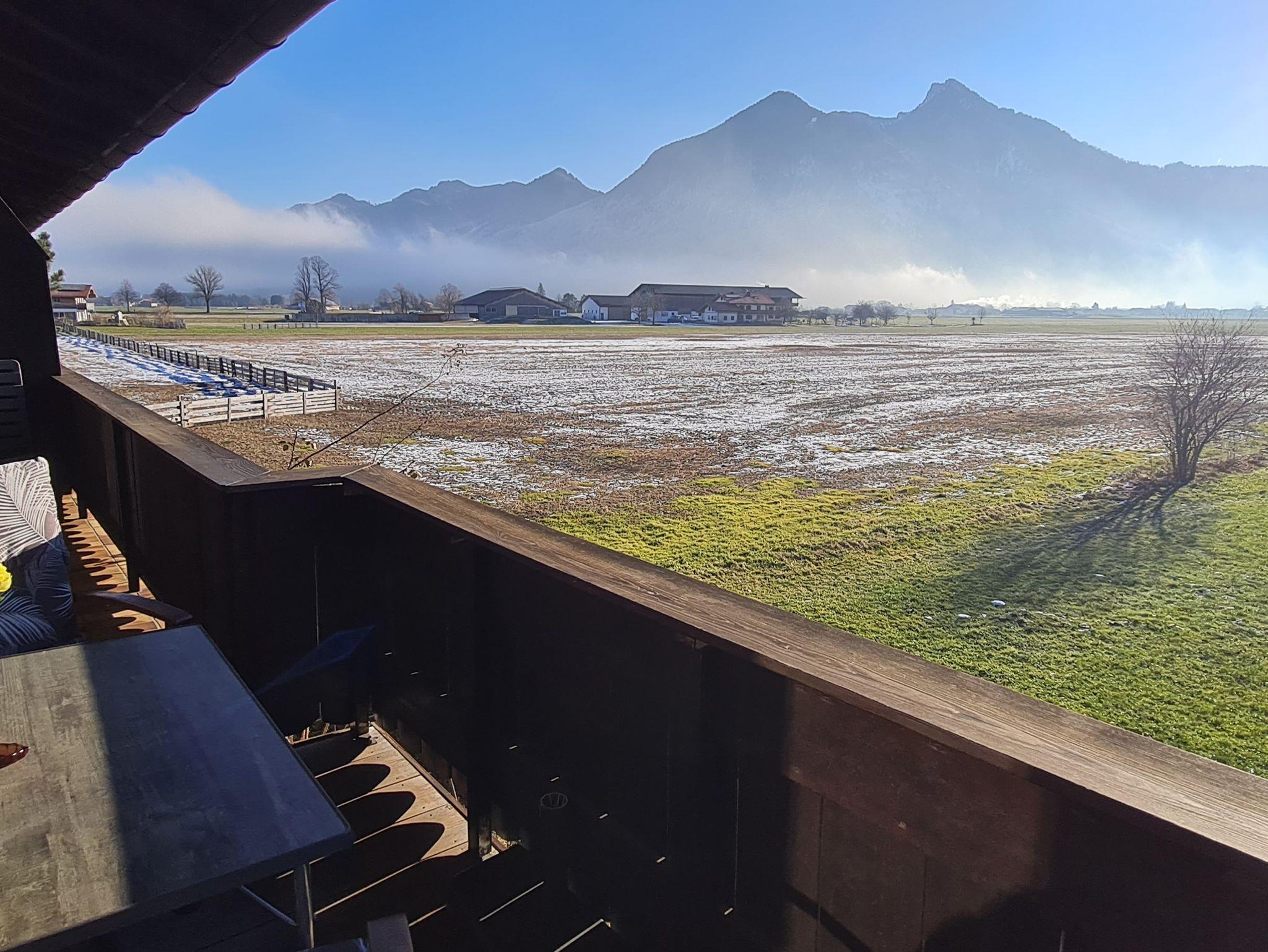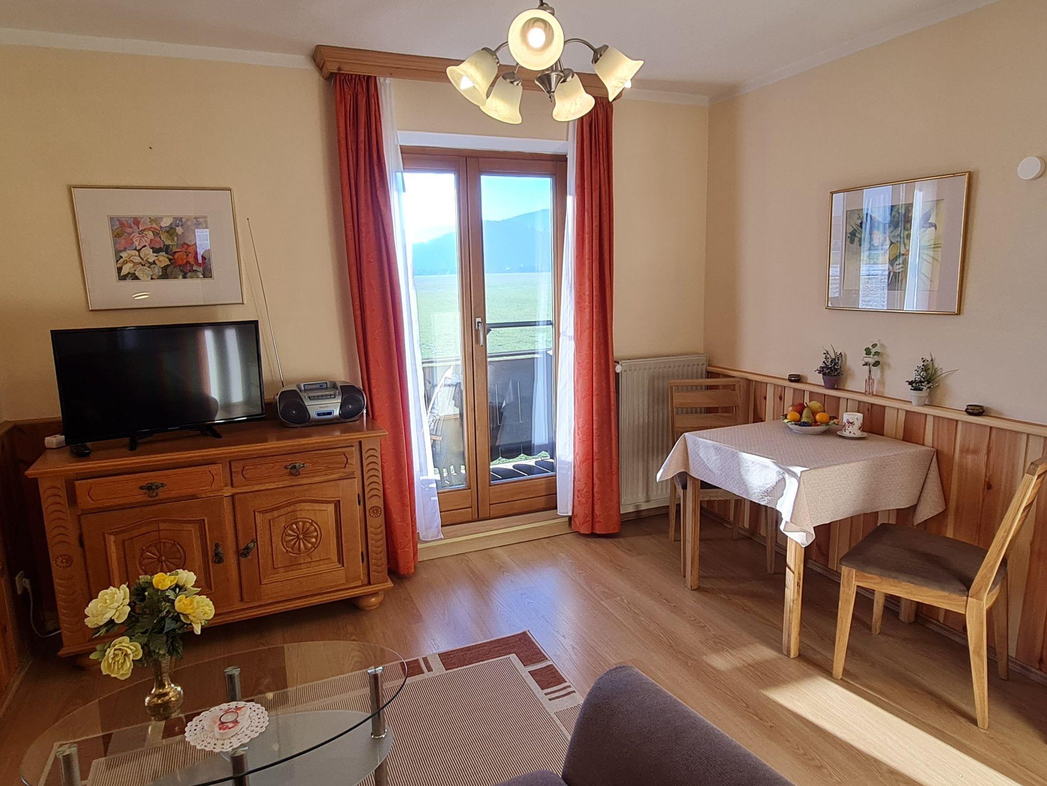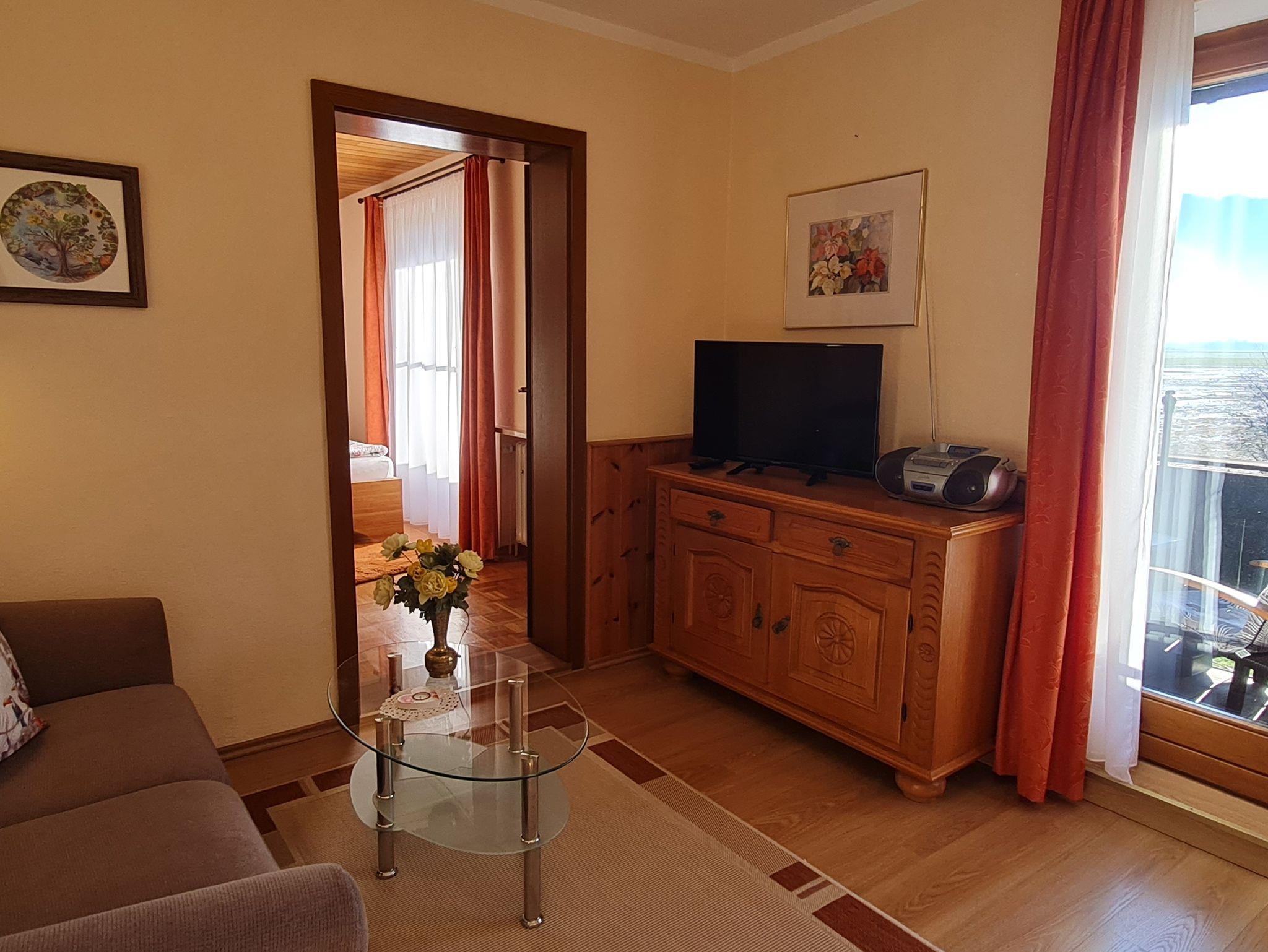 Sehr ruhig gelegene, gemütliche Ferienwohnung mit kleiner, separater Küche, ausgestattet mit neuer Einbauküche, Cerankochfeld mit Backofen und Kühlschrank mit Gefrierfach, gemütliches Wohnzimmer mit Couch und neuem Fernseher mit SAT-TV Anschluss und Zugang zum Südbalkon mit traumhaft freiem Bergblick über Wiesen und Felder. Separates Schlafzimmer mit einem 160x200cm großen Doppelbett für 2 Personen. Neues Badezimmer mit Dusche und WC. WLAN kostenlos.