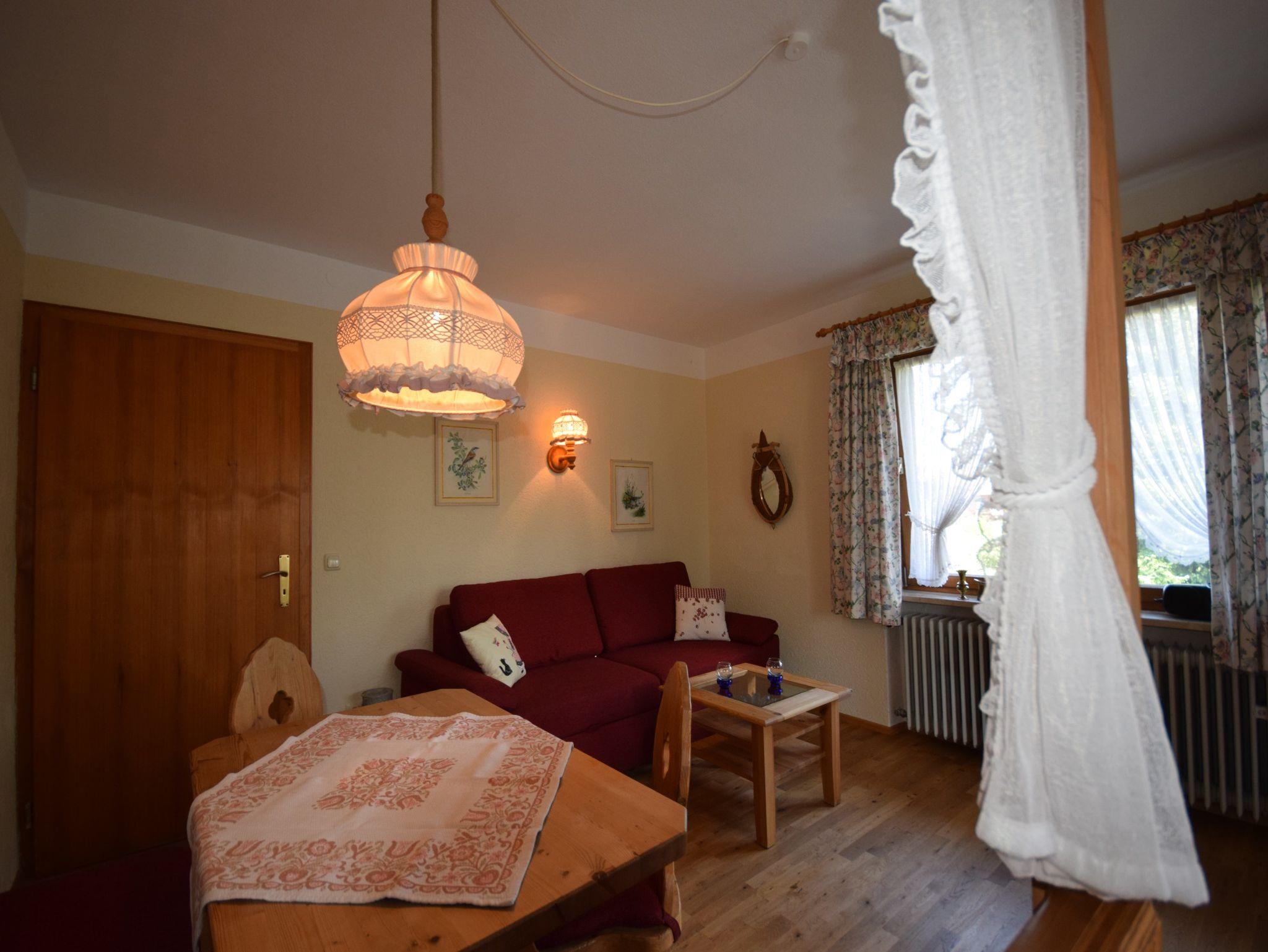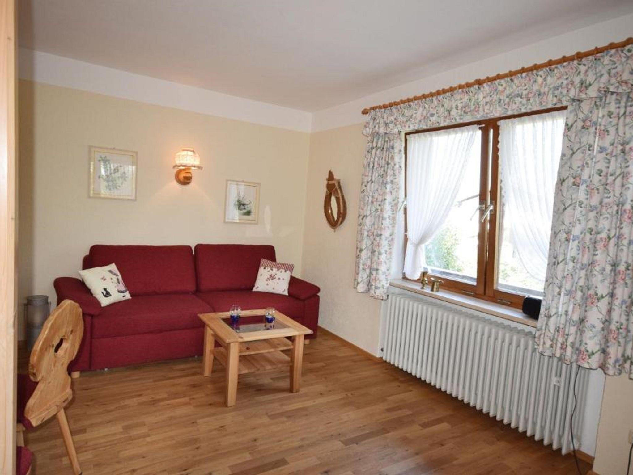Komfortabel eingerichtete Ferienwohnung im Landhausstil mit sonnigem Süd-Ostbalkon. Wohn-Schlafraum mit ausziehbarer Schlafcouch; Kabel-TV mit Flachbildschirm 32 Zoll und Kochnische mit 2 Plattenherd und Mikrowelle. Separates Schlafzimmer mit Doppelbett. Badezimmer mit Badewanne, Dusche und WC; Vergrößerungsspiegel und Fön.Haustier gegen Gebühr erlaubt.