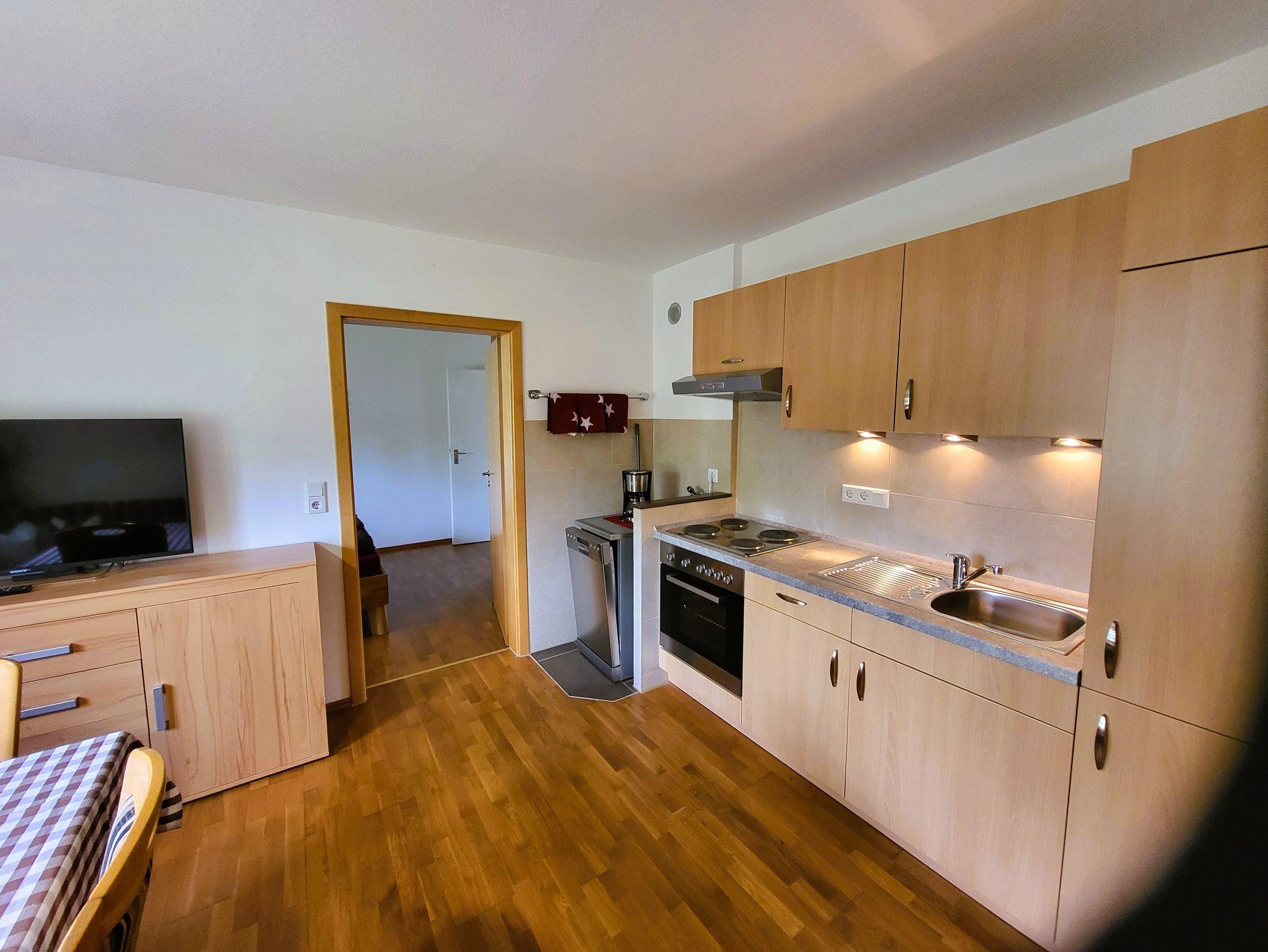 Wohnküche, Tisch mit Sitzmöglichkeiten, TV. ( Die Bilder sind noch von der alten Küche. Die neuen Bilder werden ab Mai 26 eingestellt. )