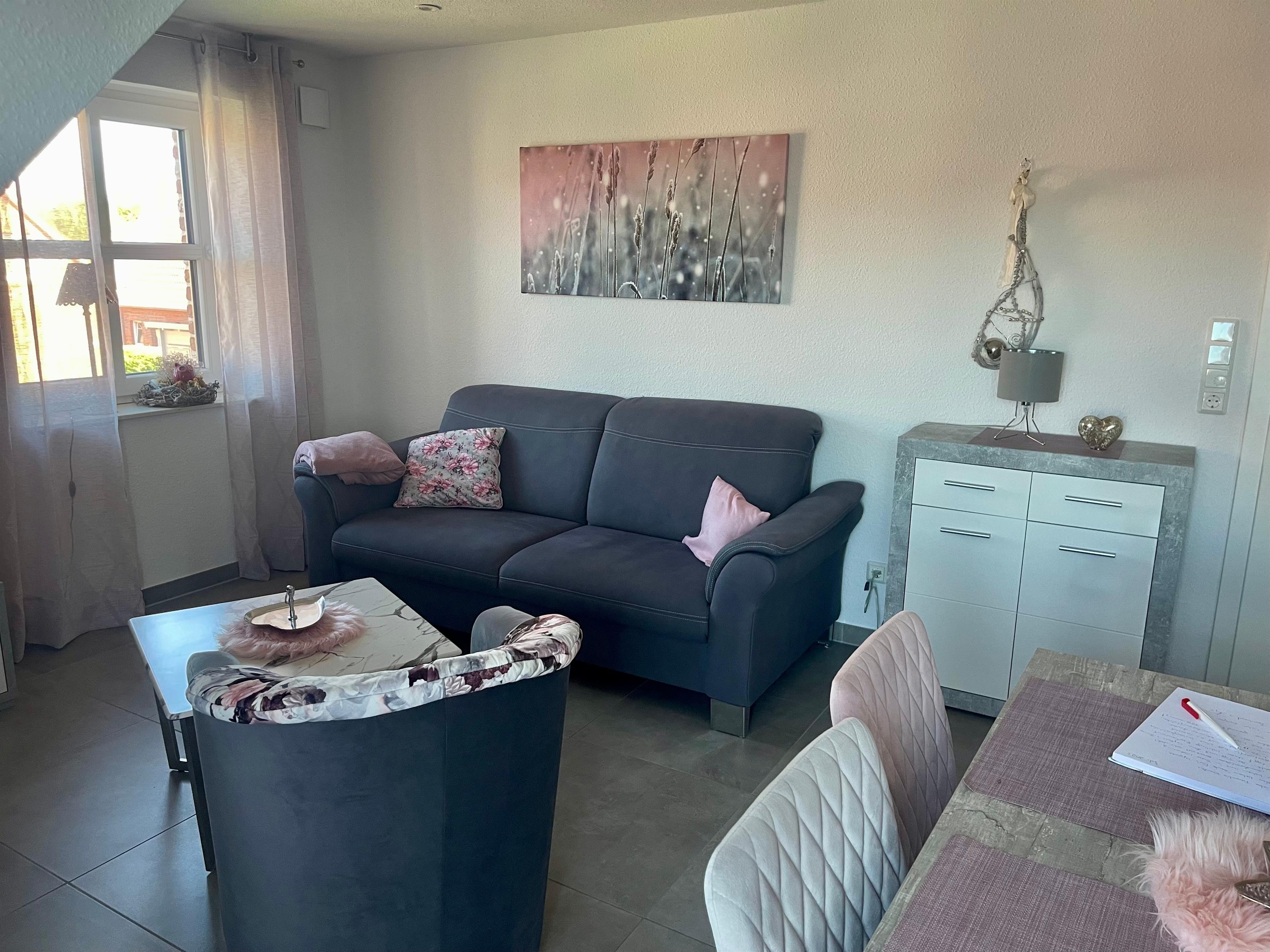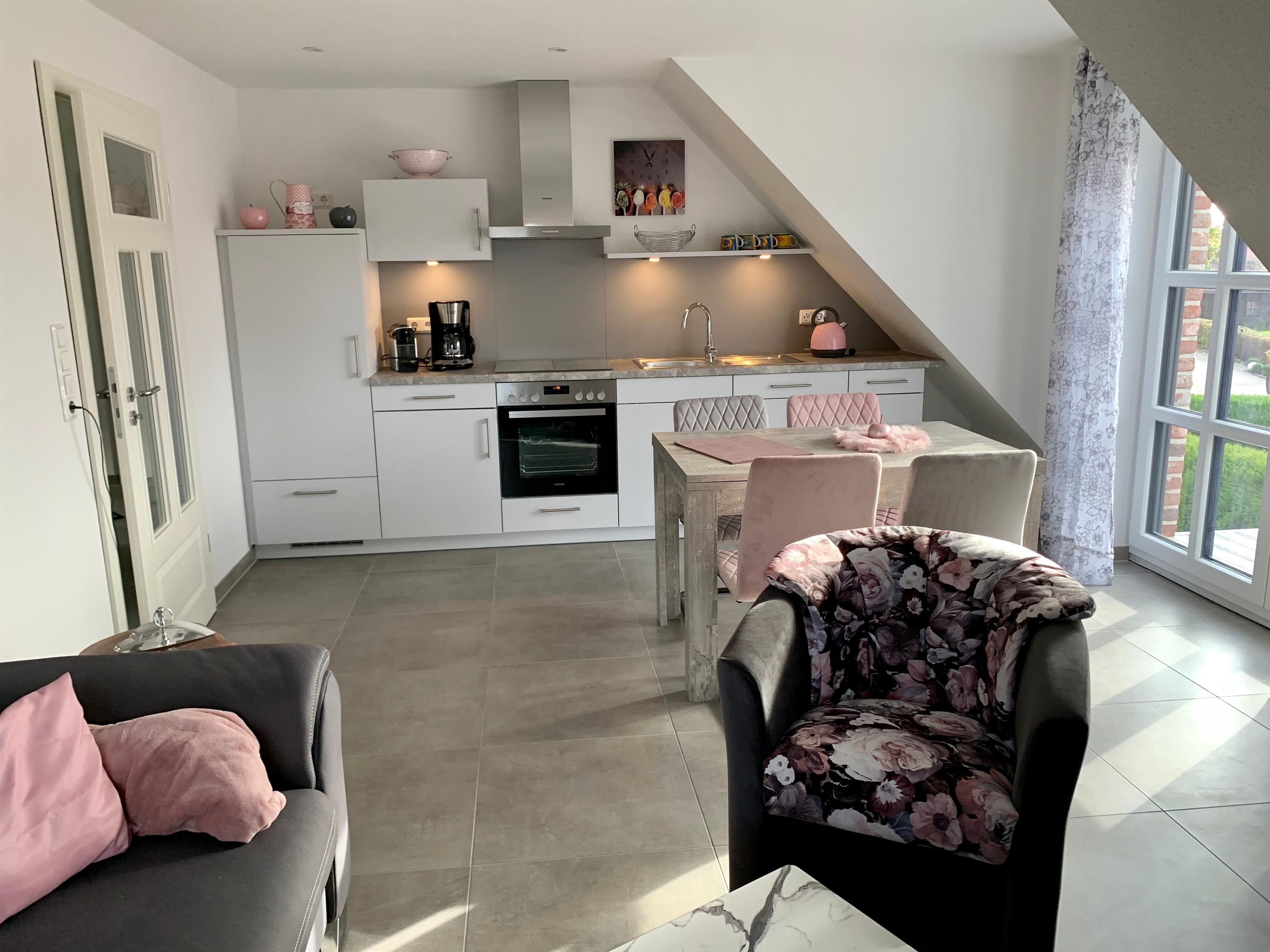Ein geschmackvoll und liebevoll eingerichteter Wohnraum mit Sofa und Sessel sowie einer komplett ausgestatteten Küche, bietet alles für erholsame Urlaubstage.