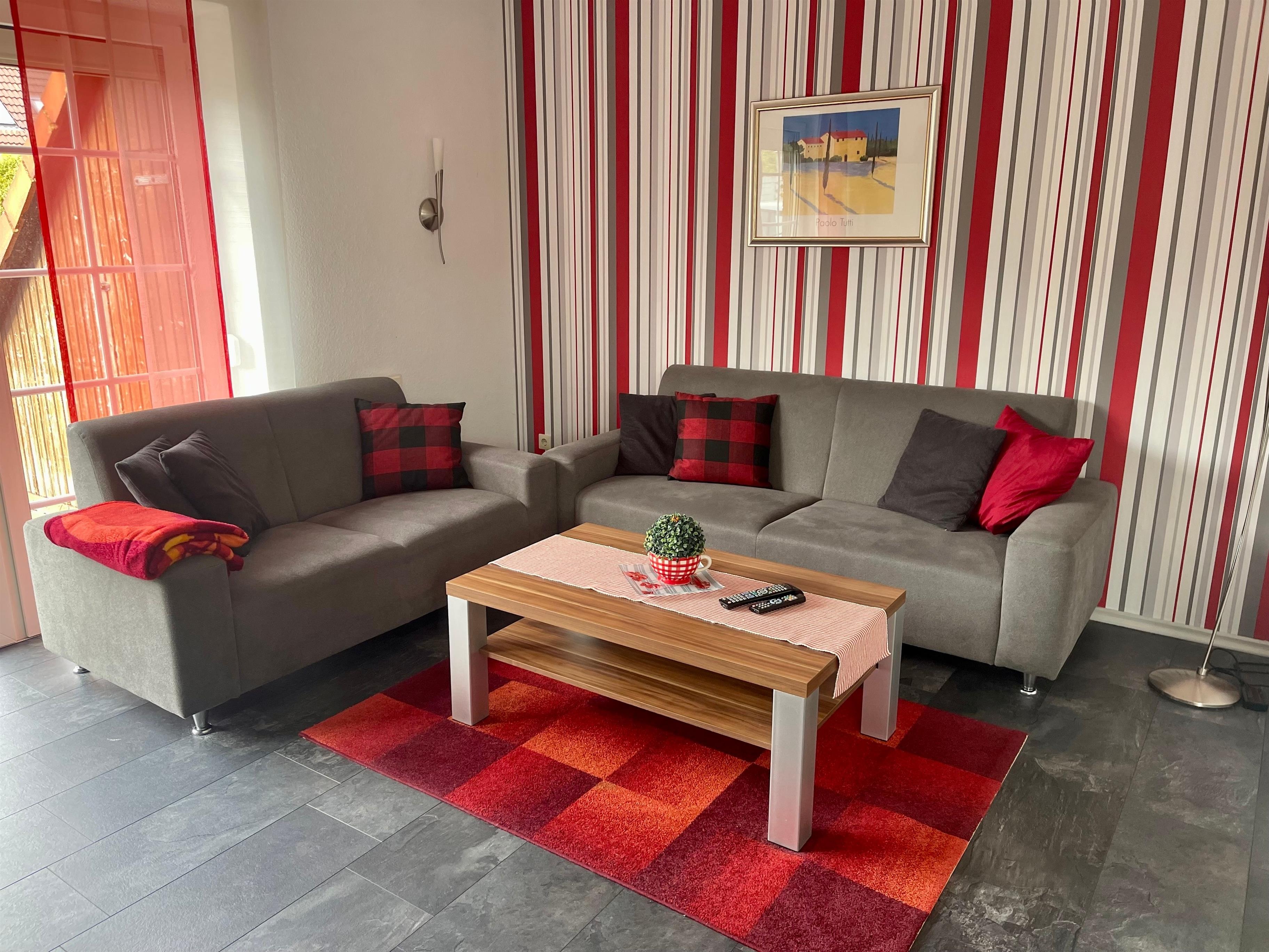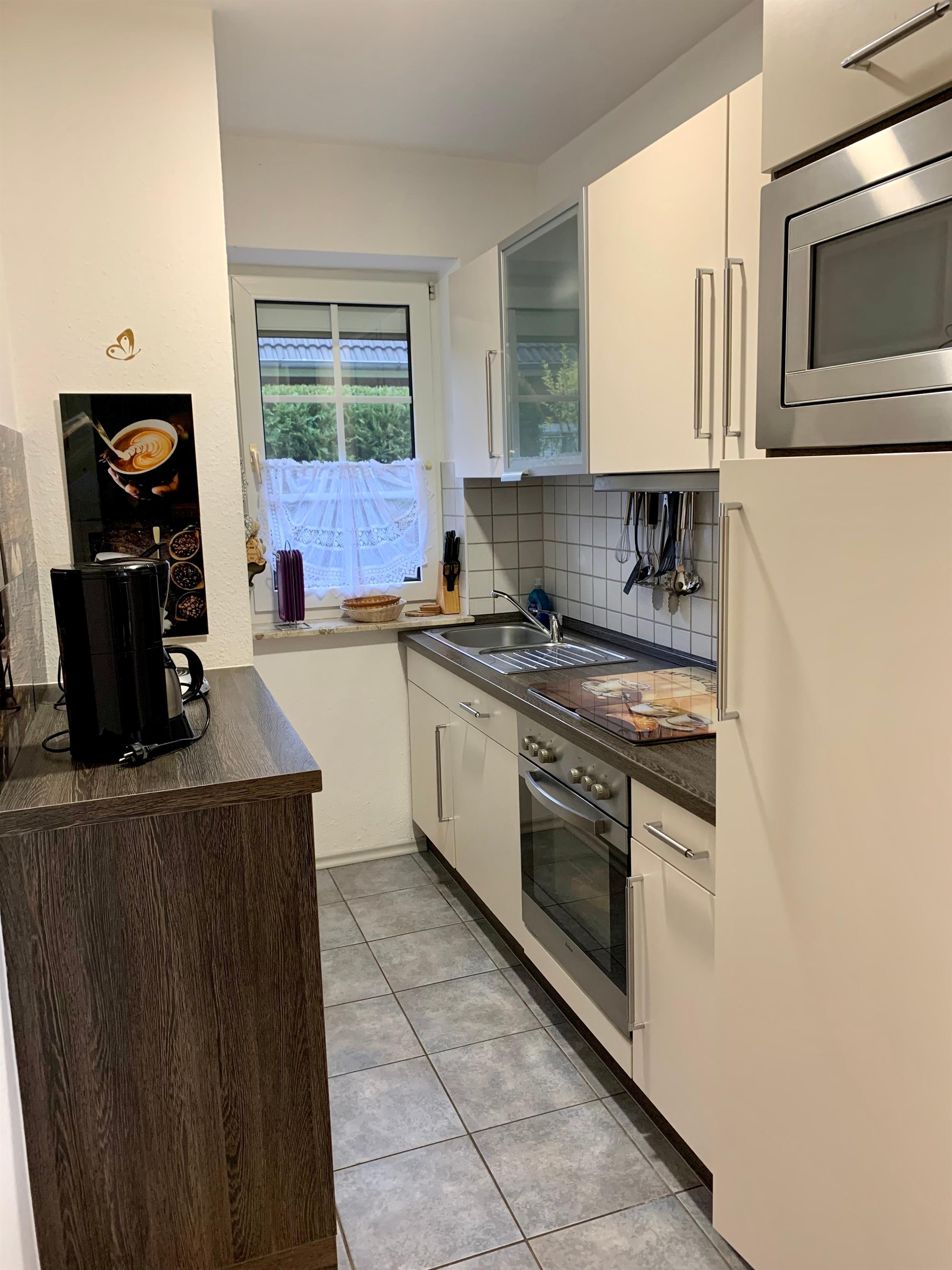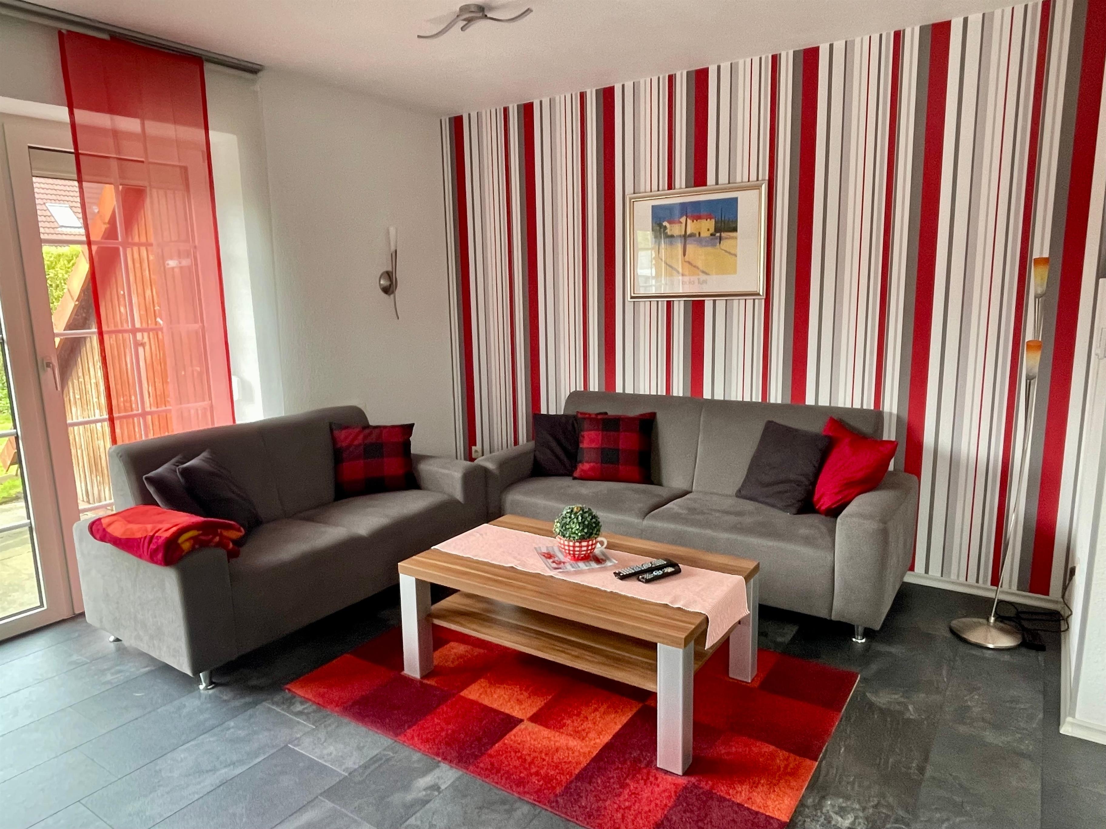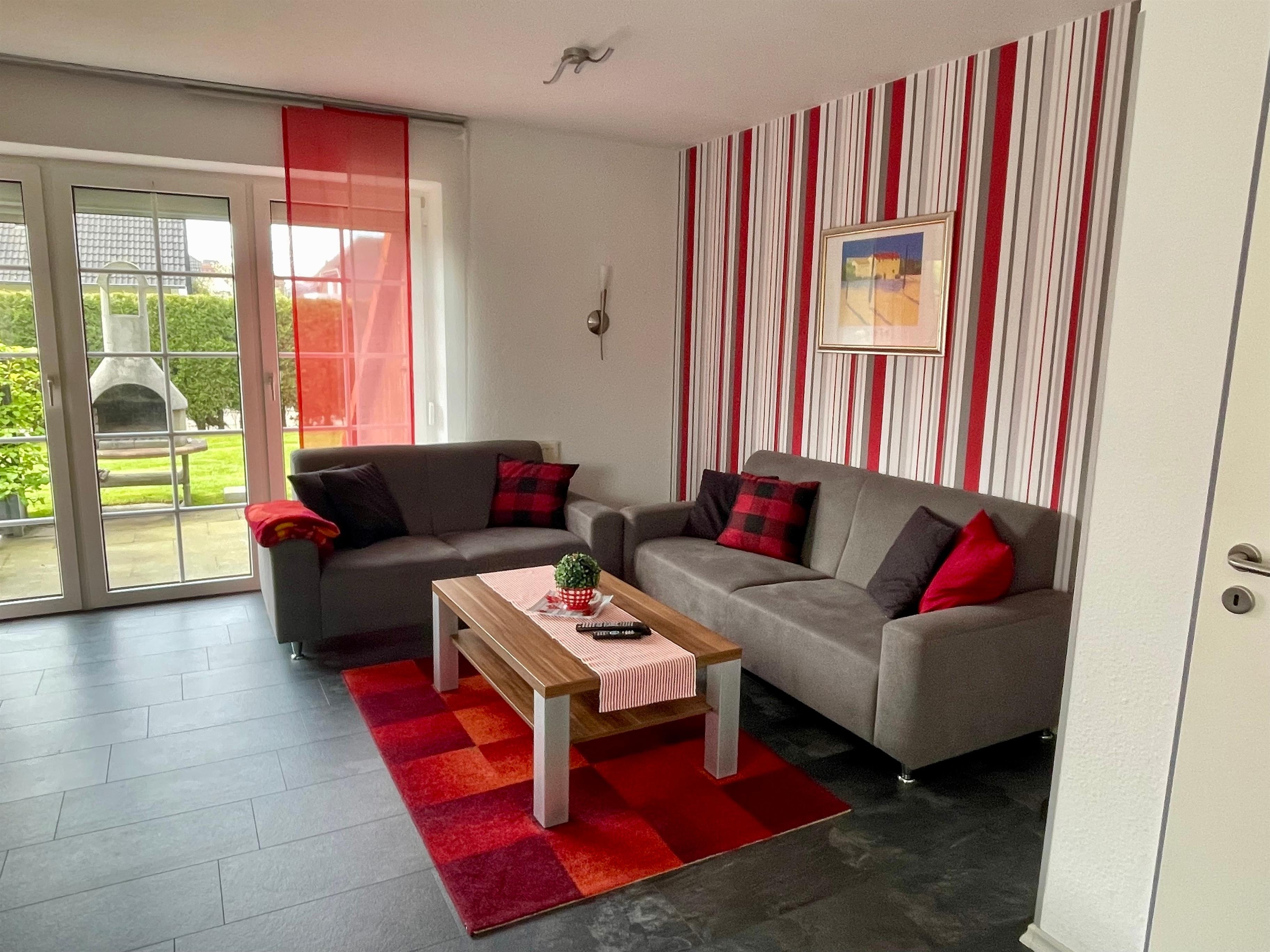Eine kompl. ausgestattete moderne Küche, ein heller freundlicher Wohn-Essraum mit gemütlichen Sofas u. Sessel sowie einem Essplatz und Ausgang zur Terrasse u. Garten.