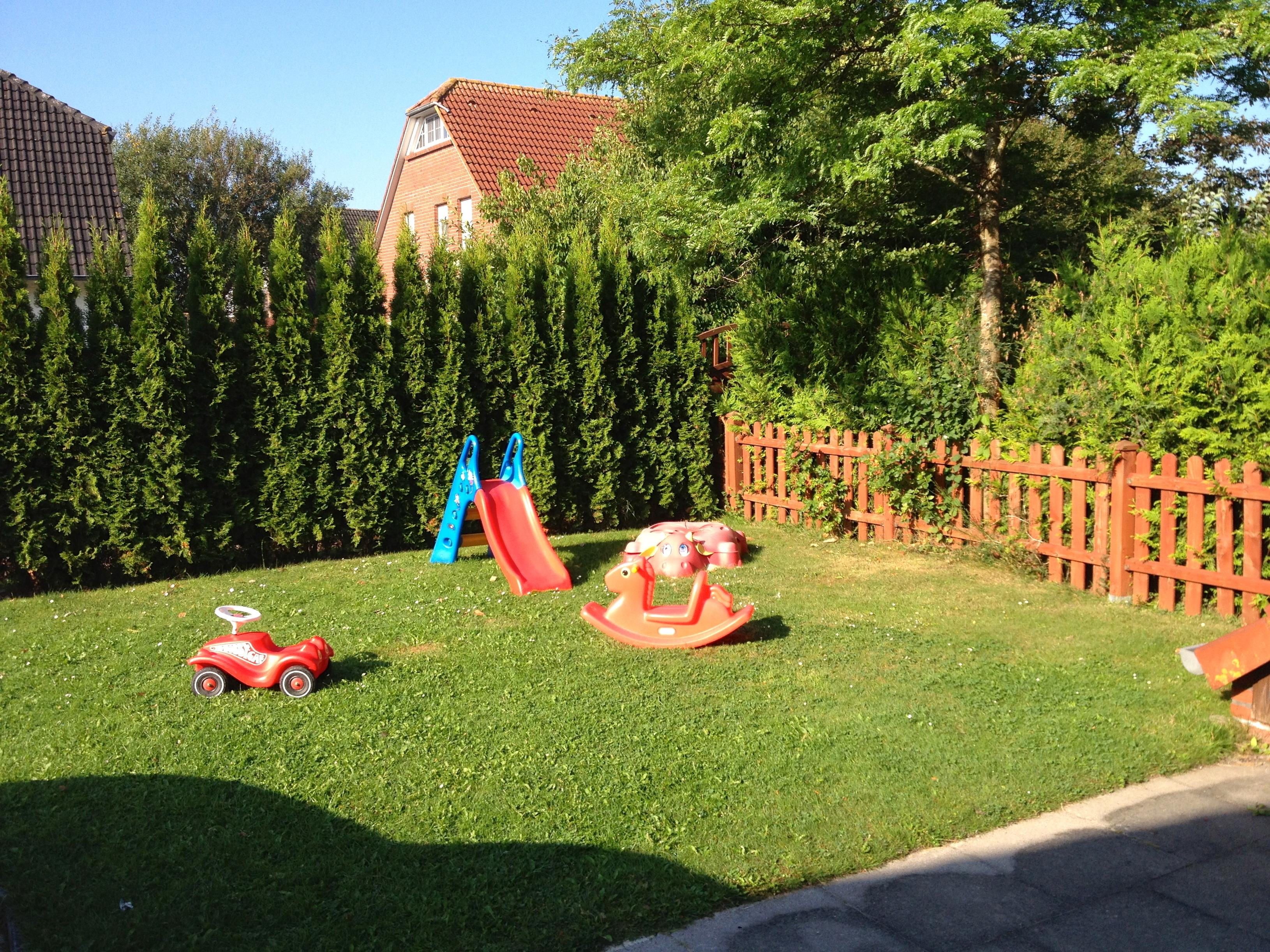 Im Garten haben wir für unsere kleinen Gäste eine Rutsche, Bobbycar und anderes Spielzeug. Terrasse mit Gartenmöbeln und Grill.