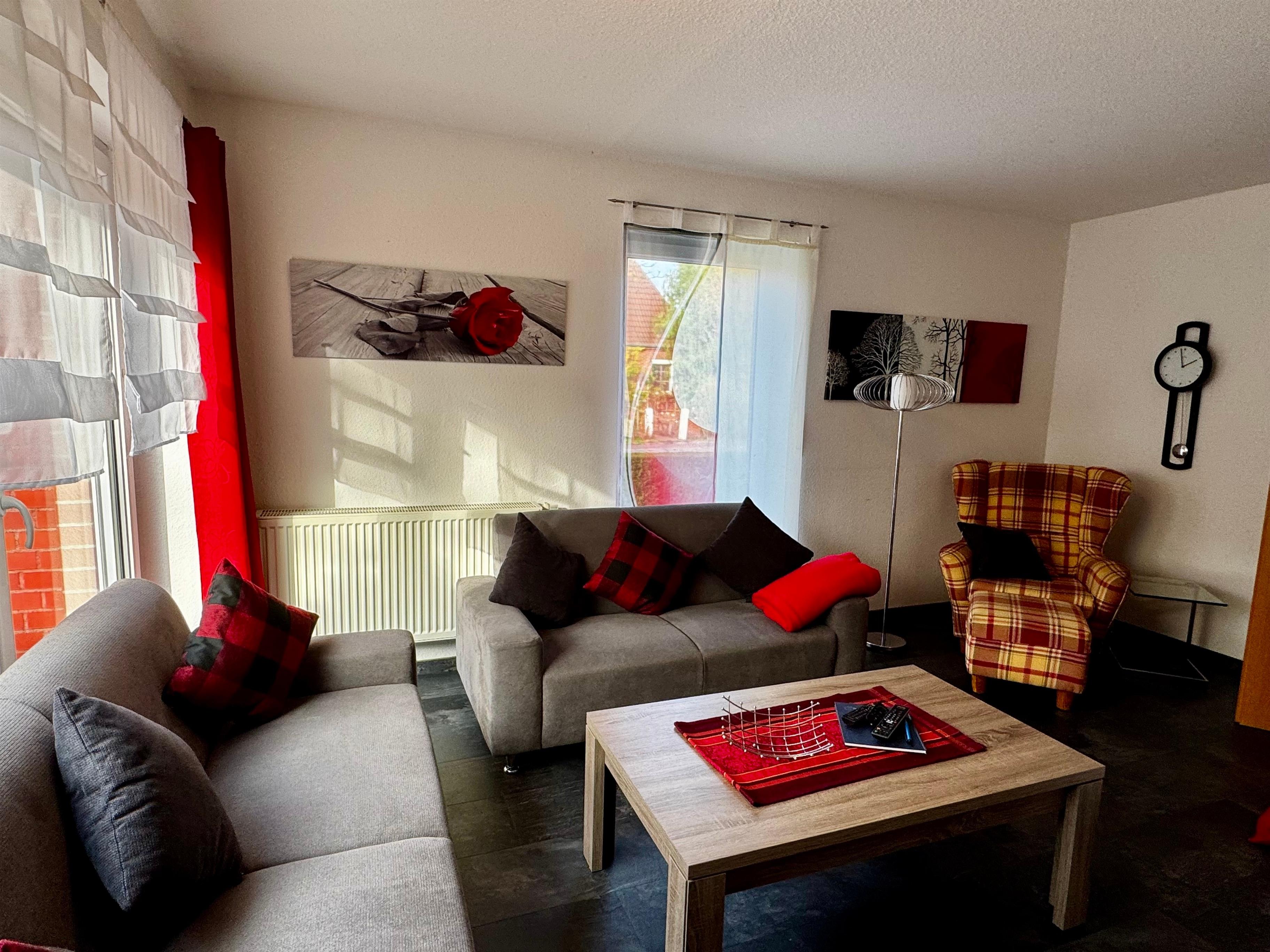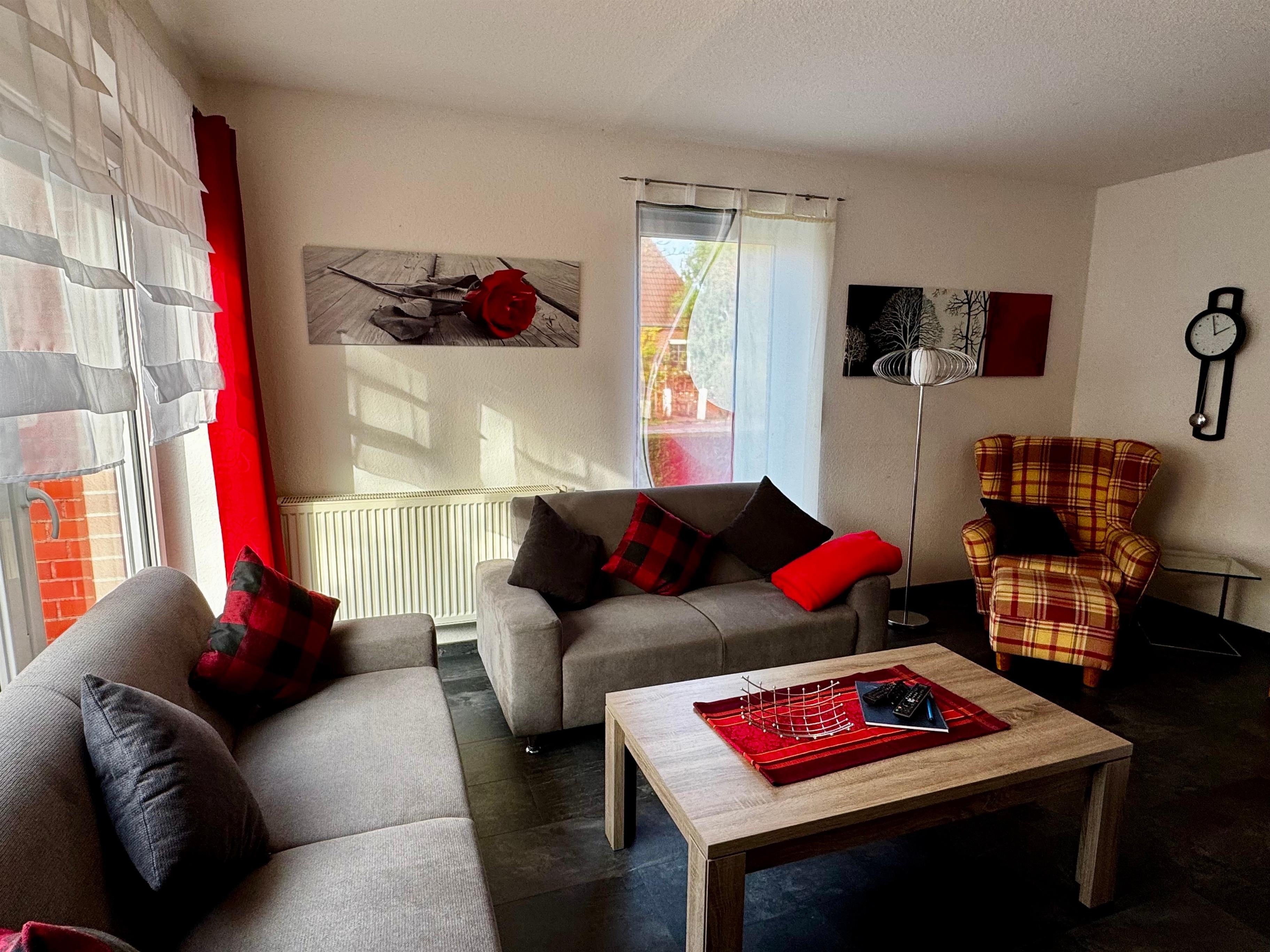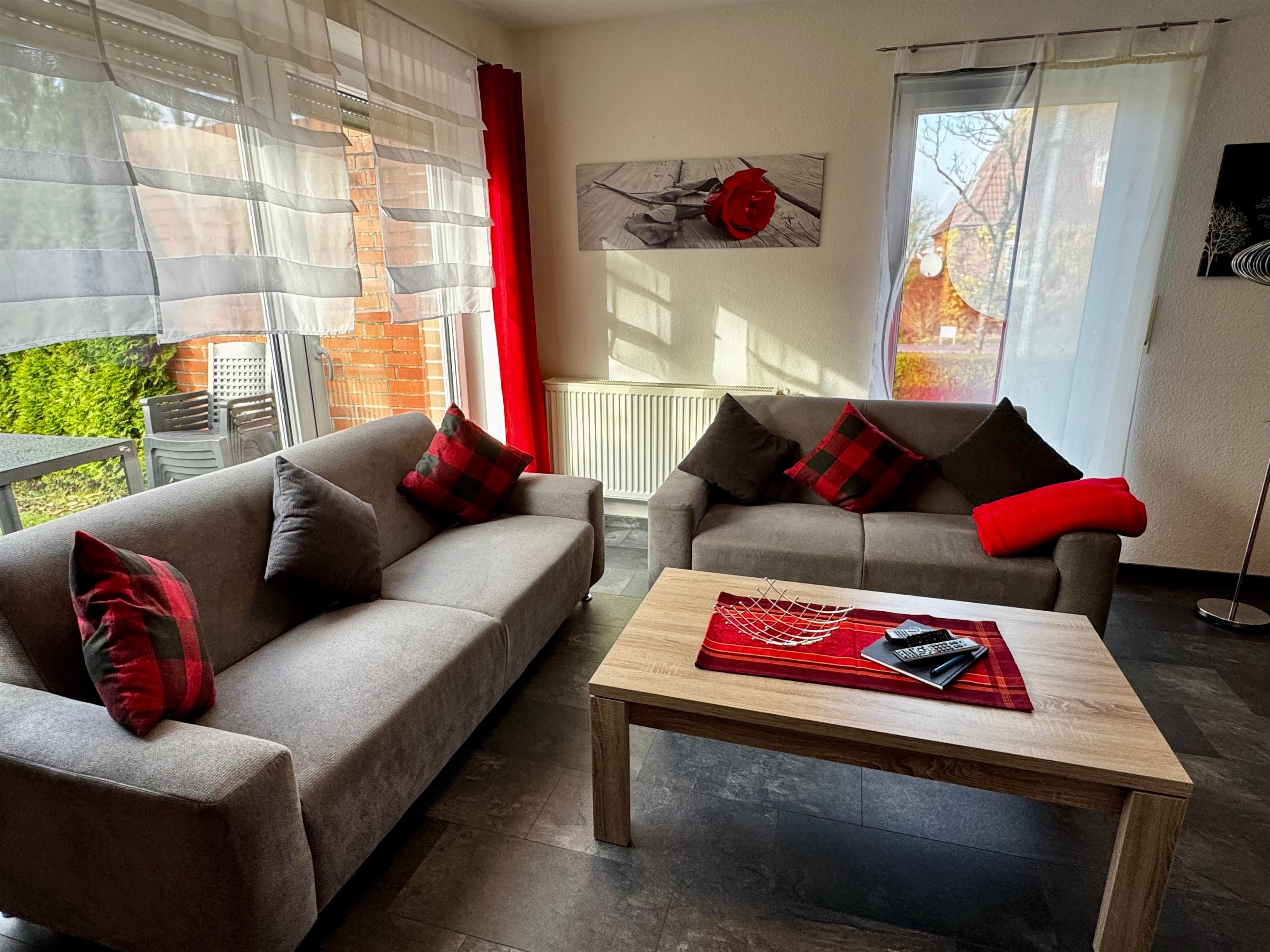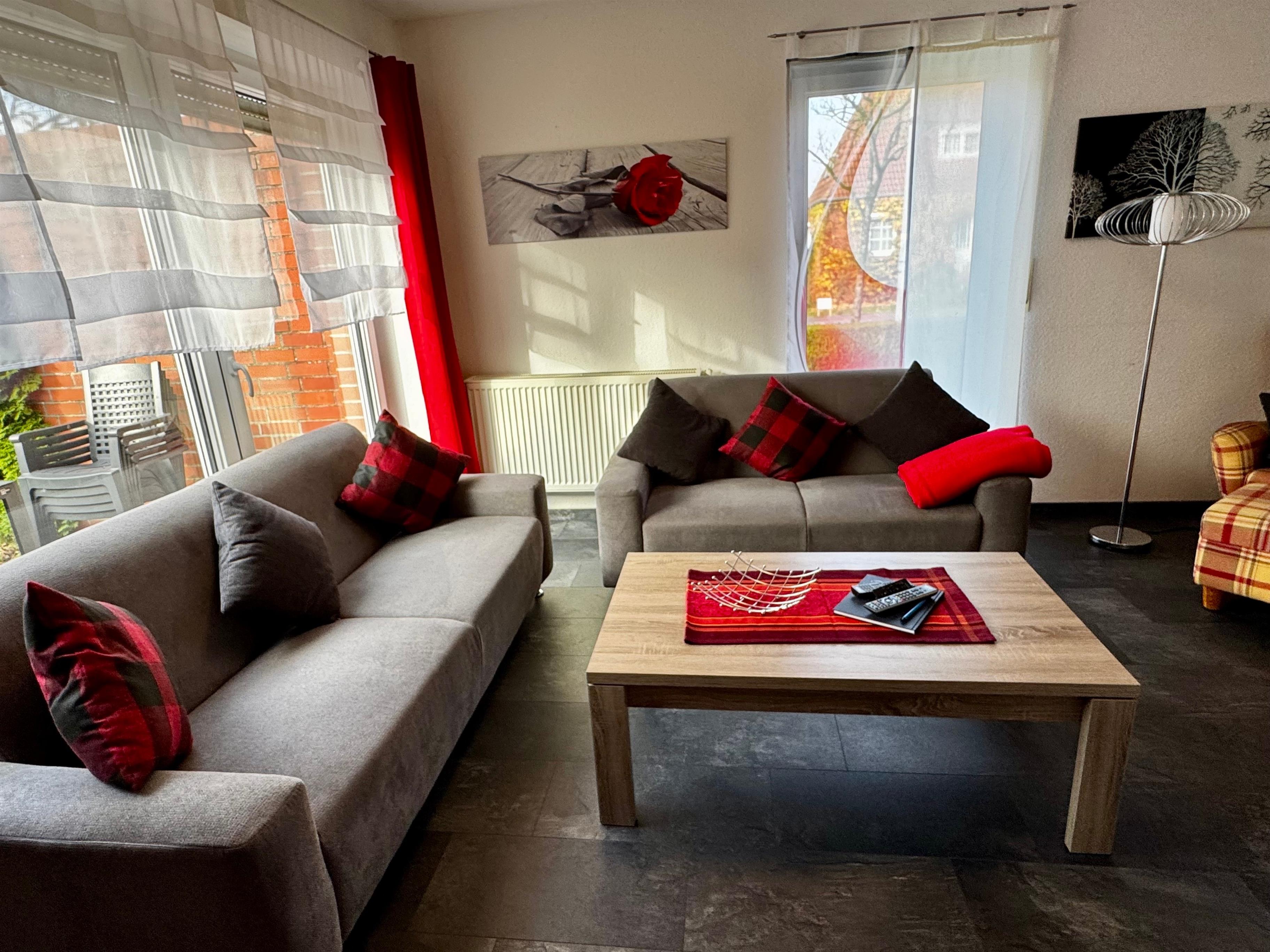 Geradeaus liegt das modern eingerichtete Wohnzimmer mit großen Panoramafenstern, die eine schöne Aussicht in den Garten ermöglichen. Während an den wärmeren Tagen die Terrasse und der Garten zum Entspannen oder zum Grillen einladen, ist es an kühleren Tagen im Wohnraum mit schönen Sofas zu richtig gemütlich bei einer Tasse ostfriesischem Tee.