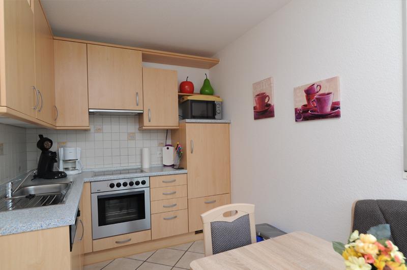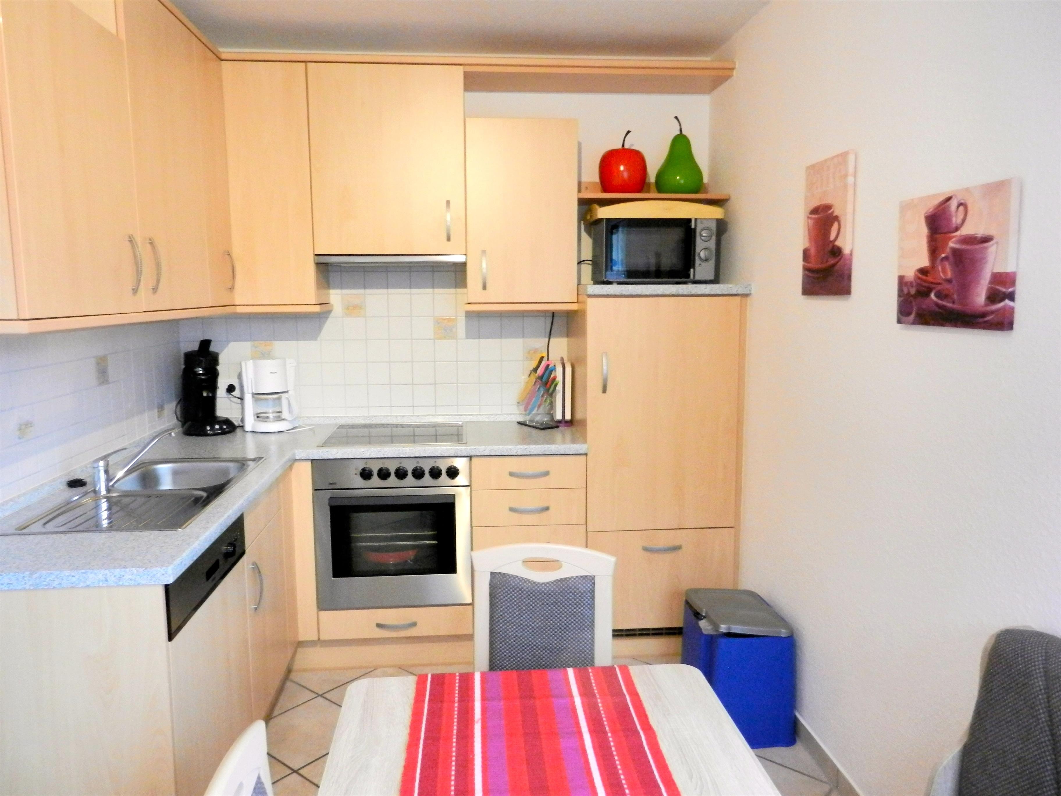 Die moderne helle Einbauküche ist mit Spülmaschine, Mikrowelle, Senseo-Padmaschine, Kaffeemaschine, Heißwasserbereiter und allen nötigen Küchenhelfern ausgestattet.