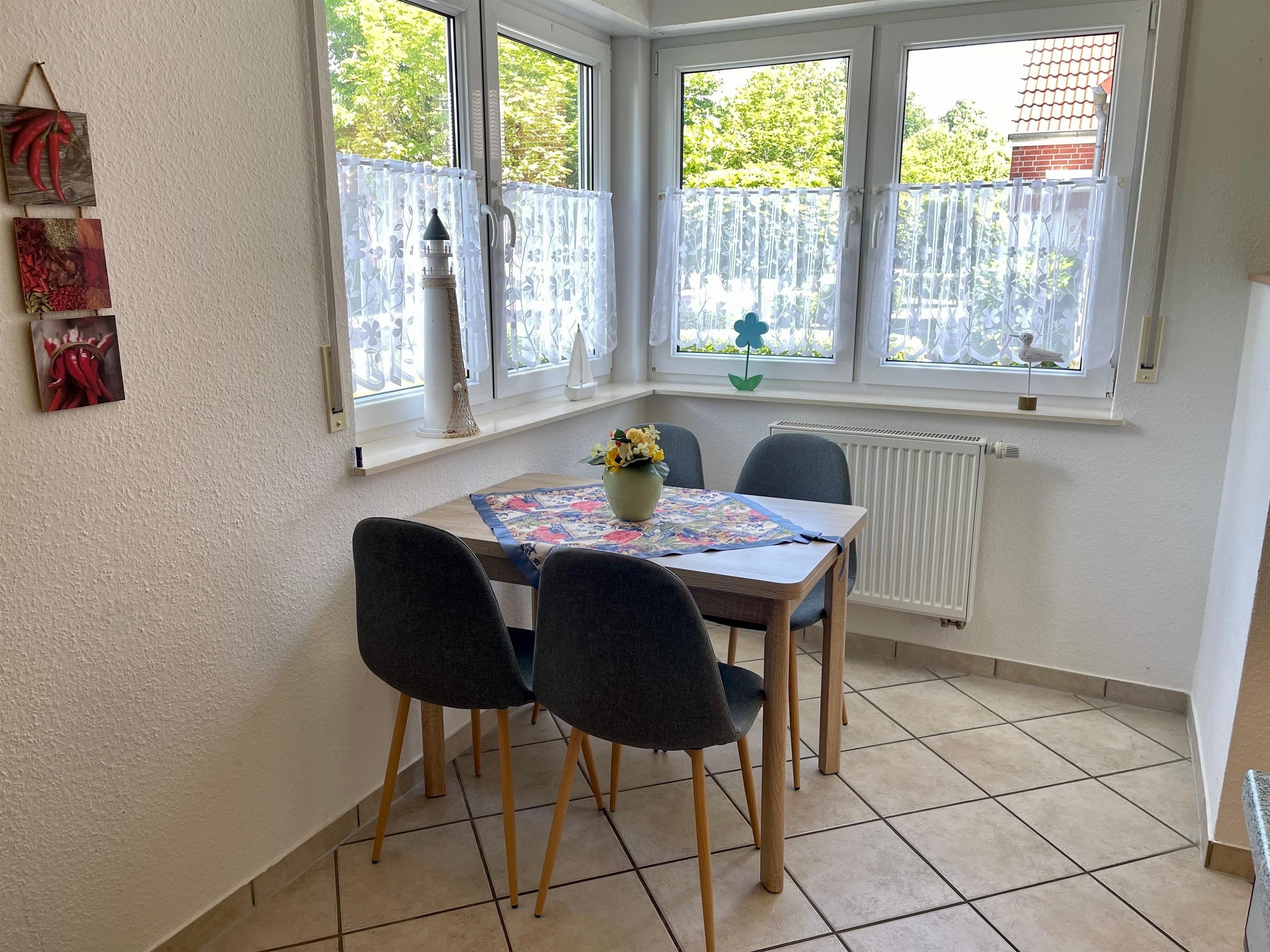 Ein schöner Eßplatz für das gemütliche Ferienfrühstück befindet sich am großen Eckfenster.