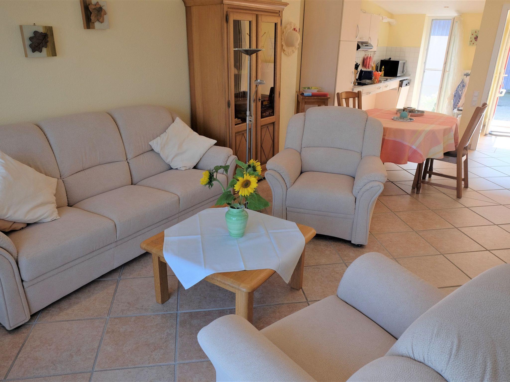 Eigene Terrasse mit Liegestühlen, Strandkorb, Gartentisch und Stühle, Sonnenschirm. Abschließbarer gemeinschaftlich genutzter Fahrradraum mit Auflademöglichkeit f. E - Bikes und Rollstuhl. Ebenerdig. Großer Garten und große Spielwiese gemeinschaftlich.