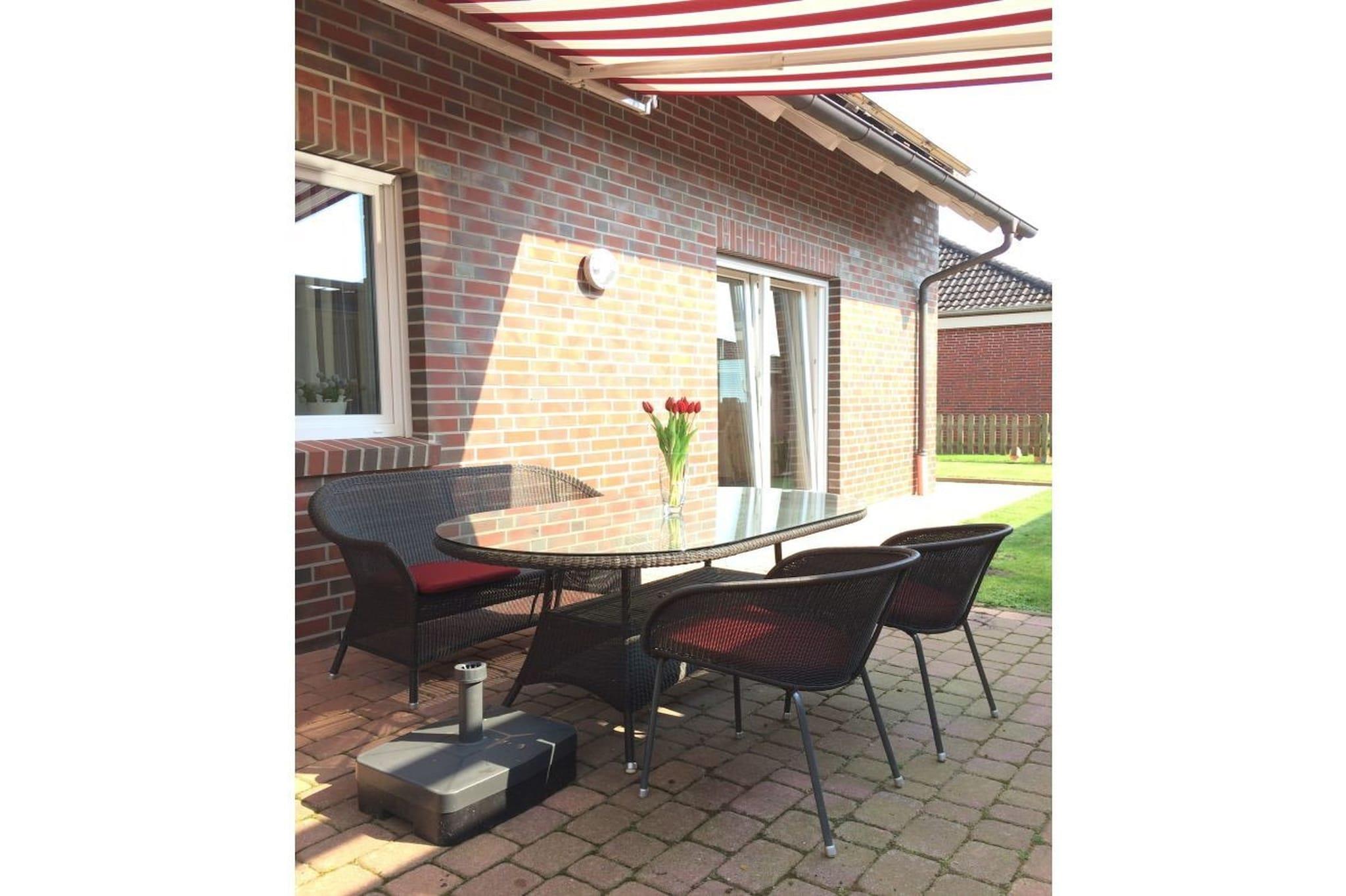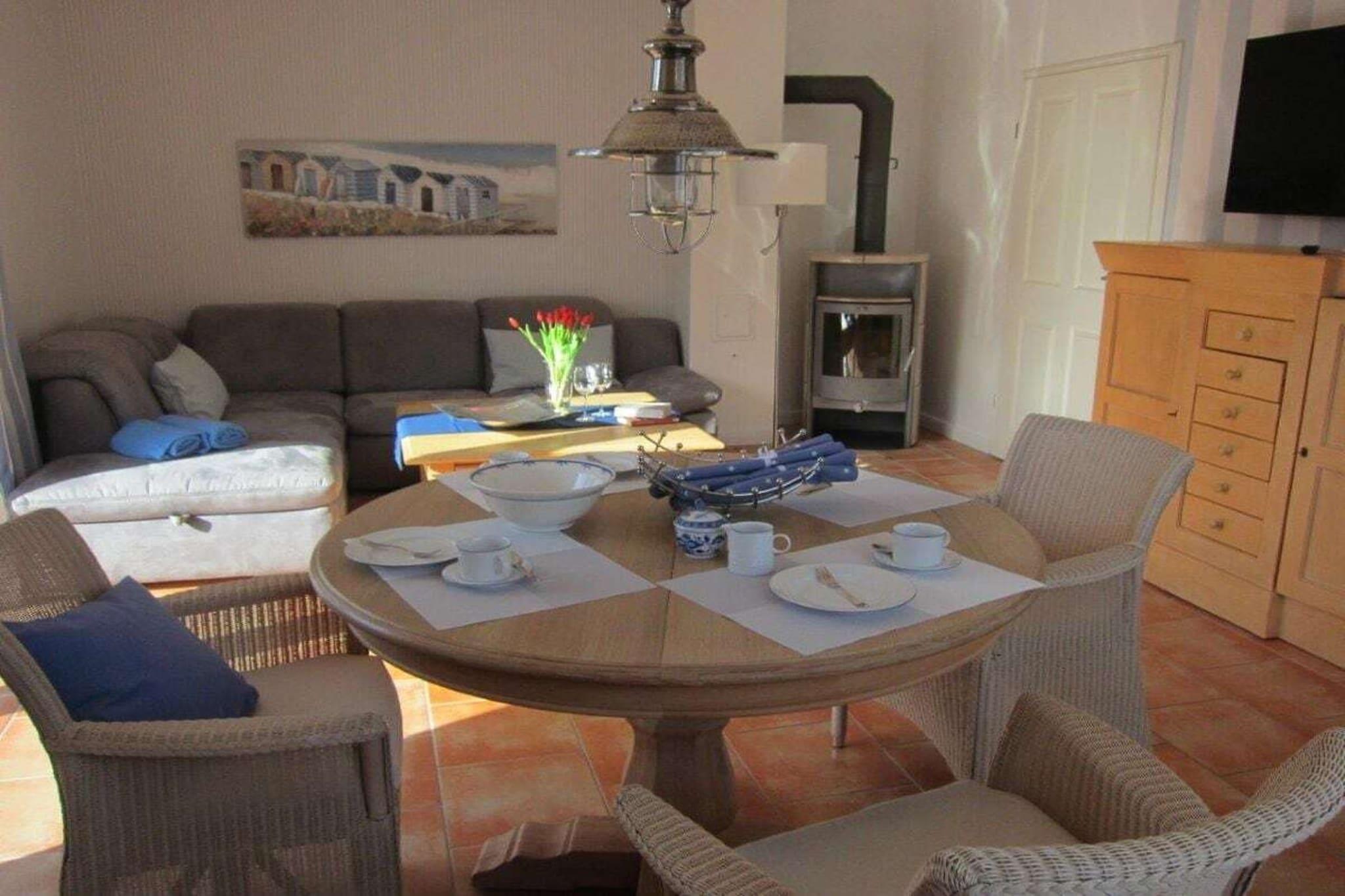 Neue hochwertige Ferienwohnung mit nordischer Behaglichkeit. Maritime Gemütlichkeit in weiß / blau und massiven Pinienmöbeln. Diese exklusive, rollstuhlgerechte Ferienwohnung bietet alle Annehmlichkeiten für bis zu 4 Personen mit oder ohne Handicap, damit sich unsere Gäste vom ersten Moment an wohlfühlen. Der helle Wohn- und Essbereich lässt es an nichts fehlen. Um den massiven runden Pinientisch laden bequeme Loomchairs zum Verweilen ein. Die moderne Hochglanzküche ist mit Spülmaschine, Dunstabzugshaube, Backofen, Kaffekapselmaschine, Kaffeefiltermschine, WMF Töpfen und reichlich Küchenutensilien ausgestattet. Ihnen steht hochwertiges Porzellan der Marken "Friesland" kleine Brise und "Hutschenreuther" Zwiebelmuster sowie Gläser von Leonardo zur Verfügung. Eine komfortable Eckgarnitur und der großen Flachbild-Smart-TV laden zum Entspannen ein. Ein weiteres Highlight ist der Kaminofen. Sie finden Spiele- und Bücherauswahl vor. Von der Wohnstube gelangen Sie direkt auf die Terrasse. Diese bietet hochwertige Flechtmöbel und Sonnenliegen. Die 70 m² große Erdgeschosswohnung hat 2 geräumige Schlafzimmer. Die Betten haben die Komfortgröße 180 x 200 cm. Große Schränke bieten ausreichend Stauraum. Schlafzimmer II ist lichtdurchflutet und mit maritimen Flair. Von hier können Sie direkt auf die Terrasse treten. Eine kleine Sitzgruppe und ein 2. Flachbild-TV bieten ideale Vorraussetzungen für Rückzugsmomente. Das Schlafzimmer I ist in dezenten Grautönen eingerichtet. Eine kleines Ledersofa sorgt für zusätzliche Gemütlichkeit. Die Ferienwohnung bietet ein großes Bad mit bodengleicher Dusche. Ein 2. separates WC liegt für die Hausgäste im Treppenhausbereich.