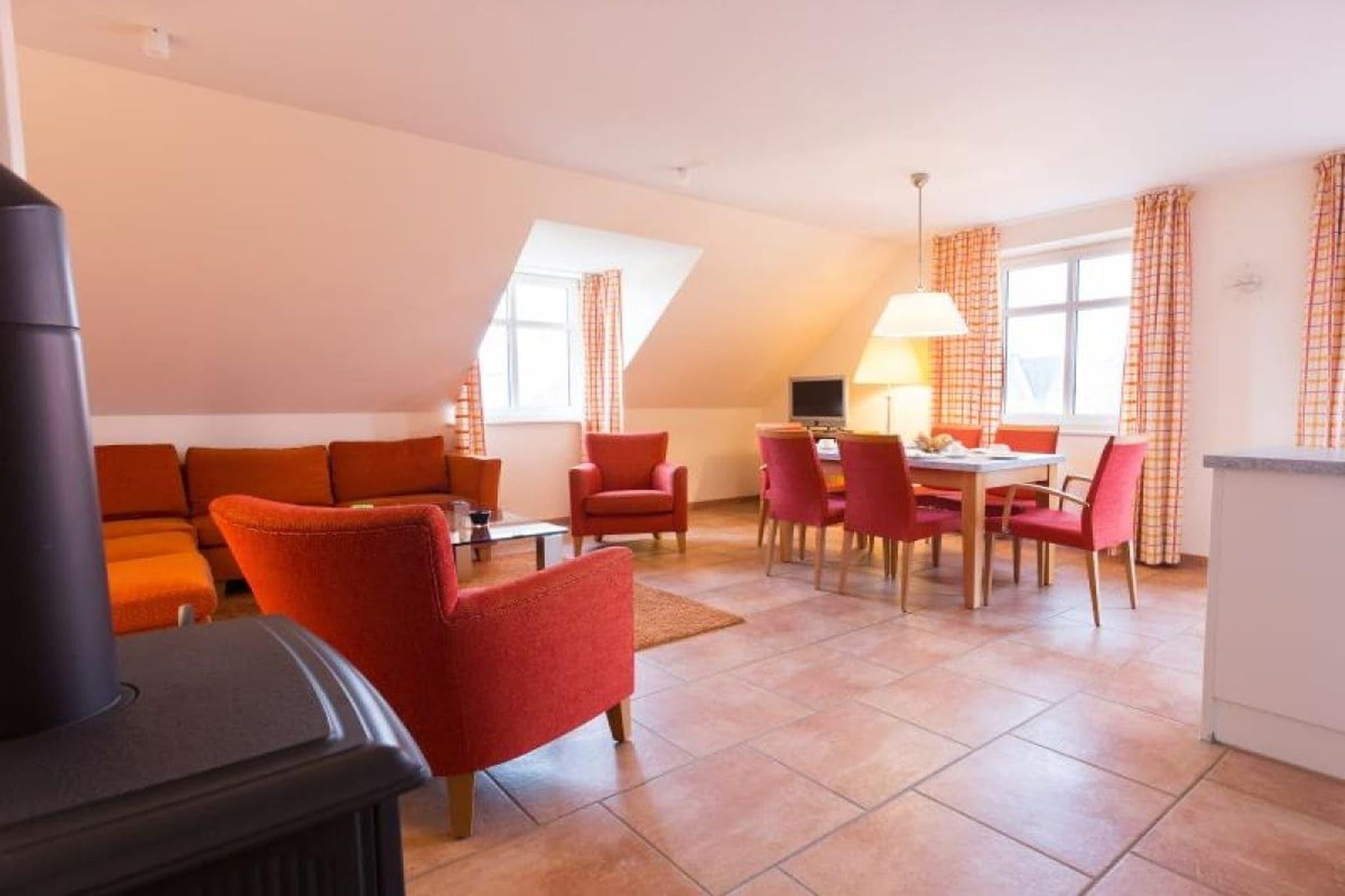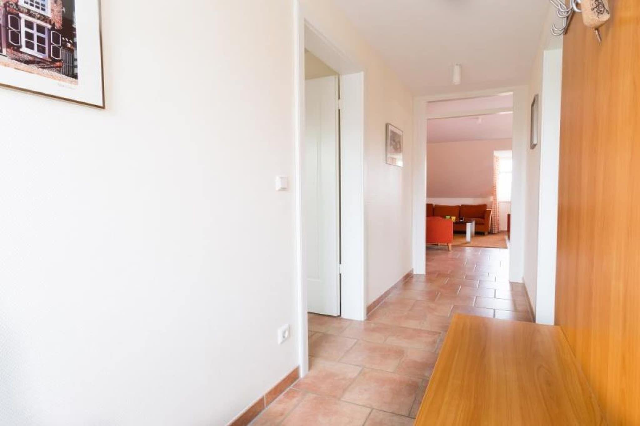 Das im Obergeschoss gelegene Apartment Pilsum ist sehr stilvoll und großzügig eingerichtet und verfügt über 3 Schlafzimmer. Zum Wohnkomfort gehören Flachbild-TV im Wohnbereich und in einem Schlafzimmer, kostenfreies WLAN, Radio, DVD. Ein Kaminofen sorgt für Gemütlichkeit und romantische Stimmung in der kalten Jahreszeit ( Holz auf Wunsch ) Die Küche ist sehr gut ausgestattet und verfügt über eine Spülmaschine, Cerankochfeld, Mikrowelle, Heißwasserkocher, Kaffeemaschine und Toaster. Die 3 Bäder sind edel eingerichtet und verfügen jeweils über eine Dusche oder Badewanne. Selbstverständlich sind hier Föhn und Kosmetikspiegel vorhanden. Das Apartment hat einen großen Balkon und im Garten eine Terrasse mit einem Strandkorb in direkter Wasserlage zur alleinigen Nutzung. Am hauseigenen Bootssteg befinden sich zwei Ruderboote, die an allen ungeraden Tagen genutzt werden können. Eine Sauna mit Liegestühlen und Blick nach draußen steht für eine geringe Gebühr zur Verfügung.