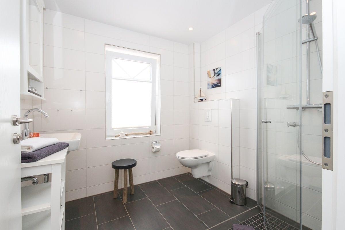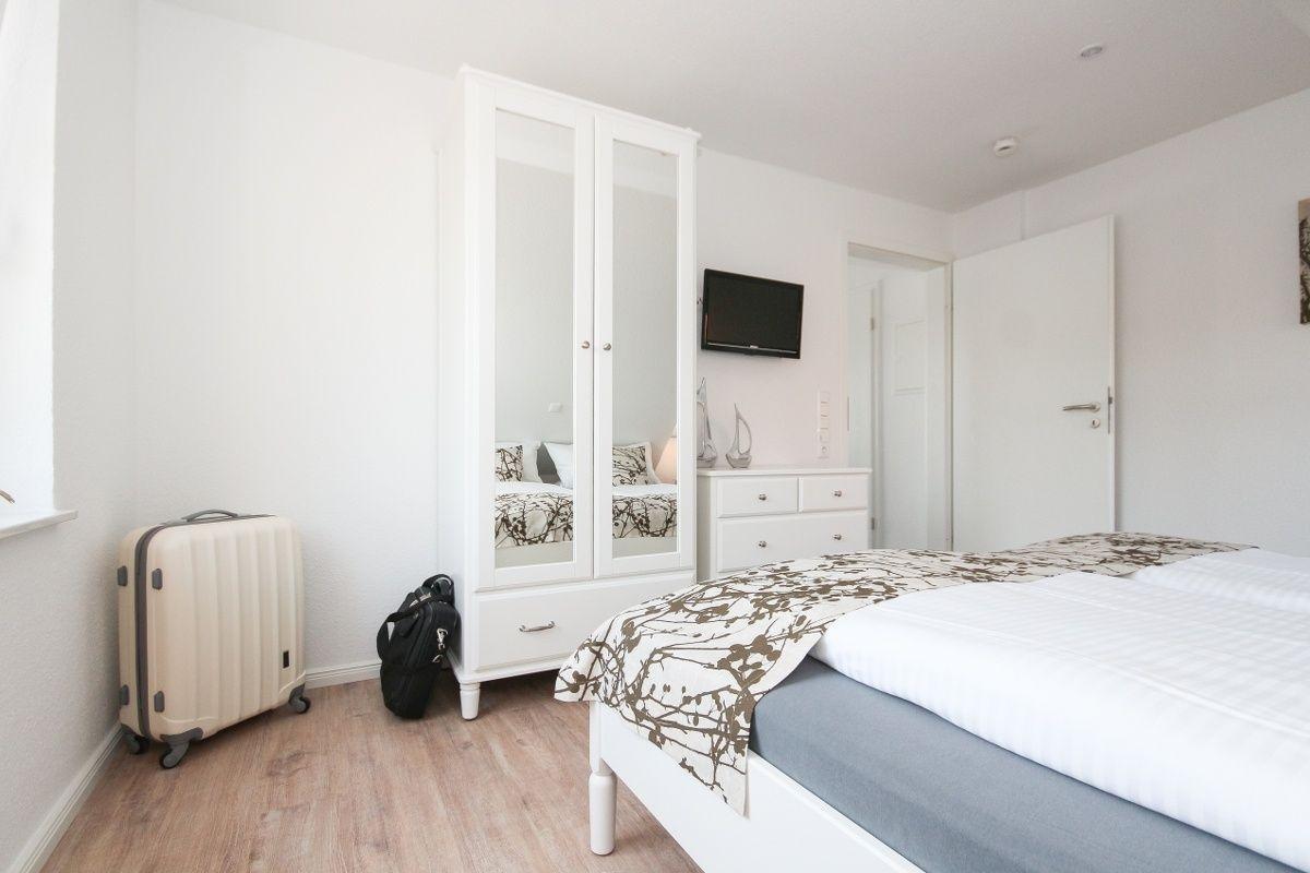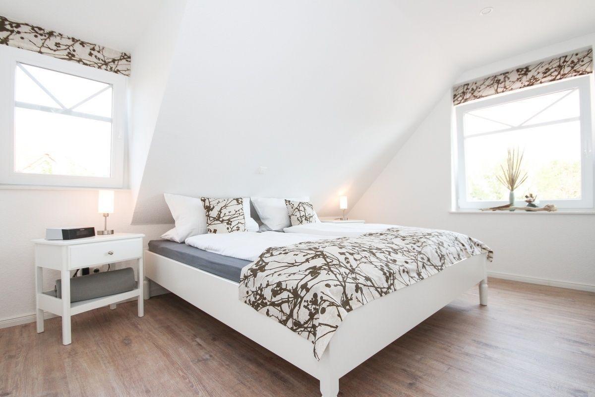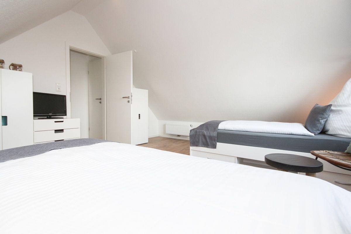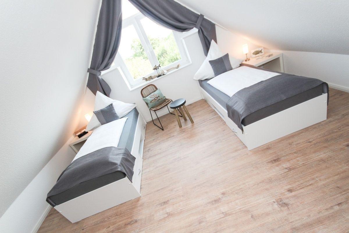 Im ersten Schlafzimmer, das über zwei Fenster mit frischer Nordseeluft versorgt wird, befindet sich ein Doppelbett. Das zweite Schlafzimmer mit zwei Einzelbetten ist im Dachgeschoss untergebracht.