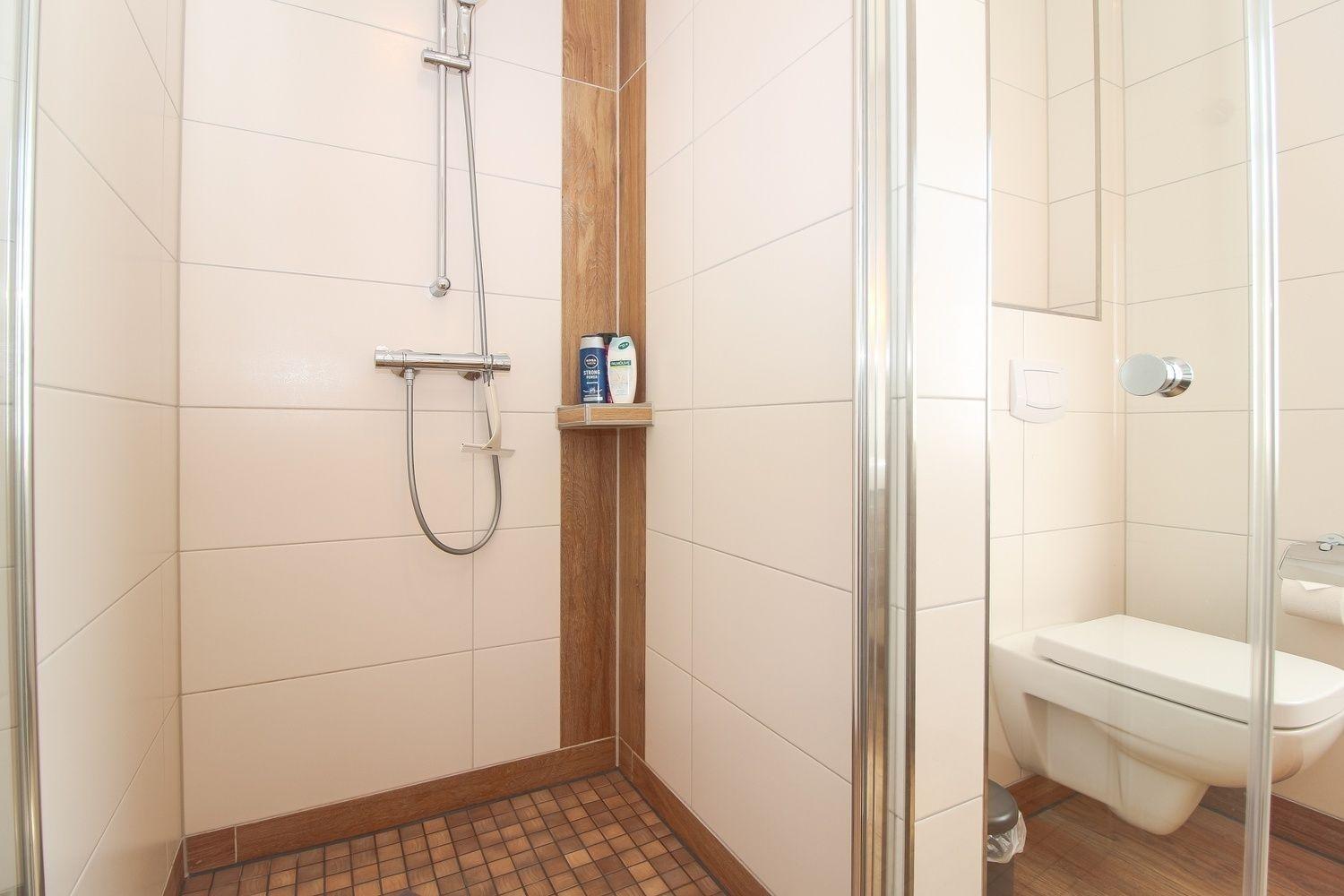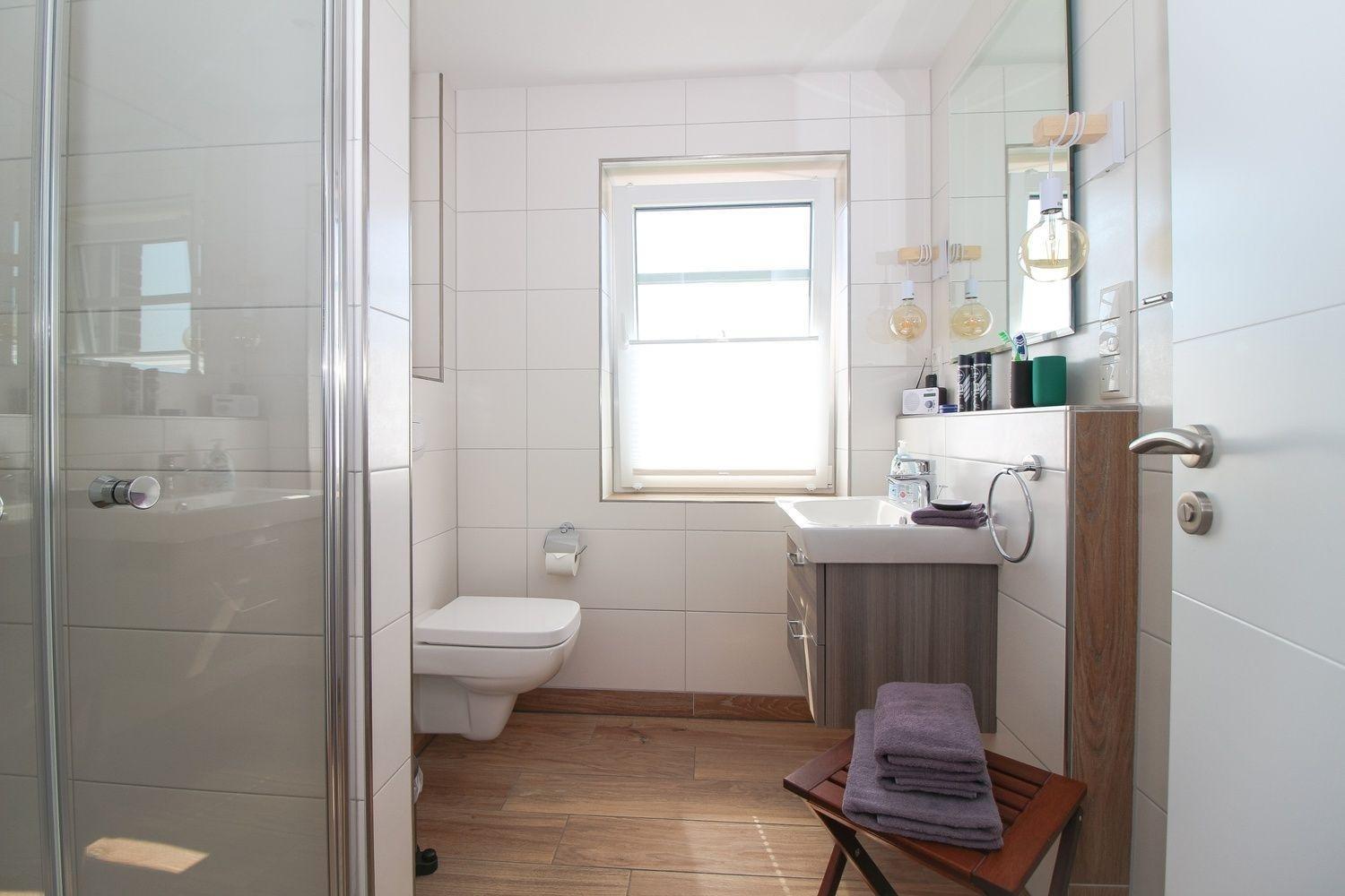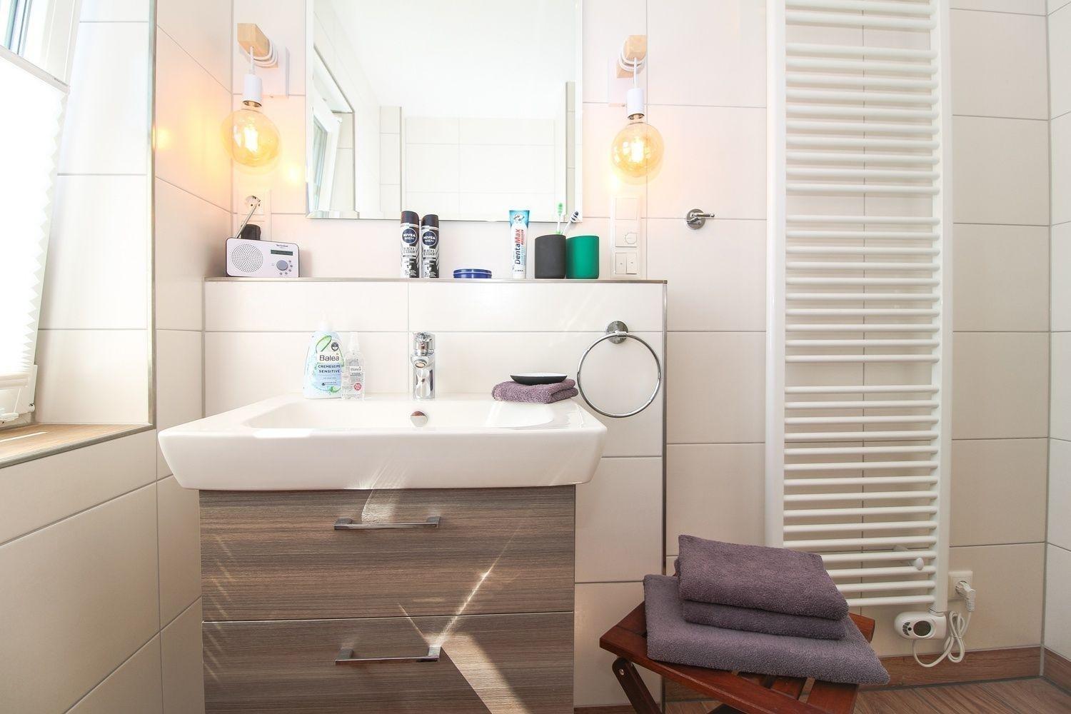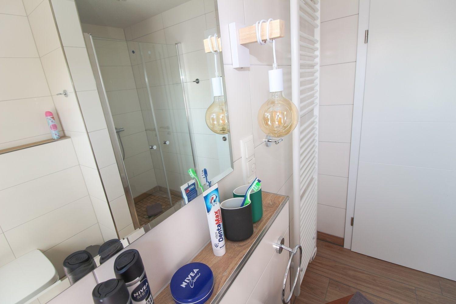 Im Bad befinden sich eine bodentiefe Dusche, WC und Waschtisch mit Unterschrank - alles ist vorhanden. Der Handtuchwärmer schenkt an kalten Tagen warme Handtücher.