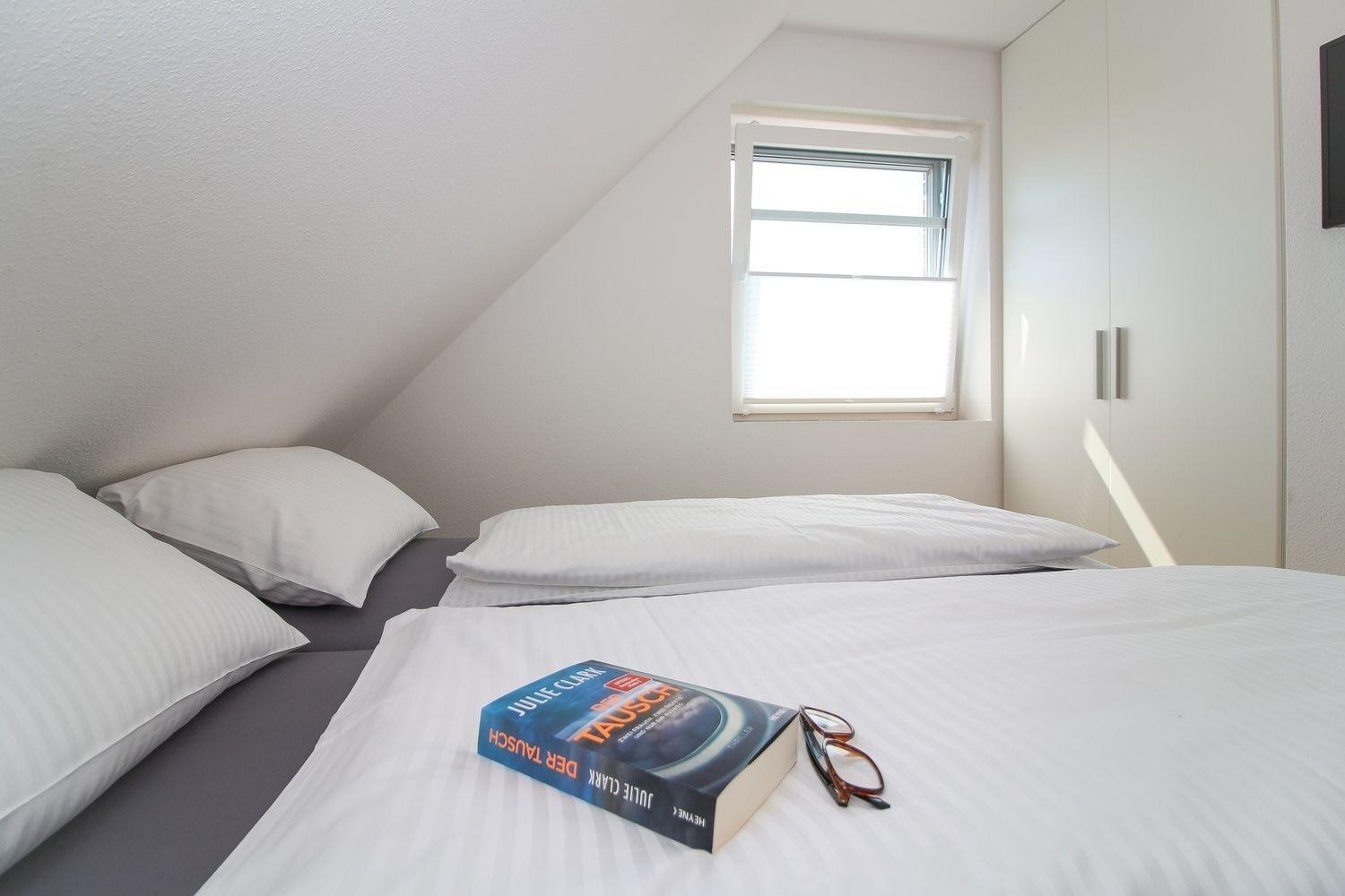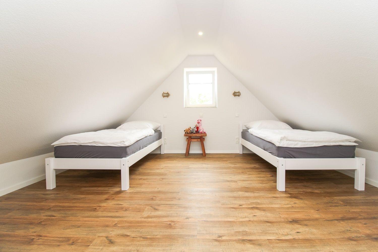 Das zweite Schlafzimmer befindet sich im Dachgeschoss. Dort befinden sich zwei Einzelbetten und zwei Kommoden. Auch hier ist ein Flachbild-TV vorhanden. Weiterhin wurde im Dachgeschoss an einen kleinen Abstellraum gedacht.