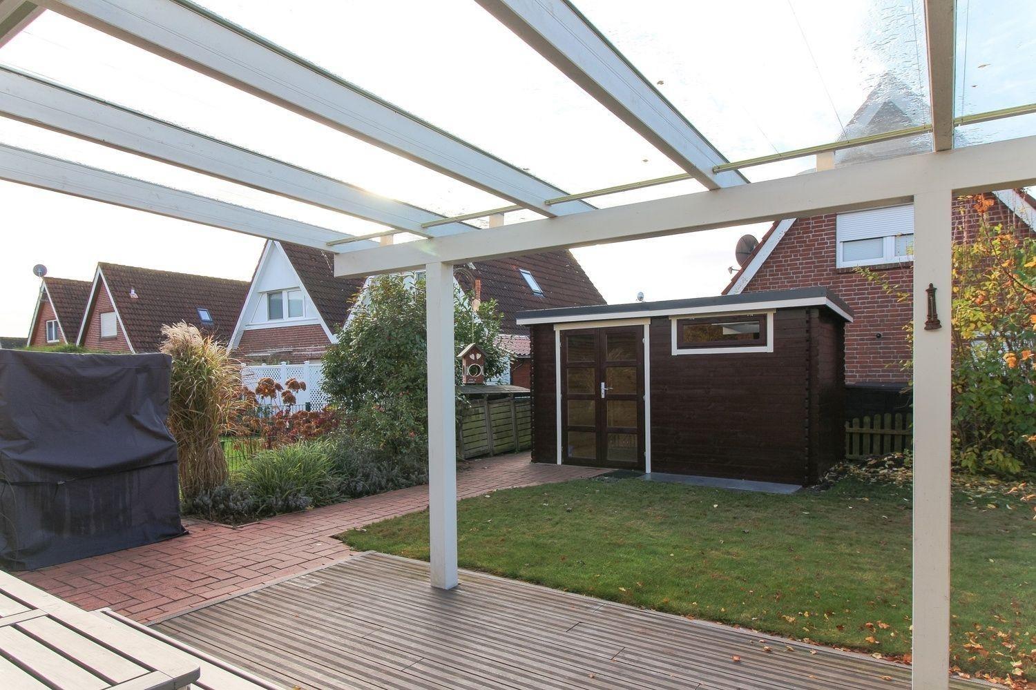 Die Terrasse mit Garten liegt hinter dem Haus und ist von der Straße aus nicht einsehbar.
