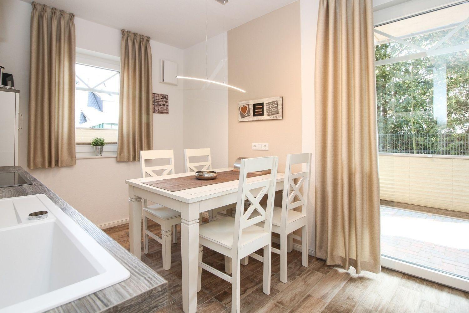 Im Wohn-/Essbereich befindet sich eine sehr gut ausgestattete Küchenzeile. Neben der Terrasse, die sich vor dem großem, lichtverwöhnten Fensterelement befindet, können Sie auch in einer geschützten Rückzugsecke auf der zweiten Terrasse die Greetsieler Frischluft genießen.