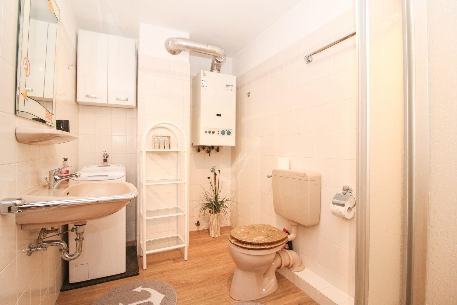 Für den großen Balkon der Wohnung (12 qm) auf der Südseite stehen Gartenmöbel zur Verfügung. Vor dem Haus befinden sich der eigene PKW-Stellplatz und ein separater Fahrradschuppen.
