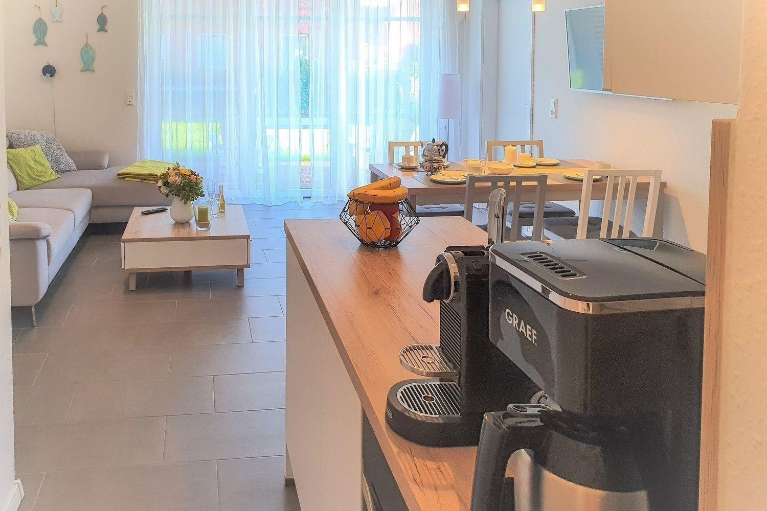 Moderne Ferienwohnung in Greetsiel mit Terrasse, Garten, Ladesäule und hochwertiger Ausstattung für entspannte Urlaubstage.