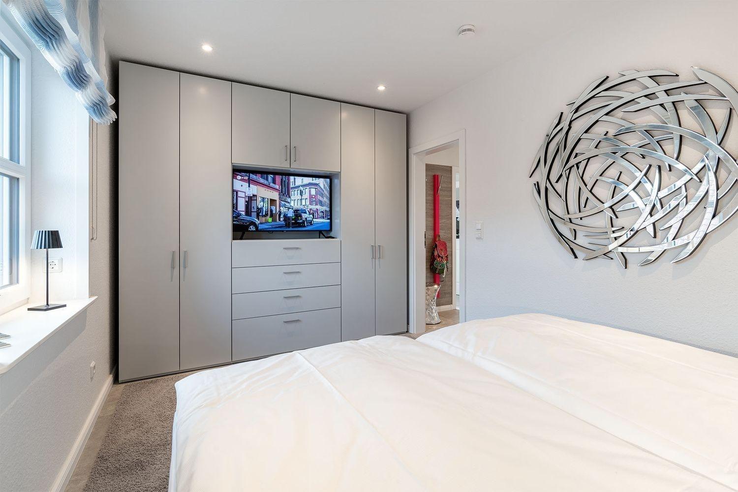 Das Schlafzimmer verfügt über ein Boxspringbett (180x200 cm) mit handgefertigten Matratzen in 2 Härtegraden, Topper von TRECA, Paris sowie Bettdecken und -kissen (inkl. speziellem Nackenkissen) von Fischbacher, St-Gallen, Schweiz für alle, die besonderen Wert auf einen guten und erholsamen Schlaf legen. Ein großer Einbauschrank bietet viel Stauraum und einen integrierten 2. Fernseher (Samsung, 43 Zoll).