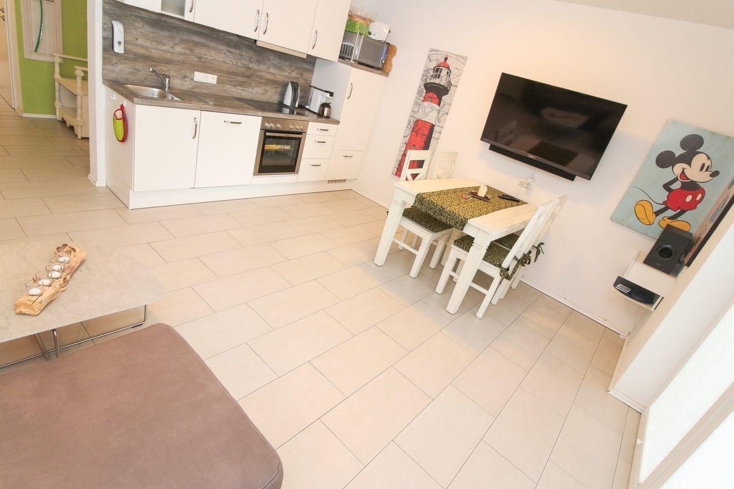 Der Wohn- und Essbereich stellt mit der vollständig ausgestatteten Küchenzeile den Dreh- und Angelpunkt der Ferienwohnung dar.